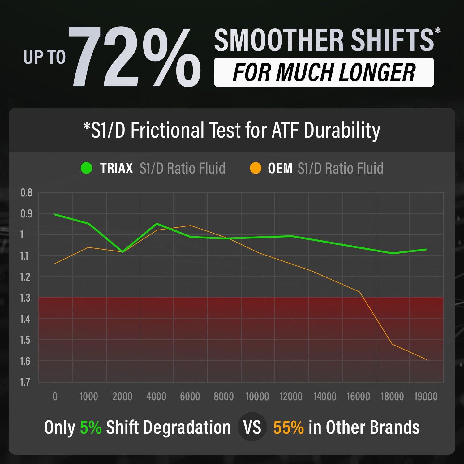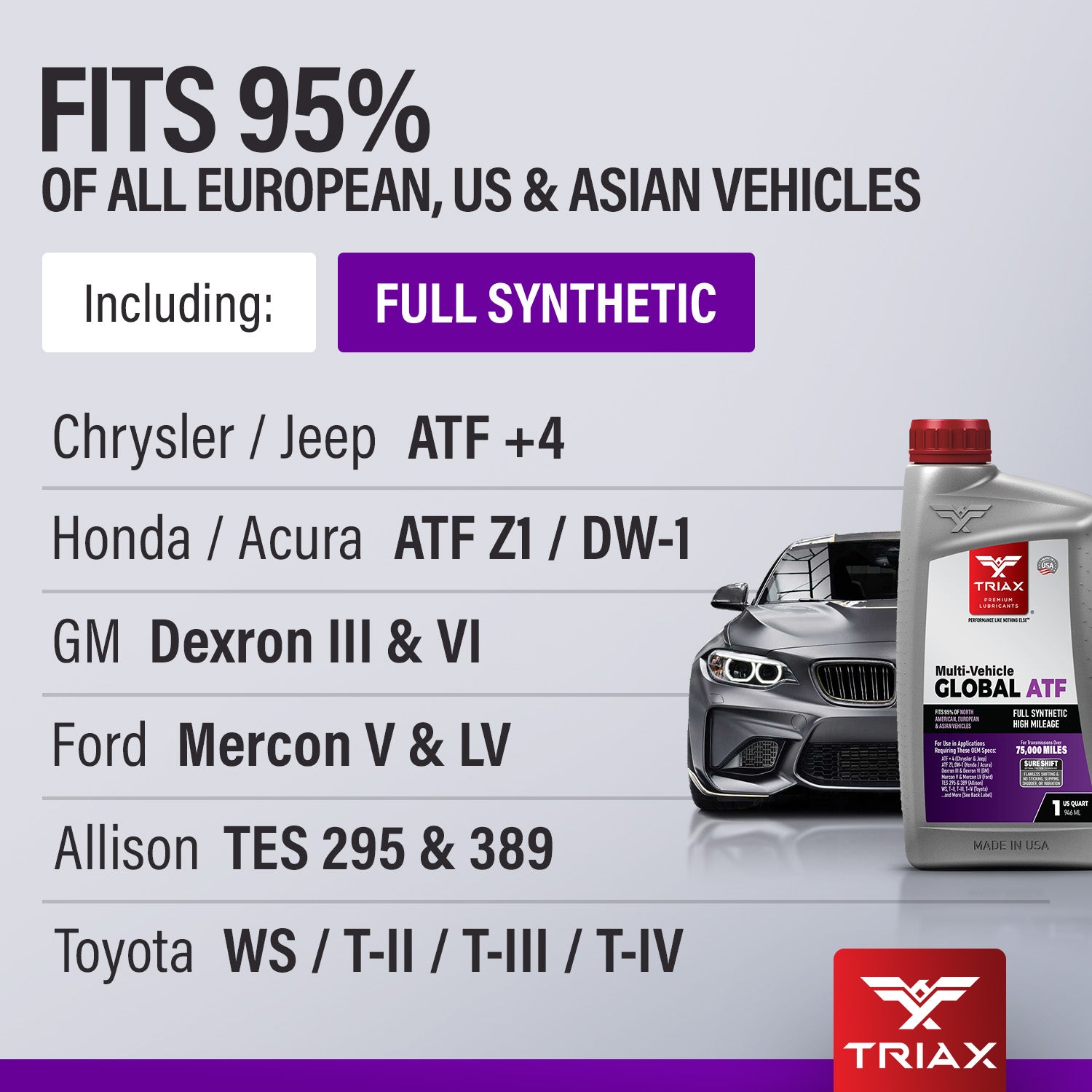 TRIAX Multi-Vehicle Global ATF Synthetic is an advanced multi-vehicle high performance ATF designed with the largest specification range possible. It's a very robust formulation for maximum performance in 98% of all automatic transmissions of North American, European, and Asia-Pacific-made vehicles. It provides exceptional oxidation, wear, frictional stability, sludge and deposit prevention, and anti-shudder properties required in today’s high performance transmissions. It is also designed to deliver excellent performance in older transmissions, far superior to older spec fluids.