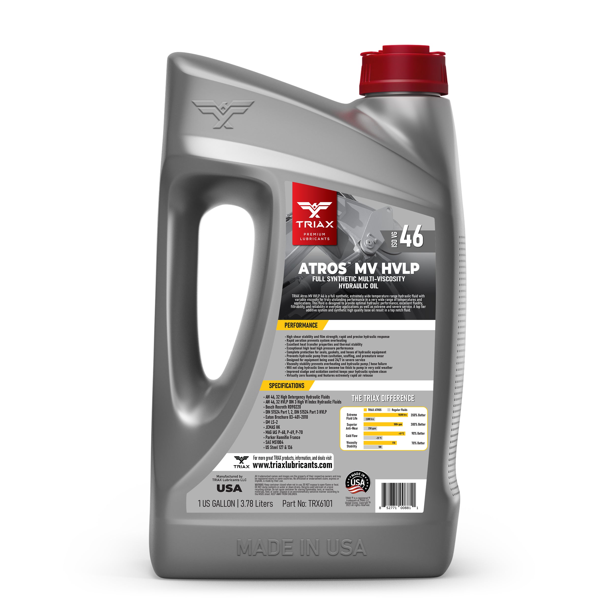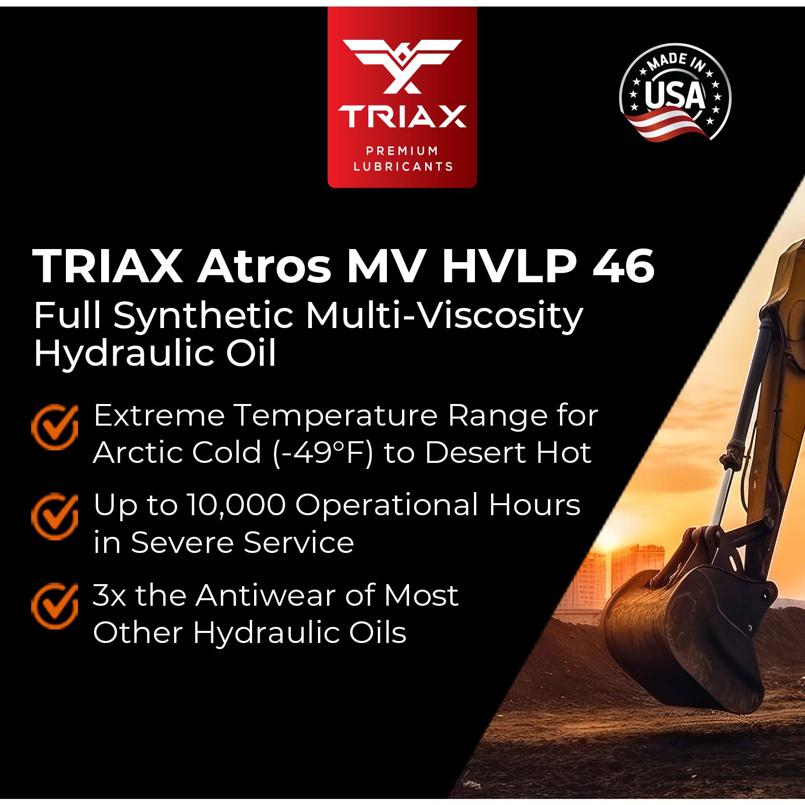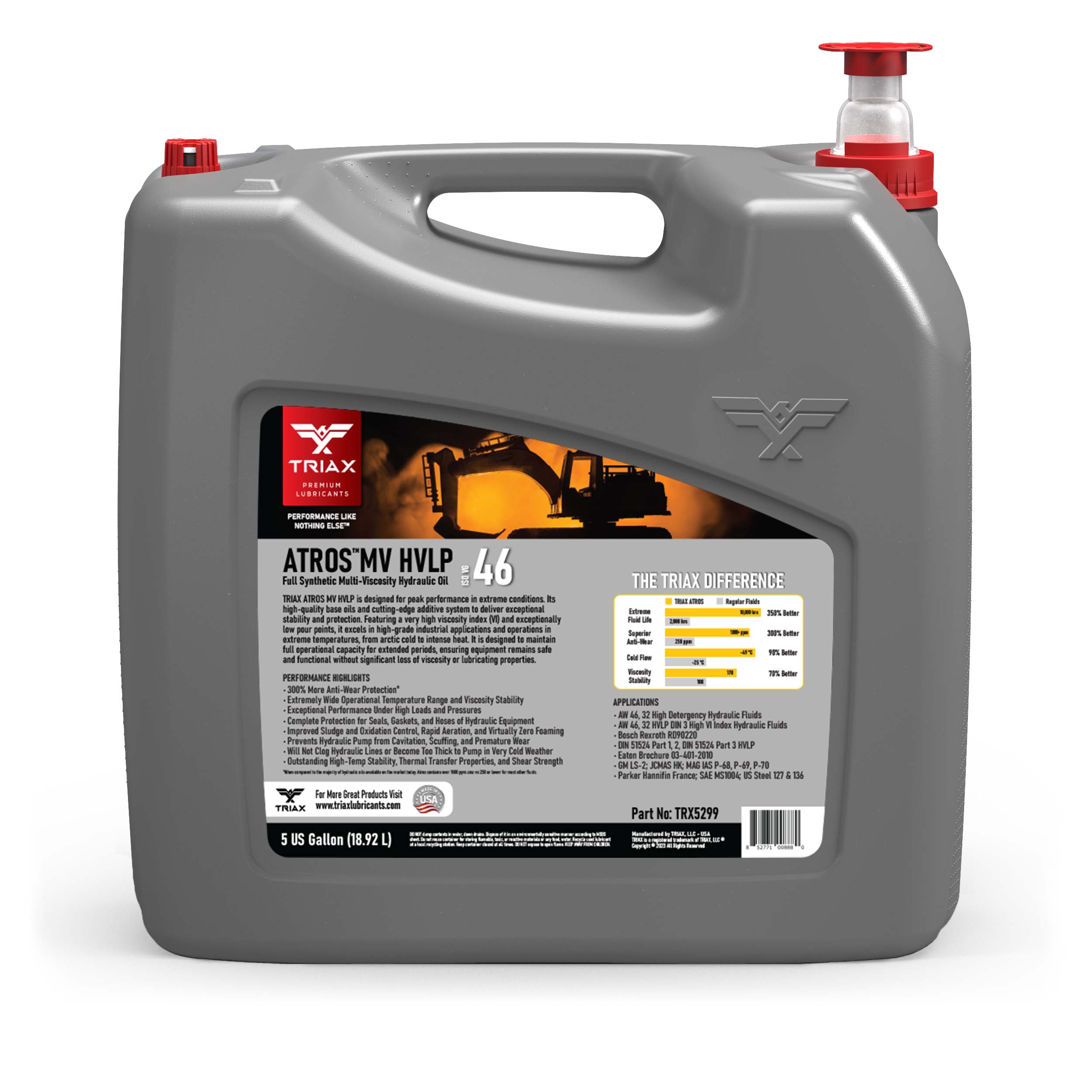 TRIAX ATROS MV HVLP is a full synthetic hydraulic fluid designed for peak performance in extreme and demanding conditions. It delivers exceptional stability and protection, formulated with high-quality base oils and a cutting-edge additive system. Featuring a very high viscosity index (VI) and exceptionally low pour points, it excels in high-grade industrial applications and operations in extreme temperatures, from arctic cold to intense heat. Designed to maintain full operational capacity for extended periods, these fluids ensure that equipment remains safe and functional without significant loss of viscosity or lubricating properties. It is suitable for ISO VG 46 or 68 applications and is classified as an HVLP hydraulic fluid.