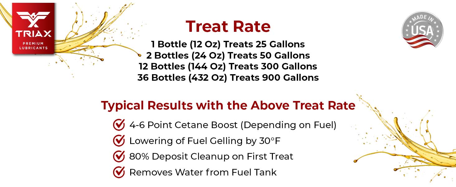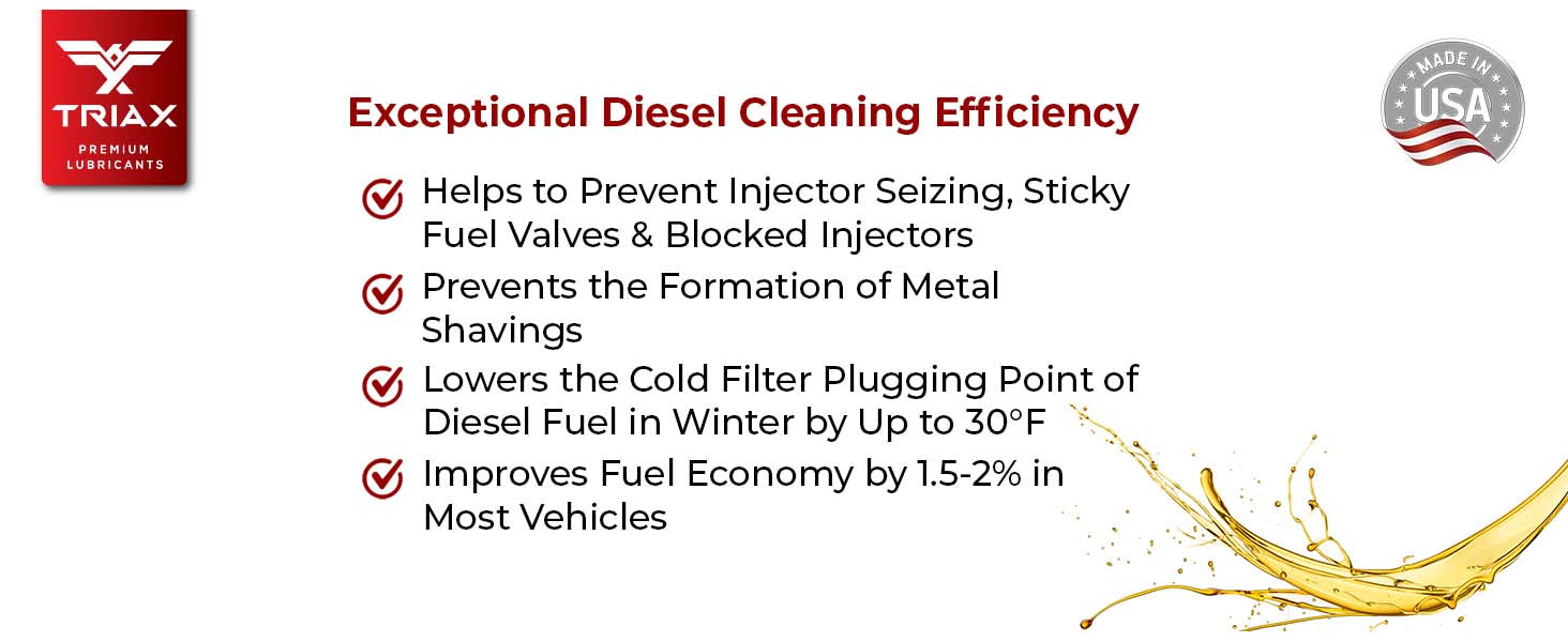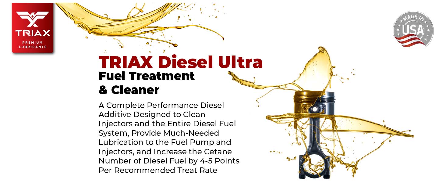 TRIAX Diesel Ultra Fuel Treatment is a complete performance diesel additive designed to clean injectors and the entire diesel fuel system, provide much needed lubrication to the fuel pump and injectors, while increasing the cetane number of diesel fuel by 4-5 points per recommended treat rate. TRIAX Diesel ULTRA provides sufficient lubricity to the diesel injection pump to help to counteract problems arising from the use of ULSD fuels. This added lubrication, significantly extends fuel system parts’ life such as injectors and diesel injection pumps.