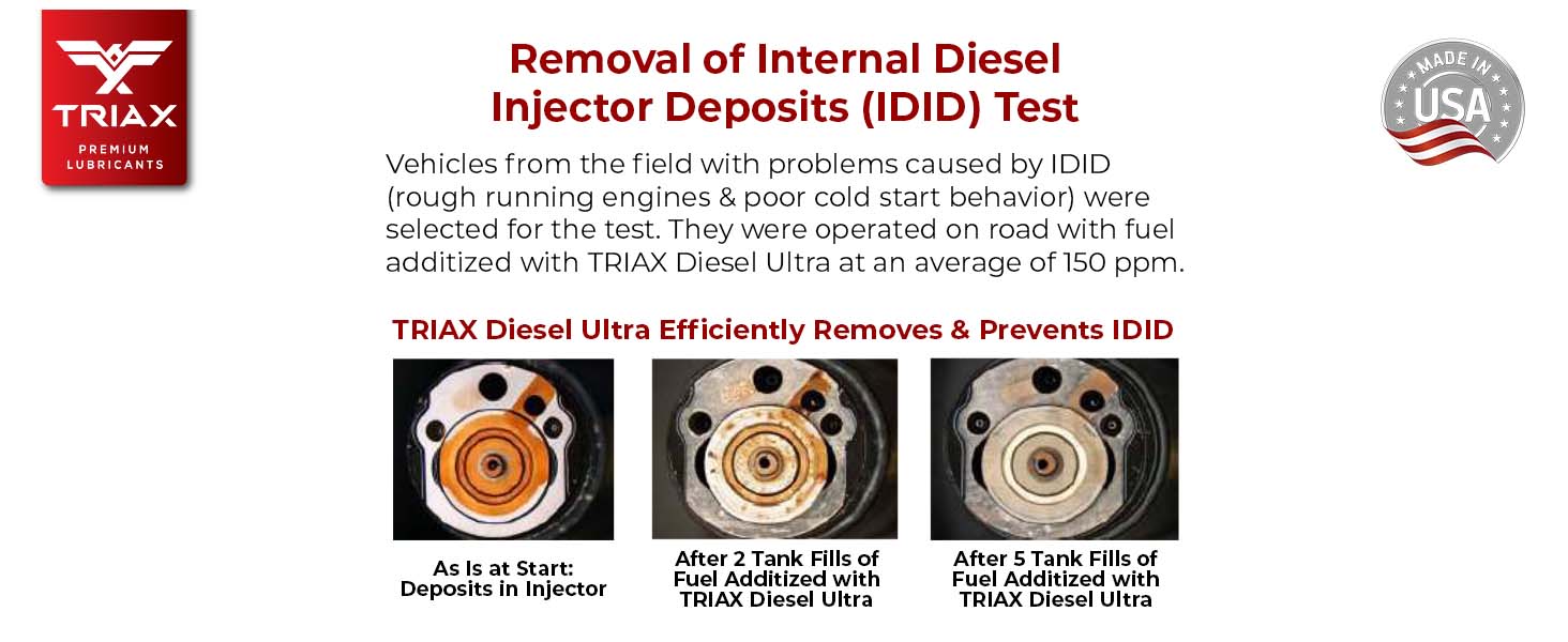 Removes/prevents internal (soapy) and external injector deposits in Common Rail diesel engines (IDID) clean-up and keep-clean performance)