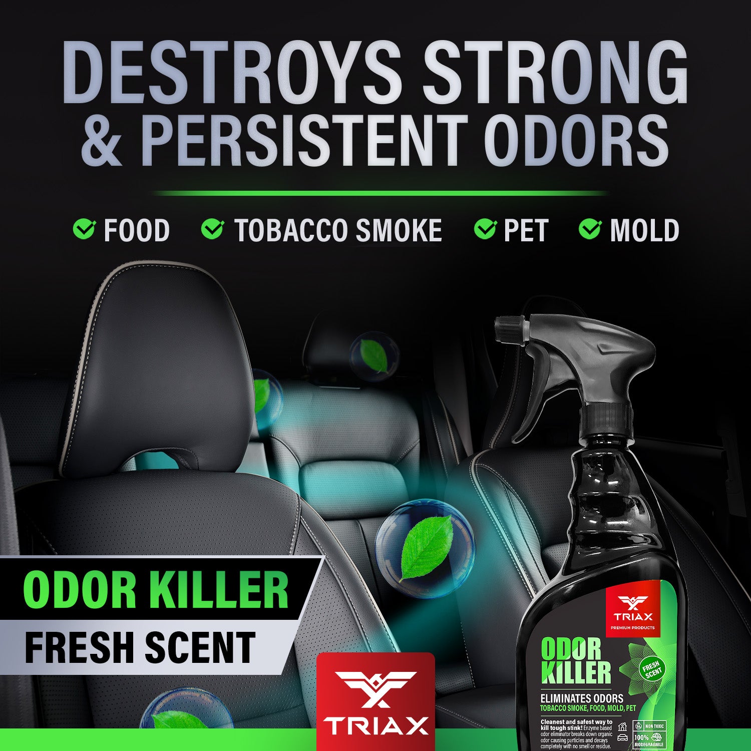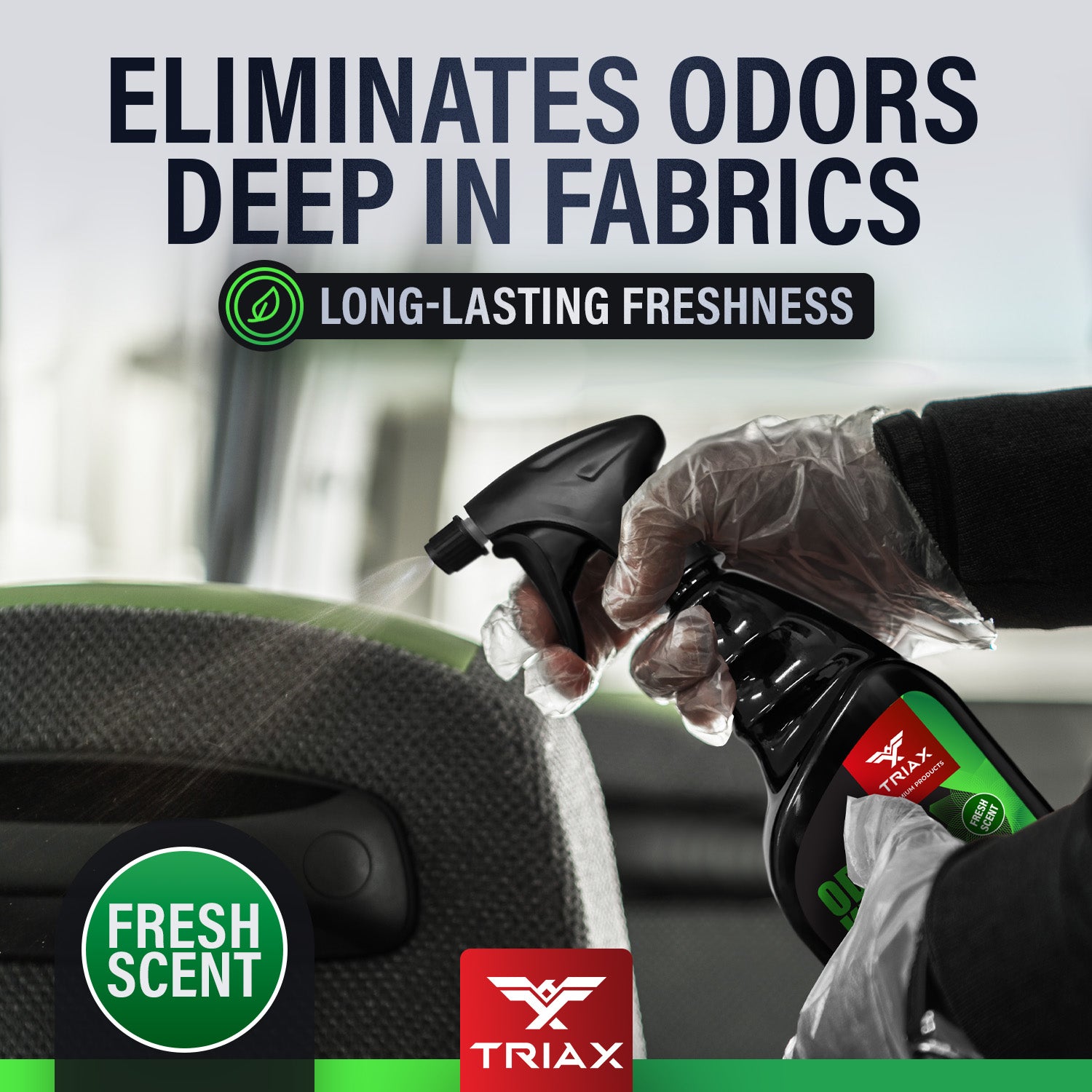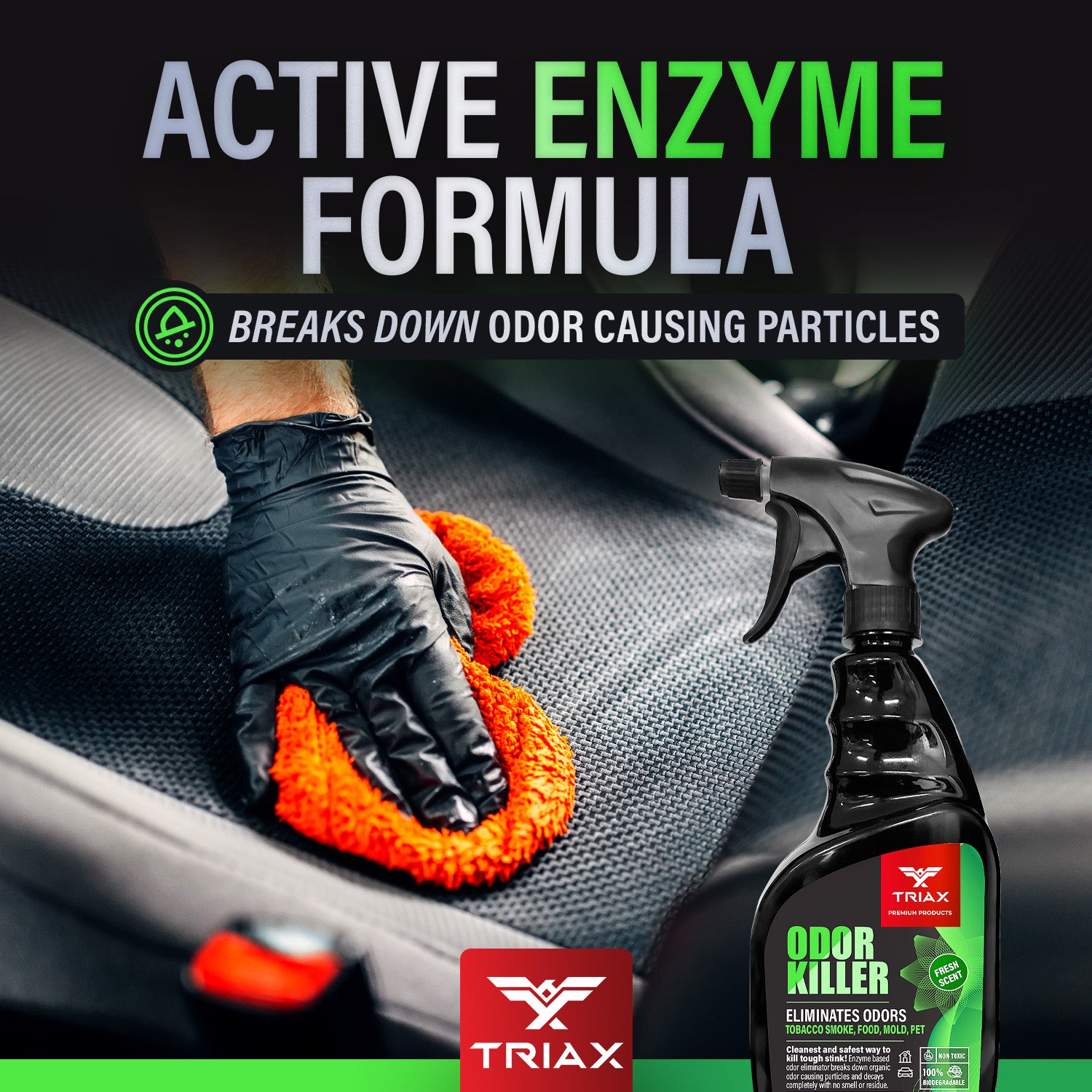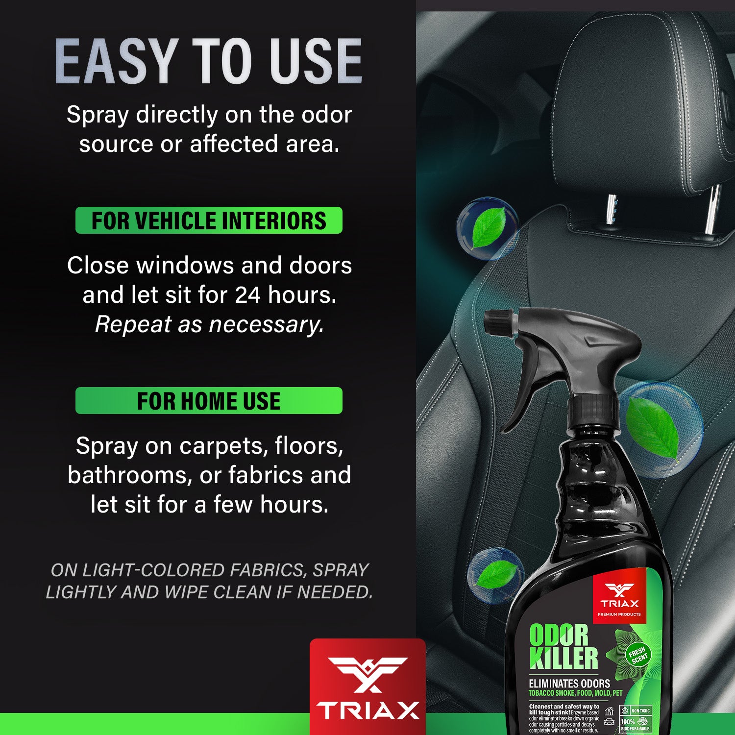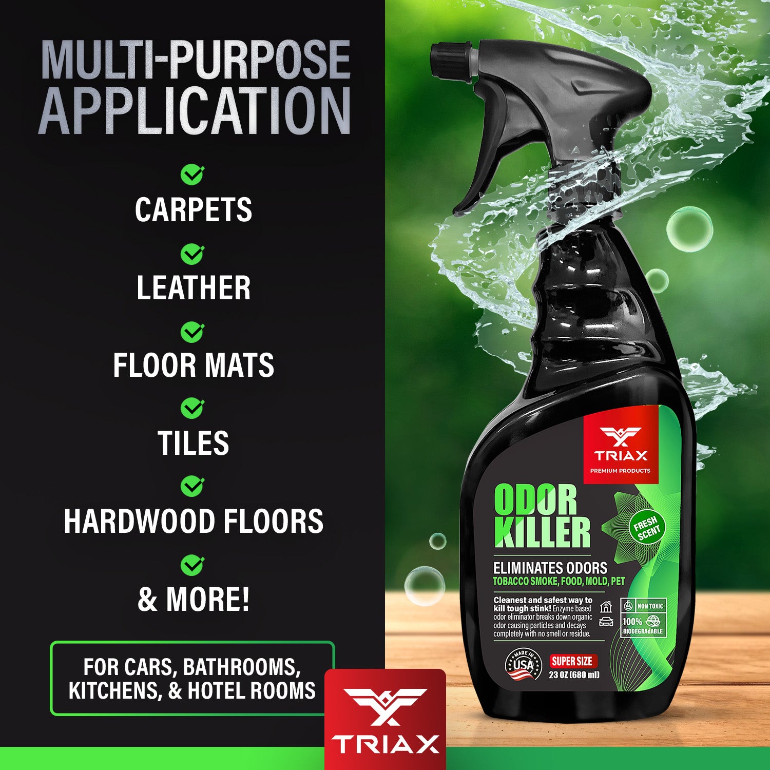TRIAX Odor Killer is a powerful, enzyme-based solution to eliminate unpleasant odors in your home or vehicle. Suitable for use on fabrics, carpets, and hard surfaces, it binds to odor-causing molecules, neutralizing them on contact. The naturally occurring microbes within the formula break down organic compounds into harmless, odorless byproducts like carbon dioxide and water, offering a fresh and long-lasting fragrance. Its gentle, minty "tracer scent" indicates where it has been applied and fades quickly, leaving only freshness behind. It is non-toxic, 100% biodegradable, and eco-friendly, making it a safe choice for spaces used by kids and pets.