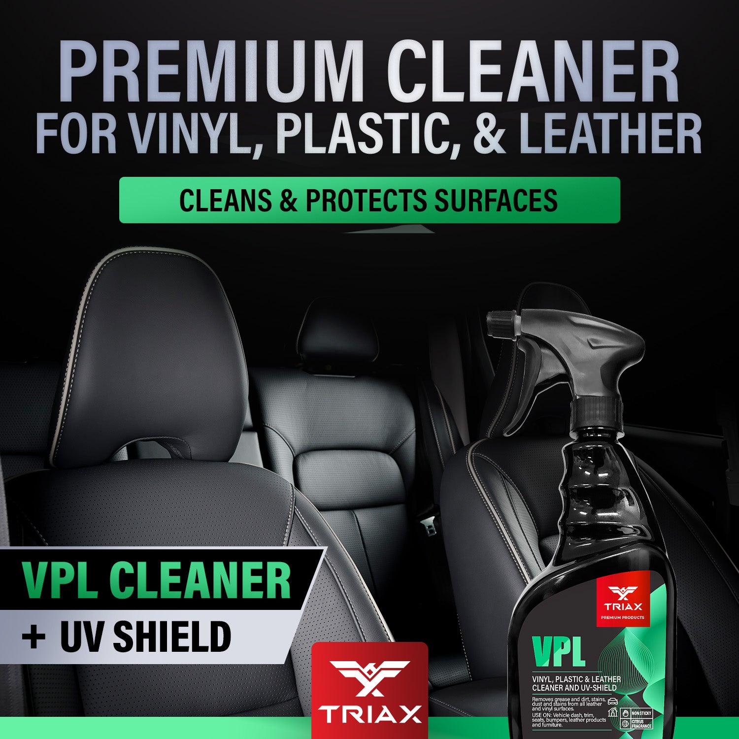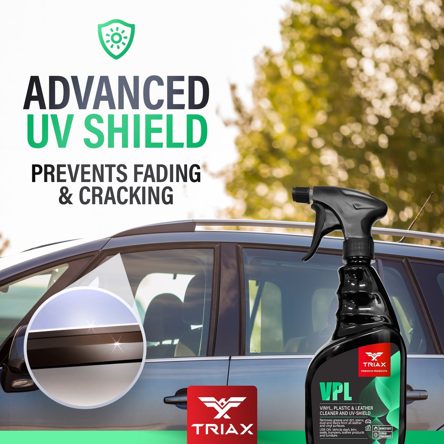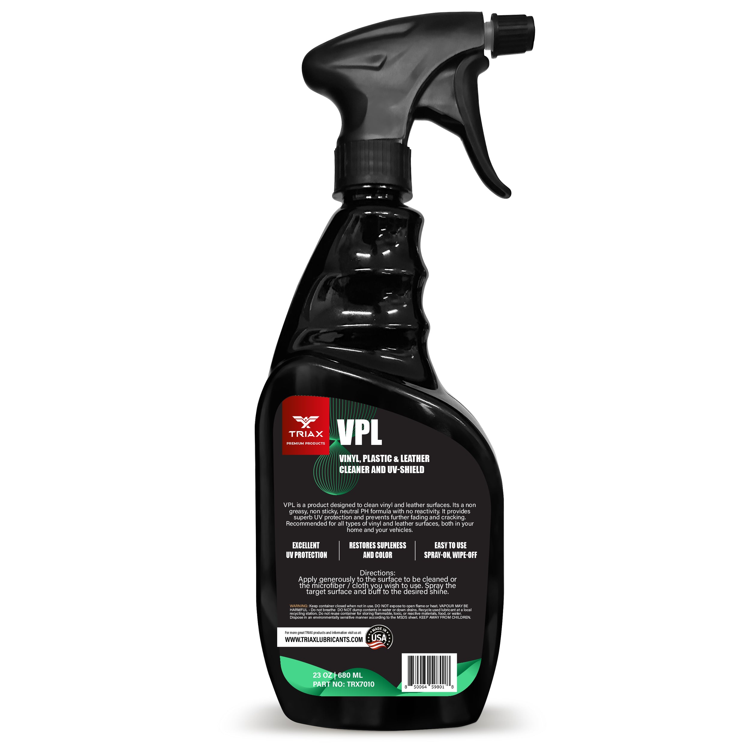 TRIAX VPL is a premium product designed to clean vinyl, plastic and leather surfaces. Its a non greasy, non sticky, neutral PH formulation with zero reactivity. It provides superb UV protection and prevents further fading and cracking. It is recommended for all types of vinyl, plastic and leather surfaces, both in your home and your vehicle.