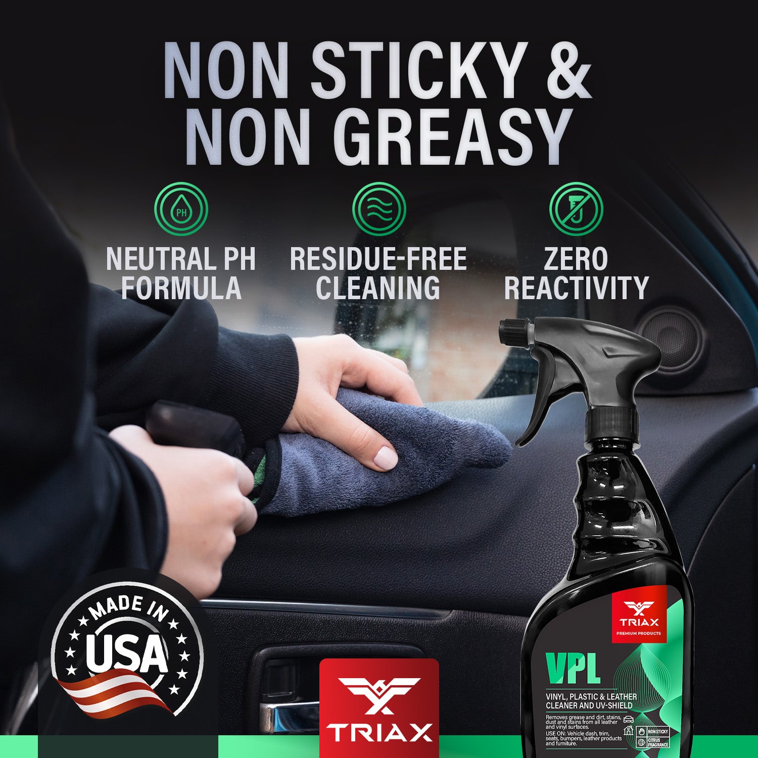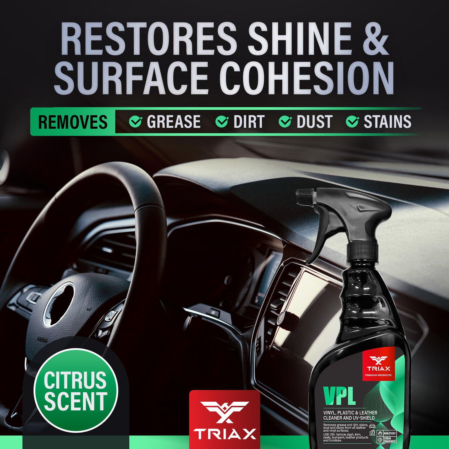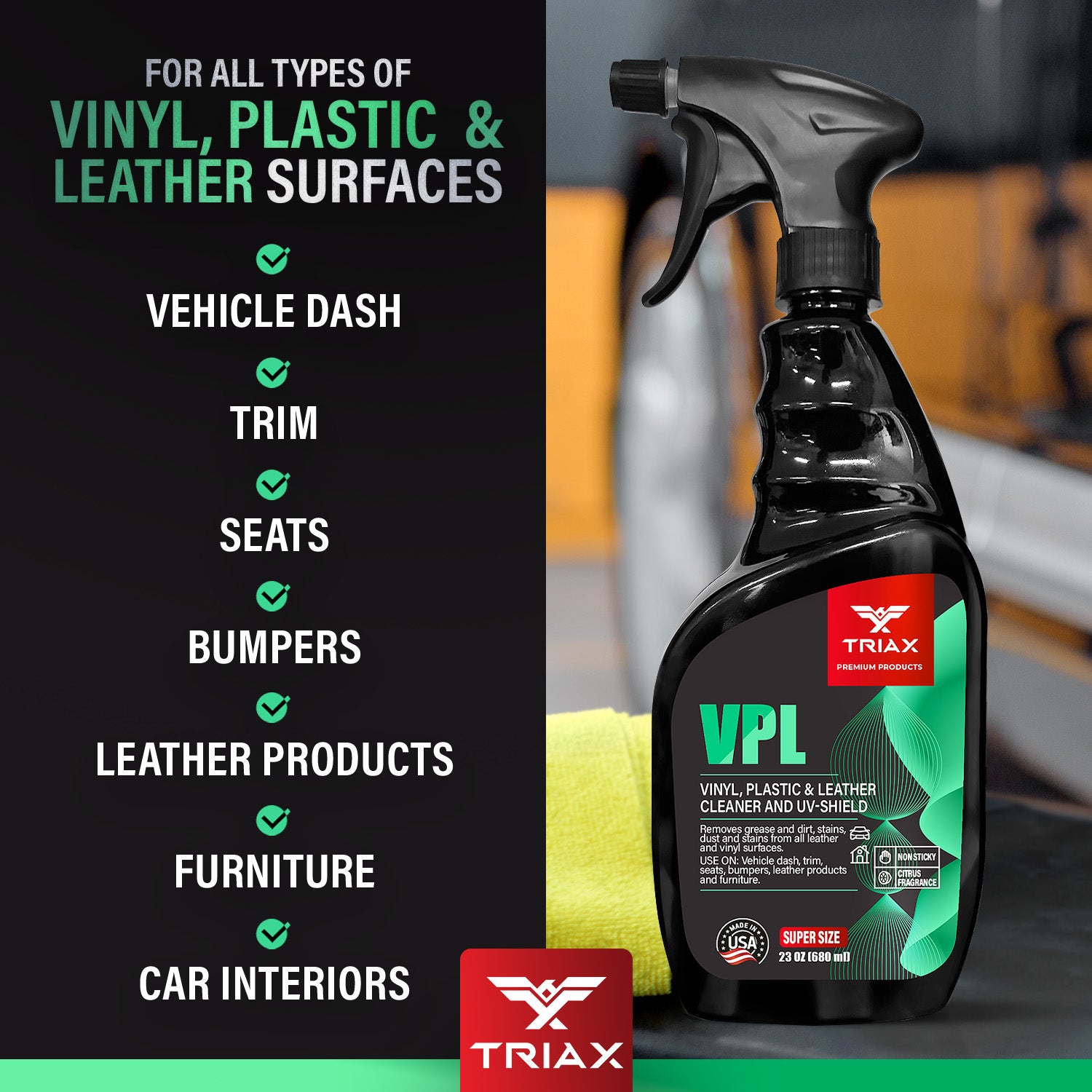 TRIAX VPL is a premium product designed to clean vinyl, plastic and leather surfaces. Its a non greasy, non sticky, neutral PH formulation with zero reactivity. It provides superb UV protection and prevents further fading and cracking. It is recommended for all types of vinyl, plastic and leather surfaces, both in your home and your vehicle.