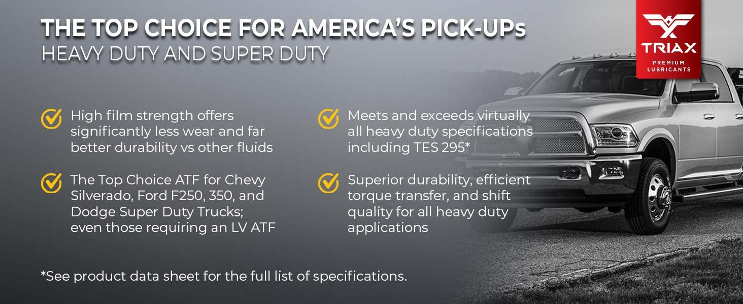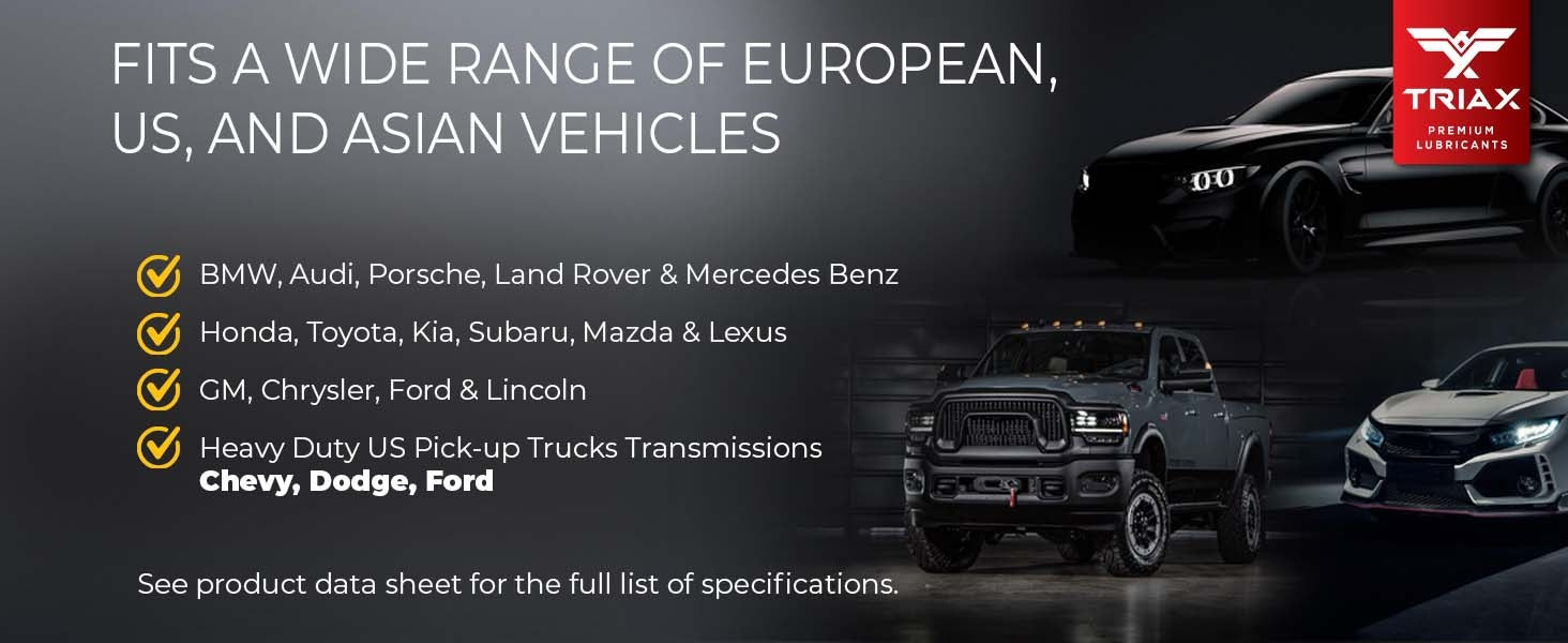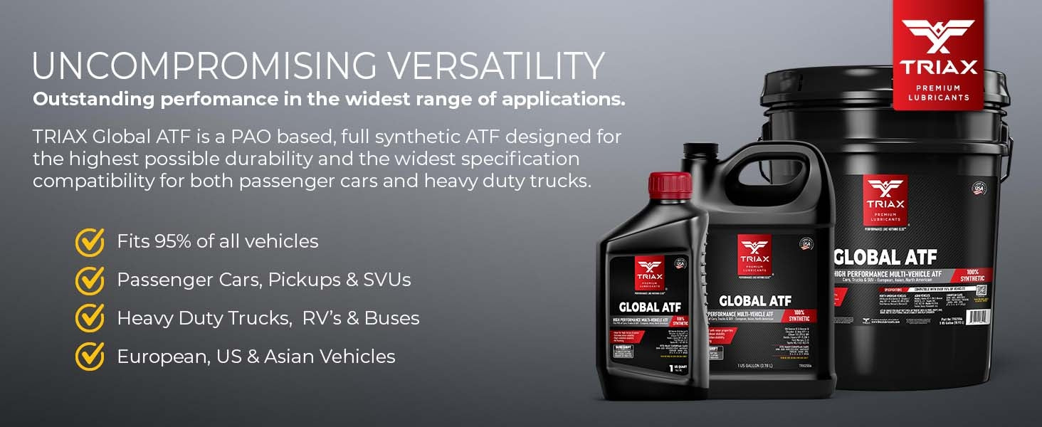 TRIAX Multi-Vehicle Global ATF Synthetic is an advanced multi-vehicle high performance ATF designed with the largest specification range possible. It's a very robust formulation for maximum performance in 98% of all automatic transmissions of North American, European, and Asia-Pacific-made vehicles. It provides exceptional oxidation, wear, frictional stability, sludge and deposit prevention, and anti-shudder properties required in today’s high performance transmissions. It is also designed to deliver excellent performance in older transmissions, far superior to older spec fluids.