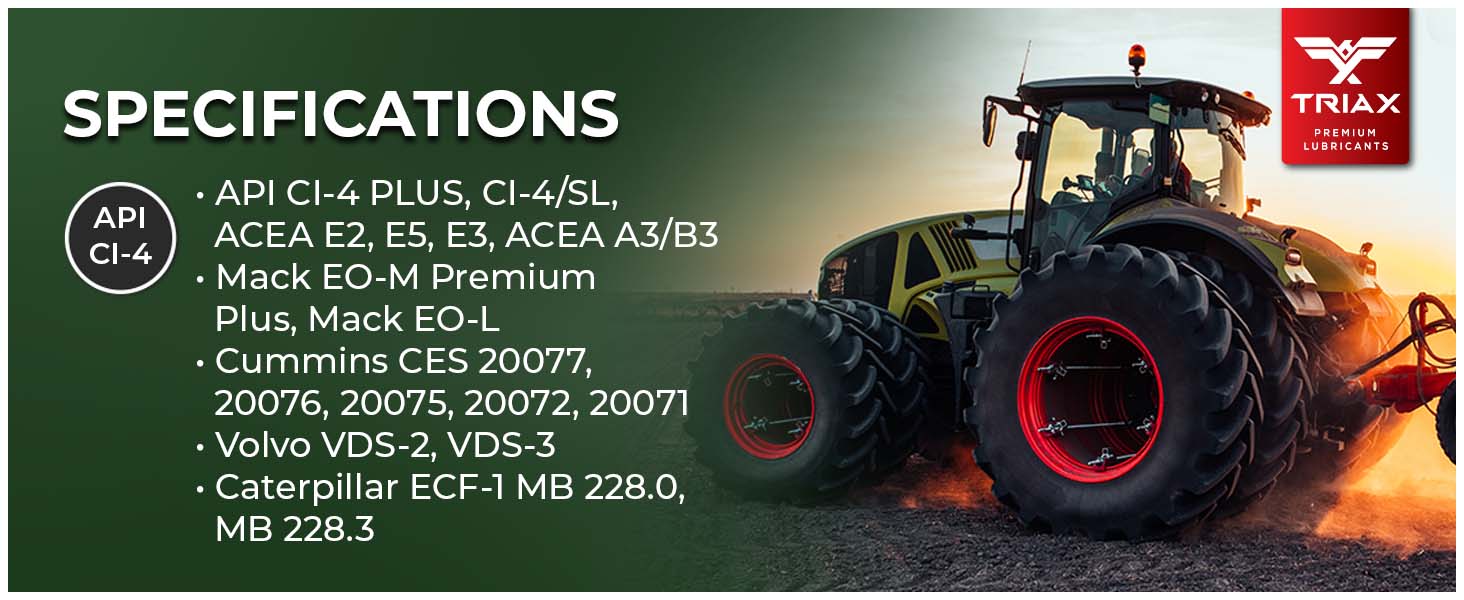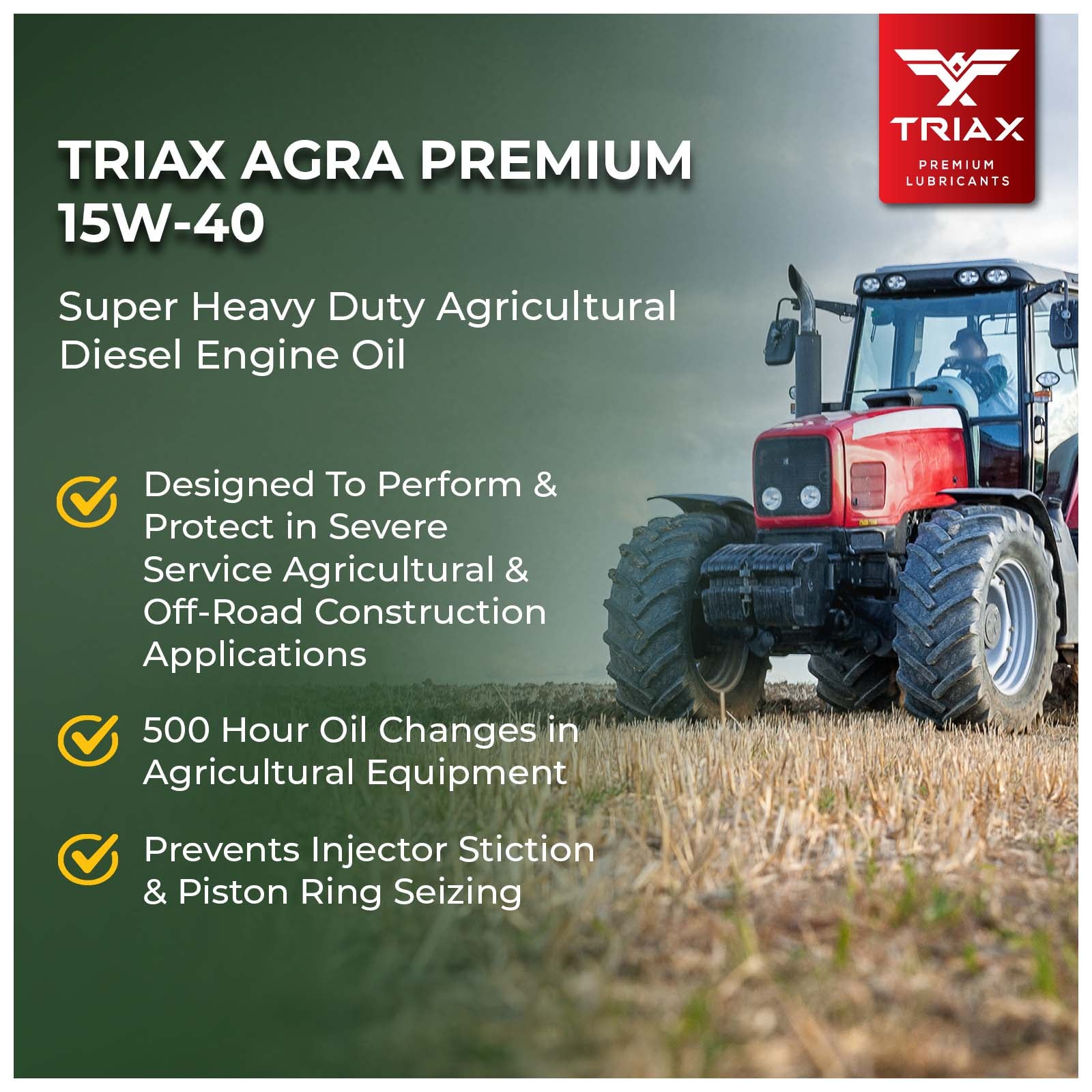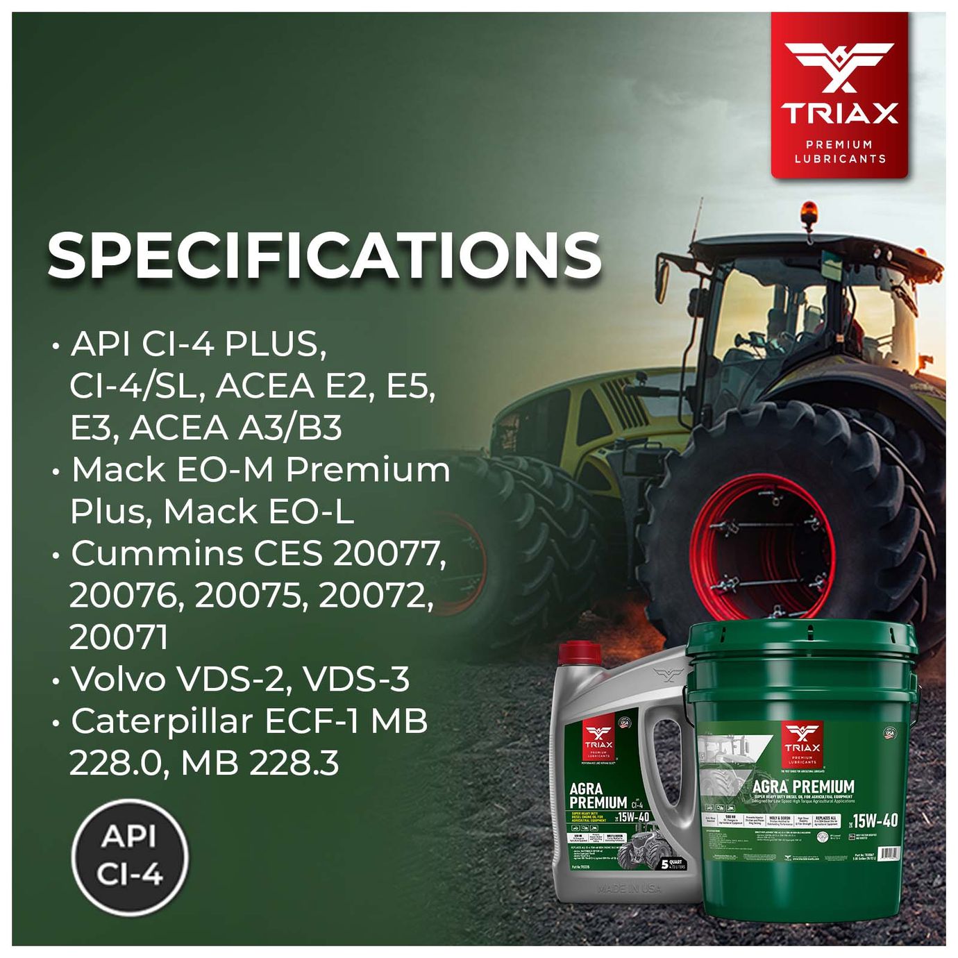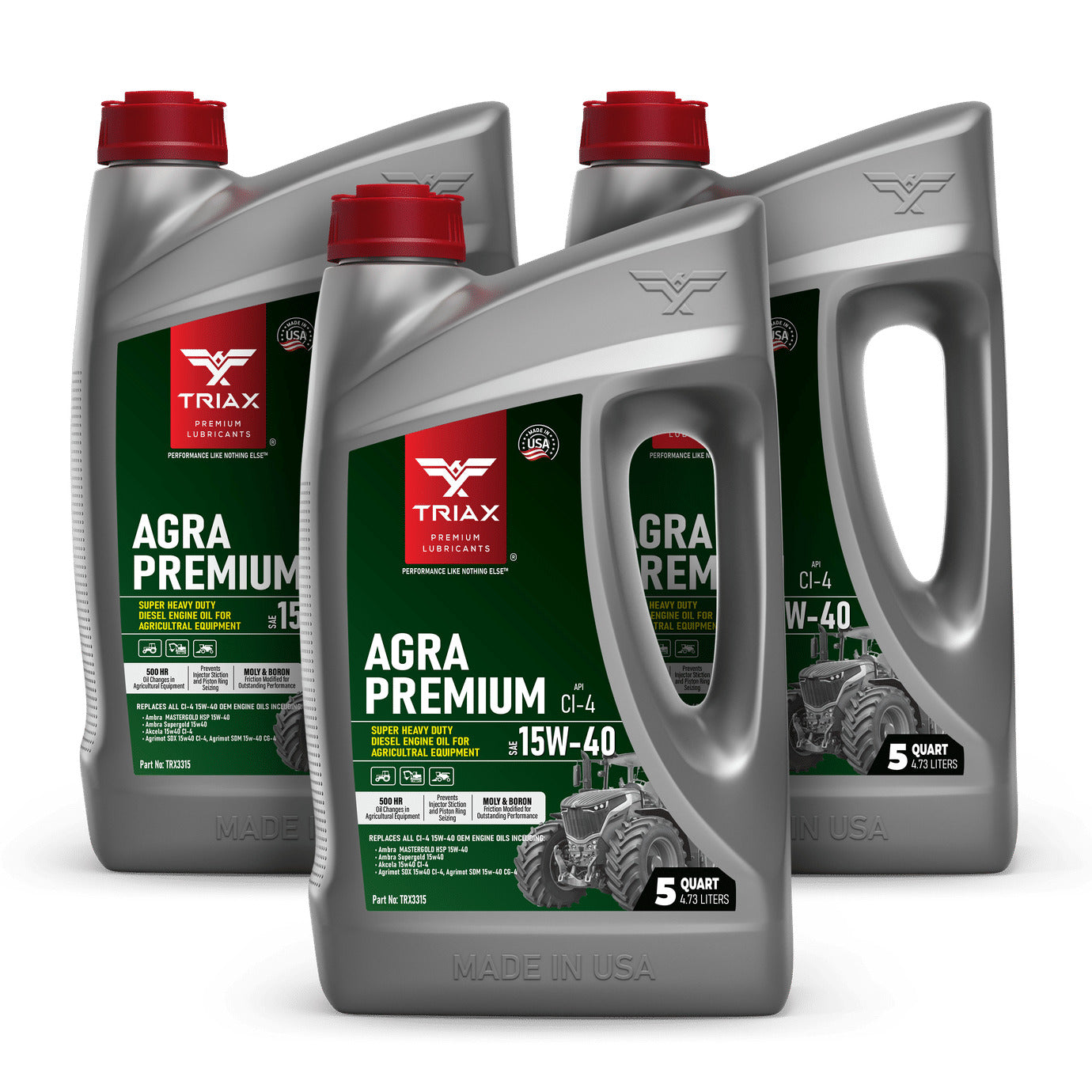 TRIAX Agra Premium CI-4 Plus is a heavy-duty diesel engine oil designed for agricultural and off-road construction applications. It provides enhanced wear protection, superior viscosity, shear stability, and up to 500-hour oil changes. Formulated with Moly, Boron, High ZDDP Levels, and aggressive detergents, it helps prevent injector stiction and piston ring seizing, ensuring reliable performance in high-torque, low-speed environments. It provides unrivaled protection for heavy-duty diesel and gasoline engines.
