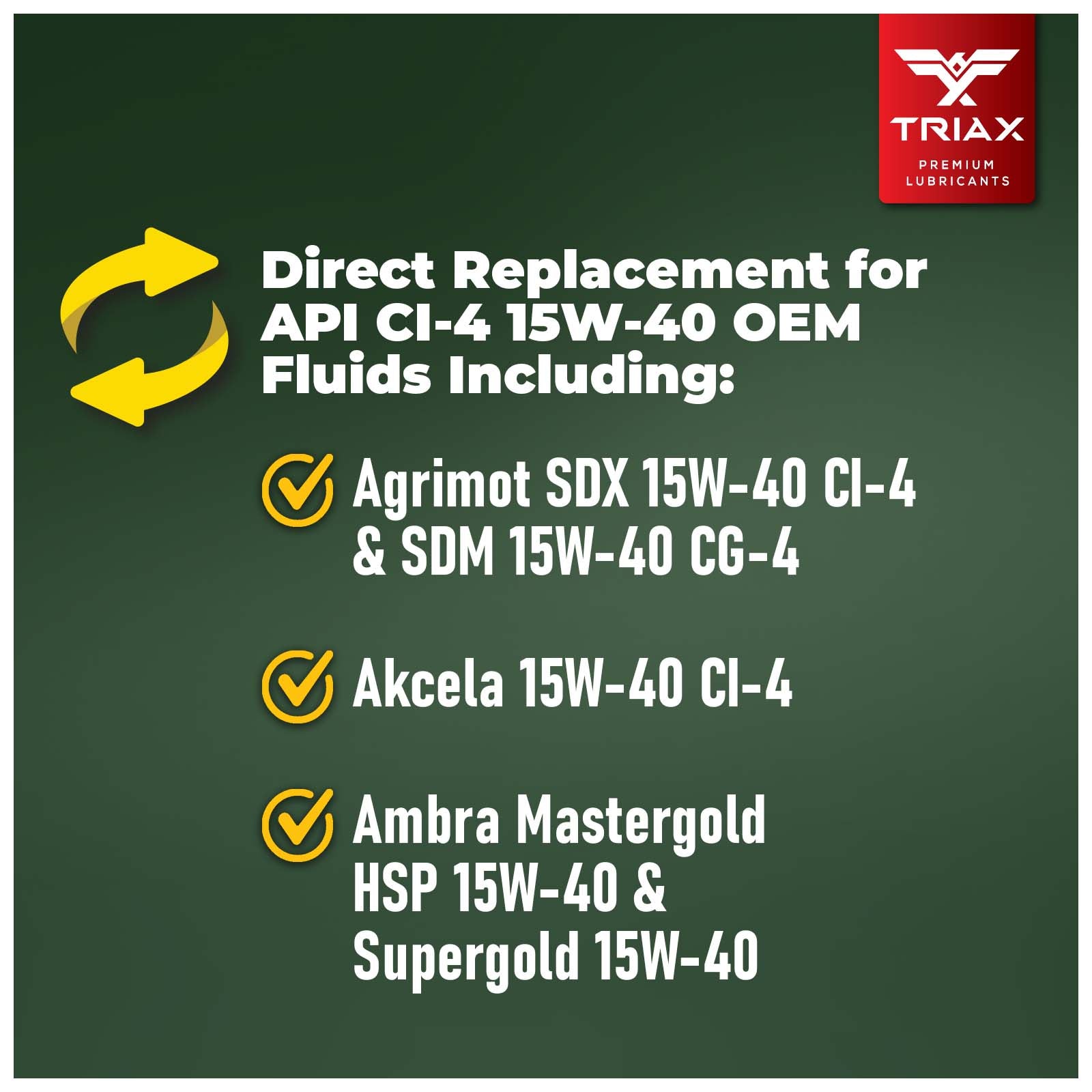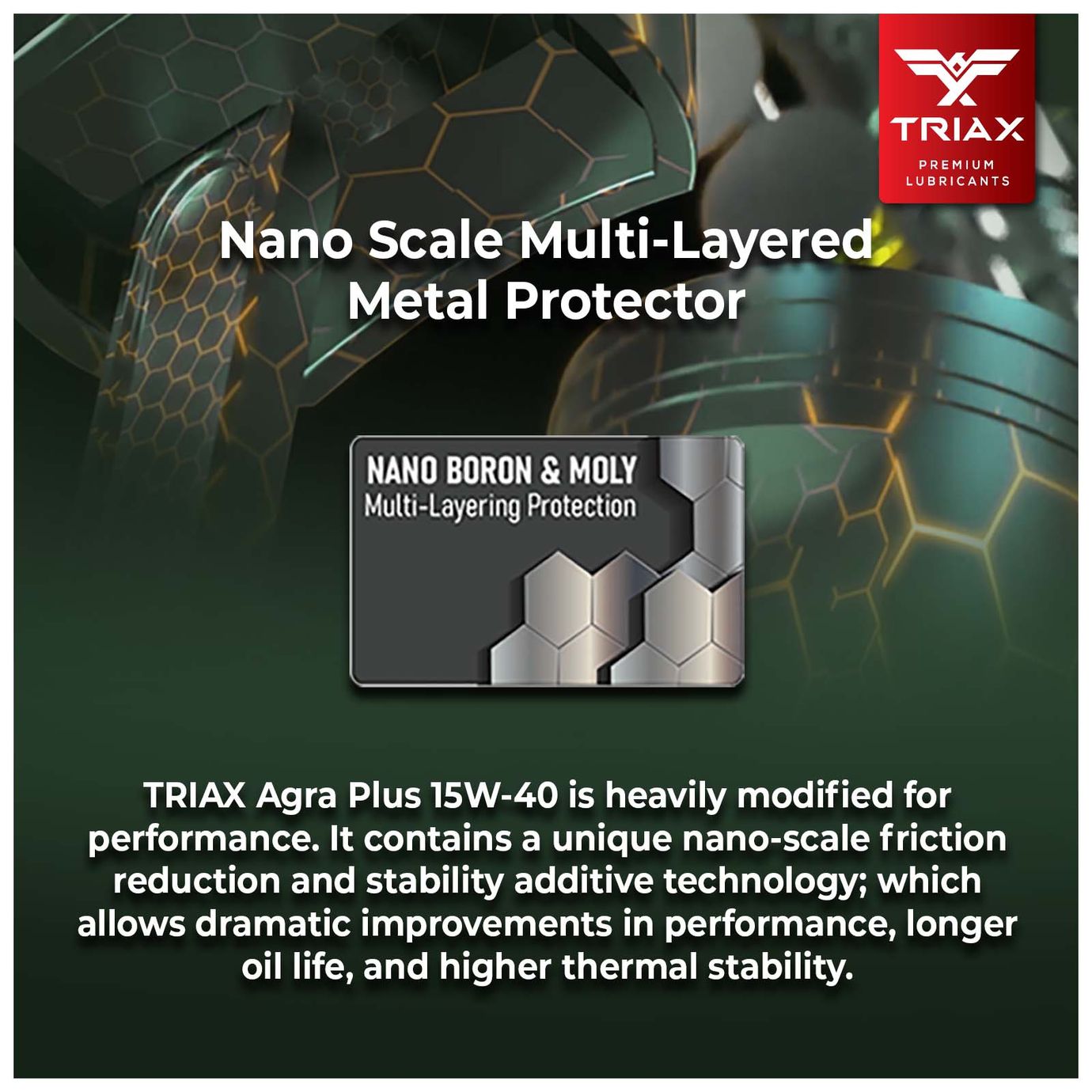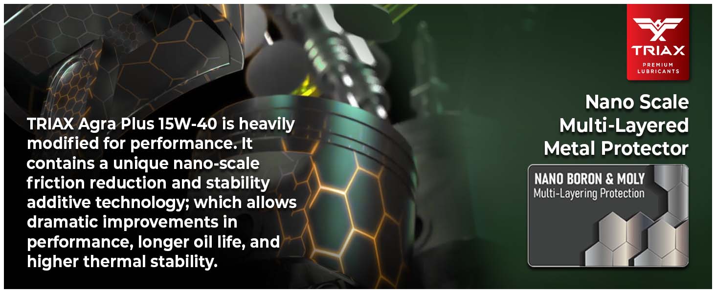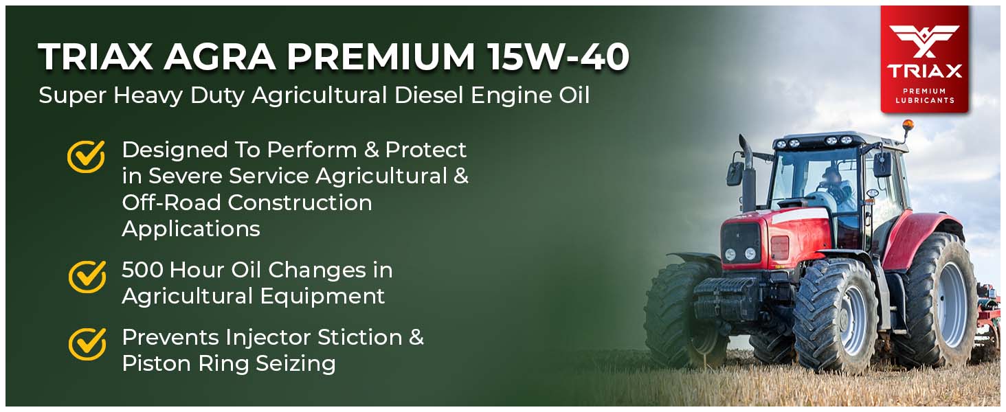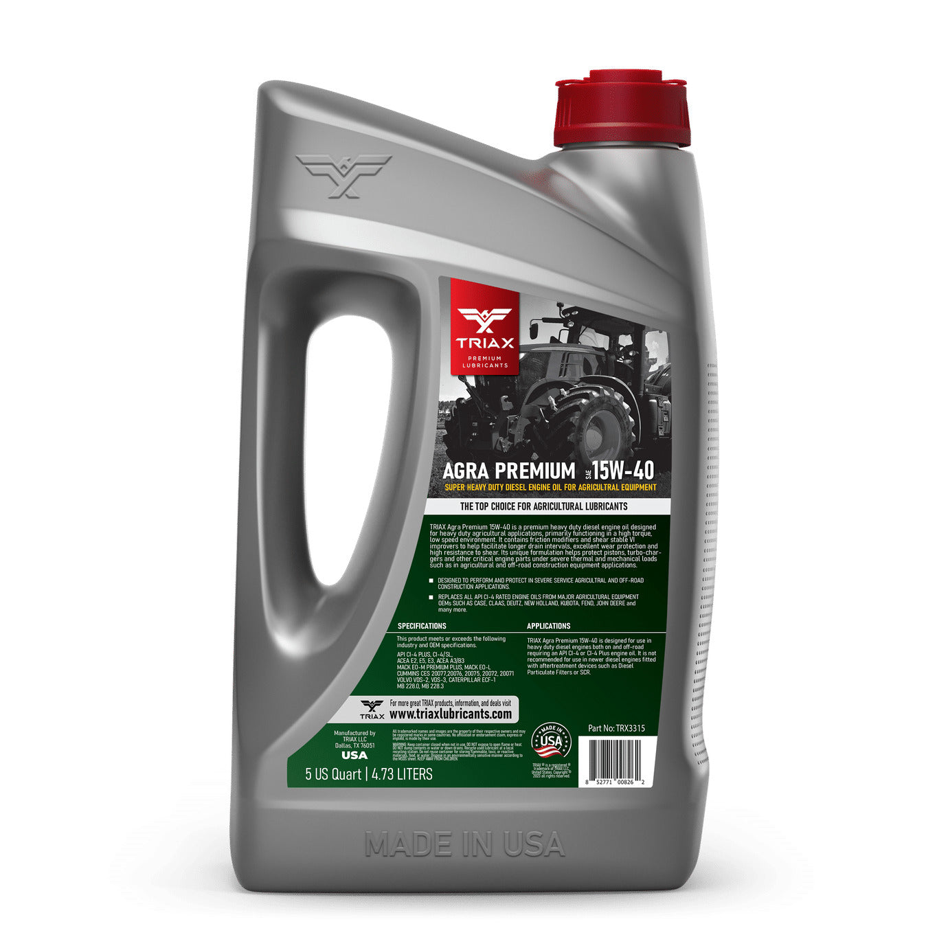 TRIAX Agra Premium CI-4 Plus is a heavy-duty diesel engine oil designed for agricultural and off-road construction applications. It provides enhanced wear protection, superior viscosity, shear stability, and up to 500-hour oil changes. Formulated with Moly, Boron, High ZDDP Levels, and aggressive detergents, it helps prevent injector stiction and piston ring seizing, ensuring reliable performance in high-torque, low-speed environments. It provides unrivaled protection for heavy-duty diesel and gasoline engines.