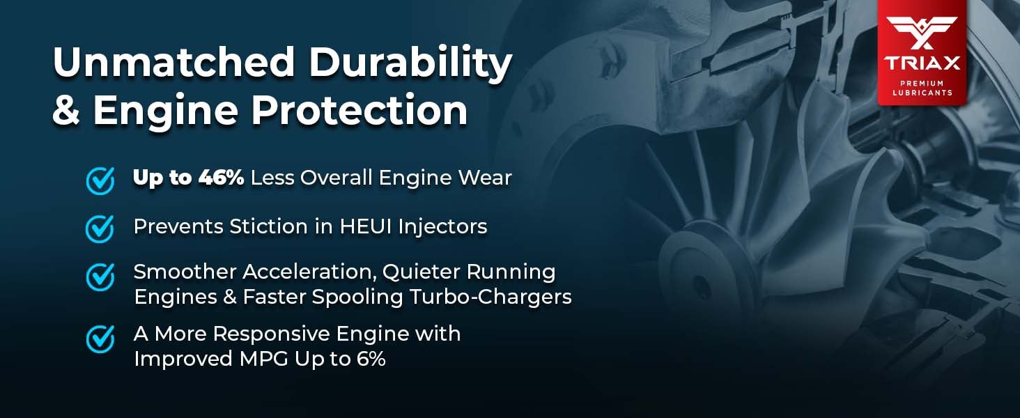 TRIAX Fleet Supreme synthetic diesel engine oils are the top choice for maximizing engine performance. These are state-of-the-art engine oils are built with performance as a priority while maintaining complete OEM spec compliance. TRIAX Fleet Supreme oils are fully formulated products synthetics, designed for complete API CK-4 compliance and exceed OEM specifications for advanced turbocharged diesel engines, such as Volvo, Cummins, Detroit Diesel, Mercedes Benz and Ford fitted with exhaust after-treatment devices such as DPF and SCR.