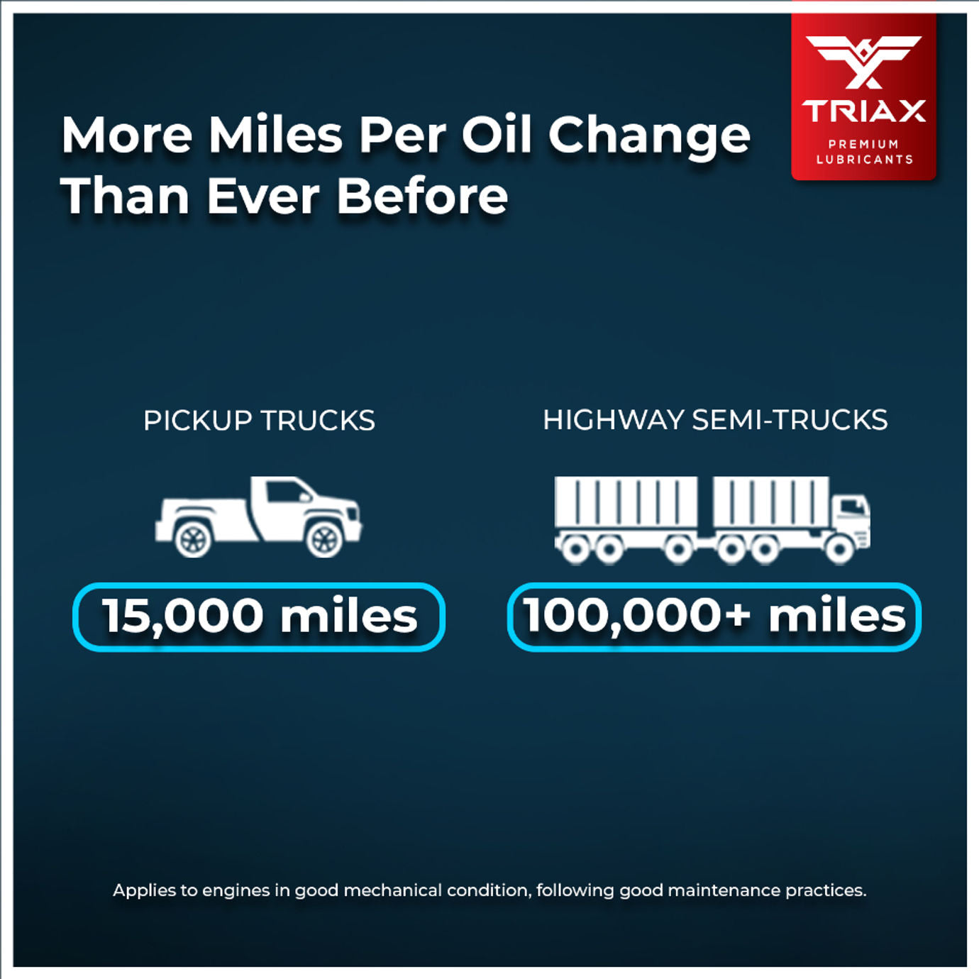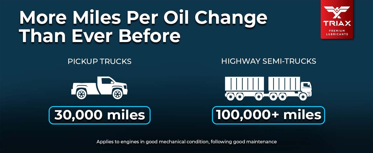 - Extended drain intervals: 15,000+ miles for pickups and over 100,000 miles for long haul semi trucks.
