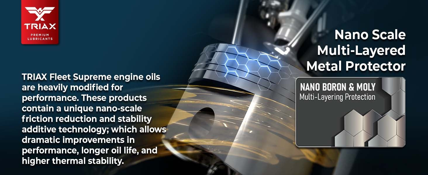 TRIAX Fleet Ultra oils are friction modified and contain our Nano-Boron and Moly friction management technology for outstanding wear protection, improved engine functionality, stiction prevention and improved durability.