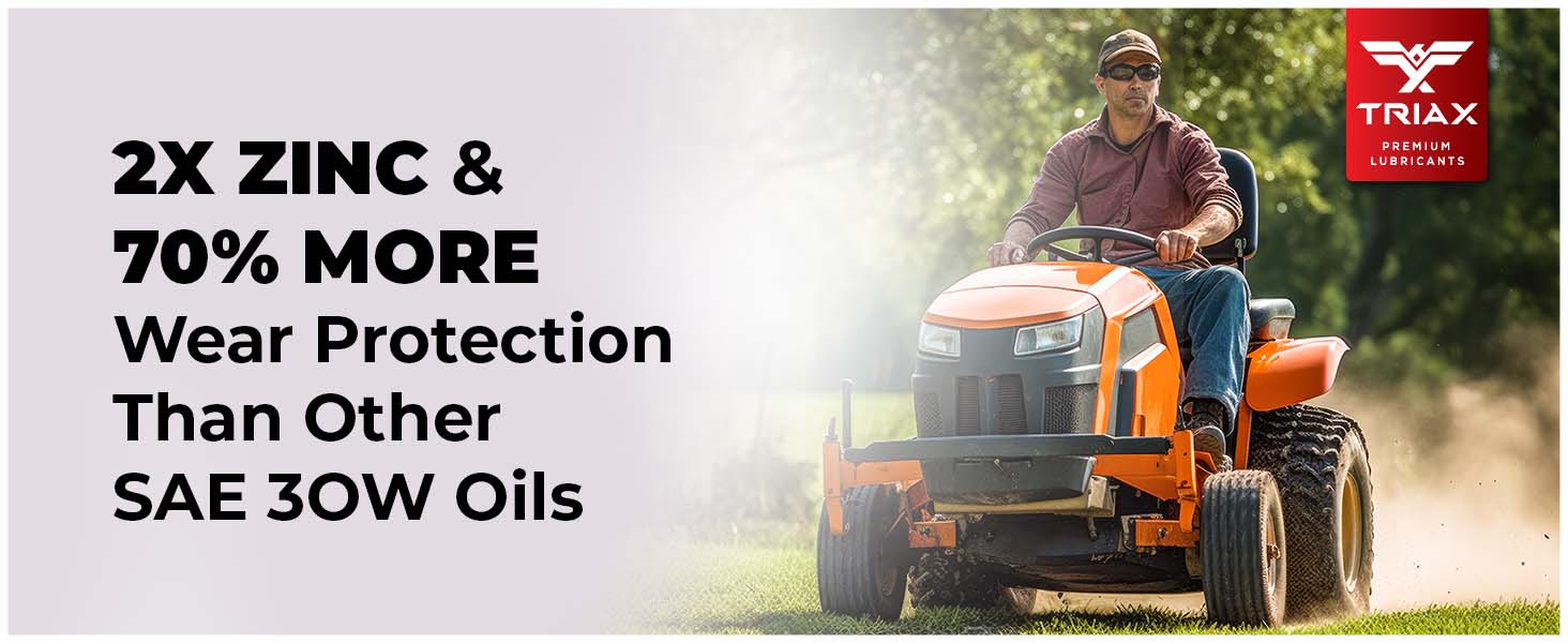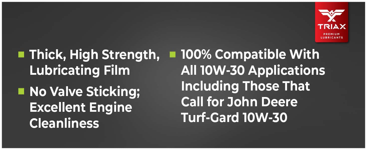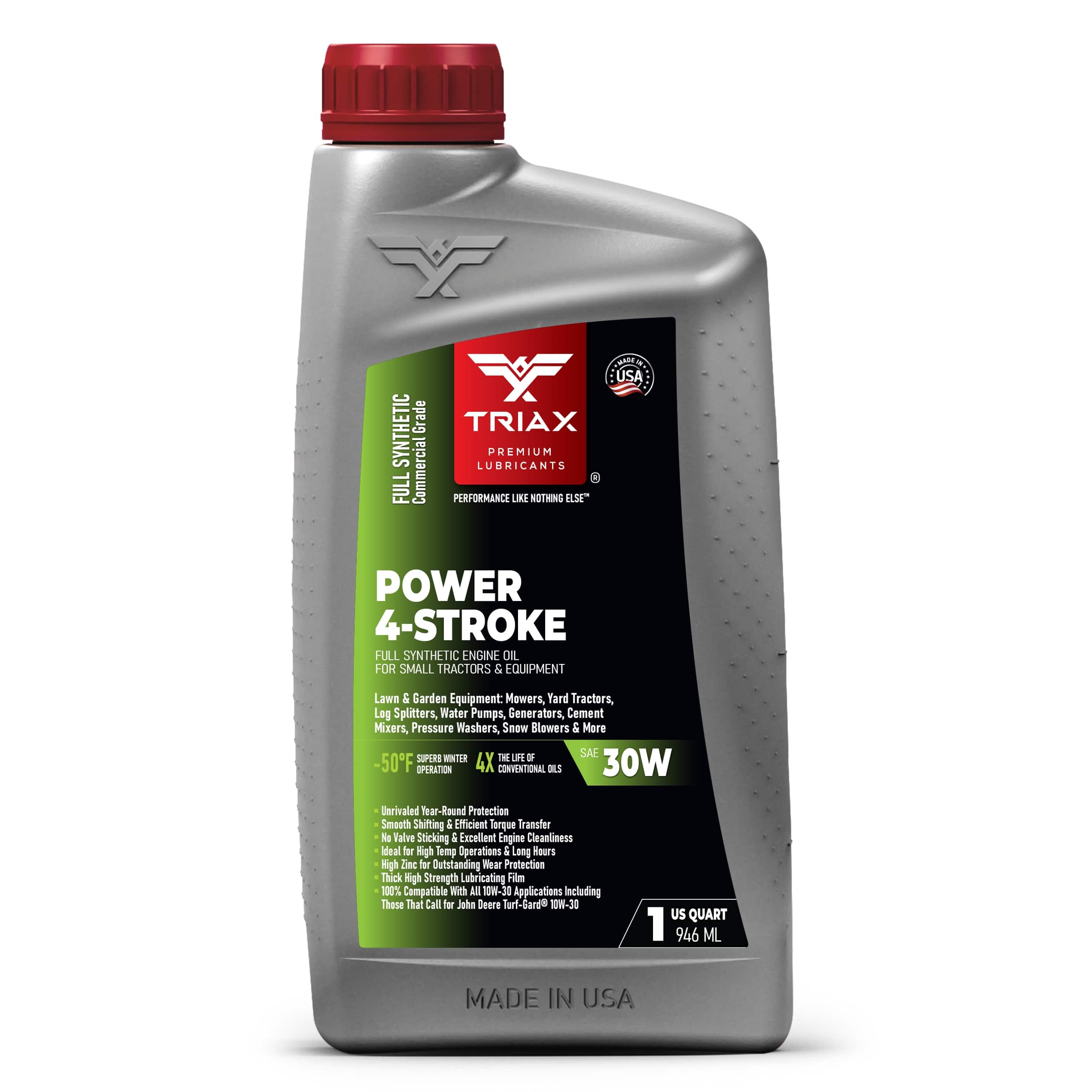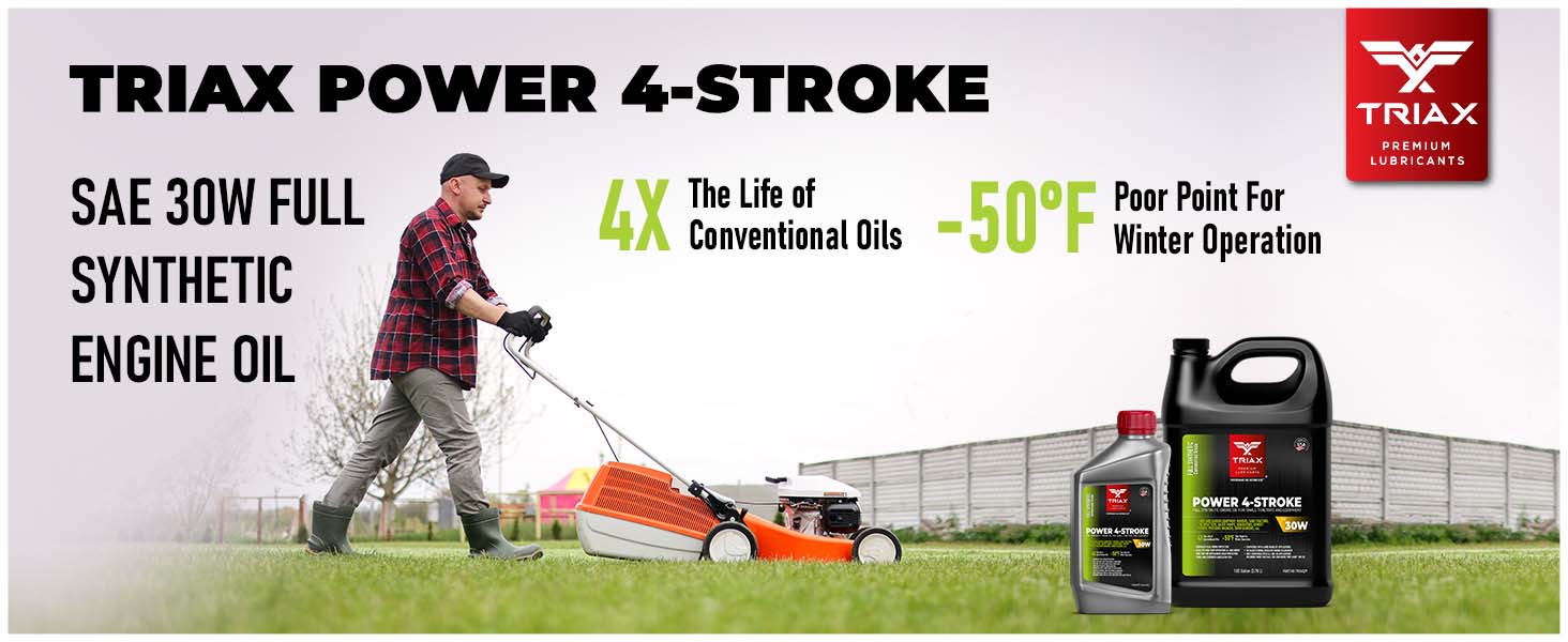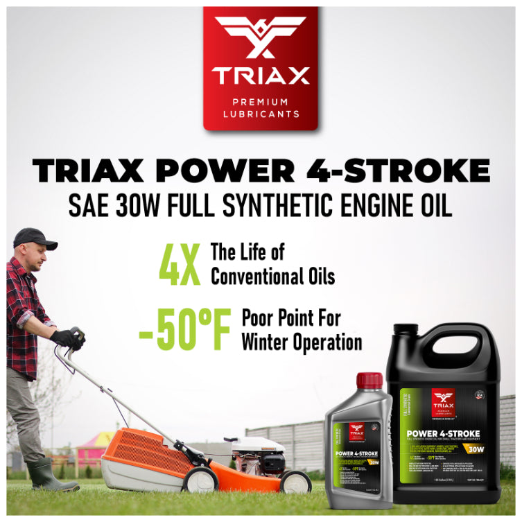 TRIAX Power 4-Stroke 30W has a full synthetic, high zinc formulation with three times the life of conventional 4 Stroke OEM Oils. It is ideal for contractors requiring long equipment life, infrequent oil changes, and high equipment use. It has a wide application range to be used with compressors, ride-on mowers, small tractors, pressure washers, generators, and any equipment requiring a SAE 30 or 30W motor oil. It is a true all-season oil, It features PAO / synthetic base oils with -50°F pour point for use in arctic conditions in addition to outstanding high temp stability. Its high thermal resistance means it will not lose viscosity in continuous use, high-temperature conditions of 120°F + ambient temperatures. It contains a state of the art detergent pack for pristine equipment cleanliness and parts longevity.