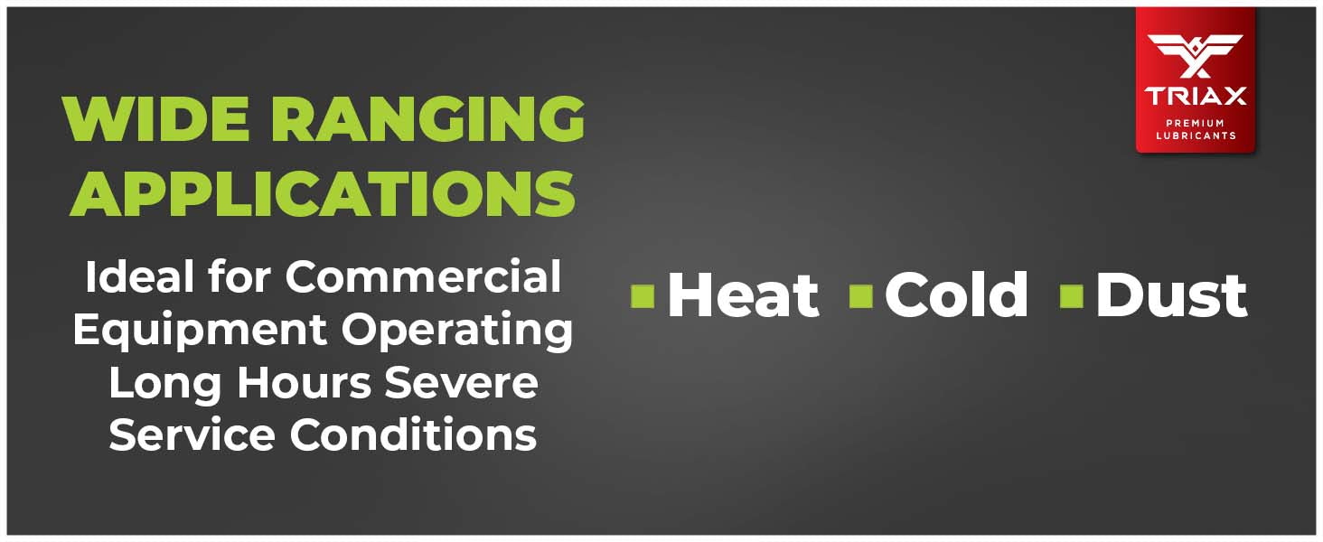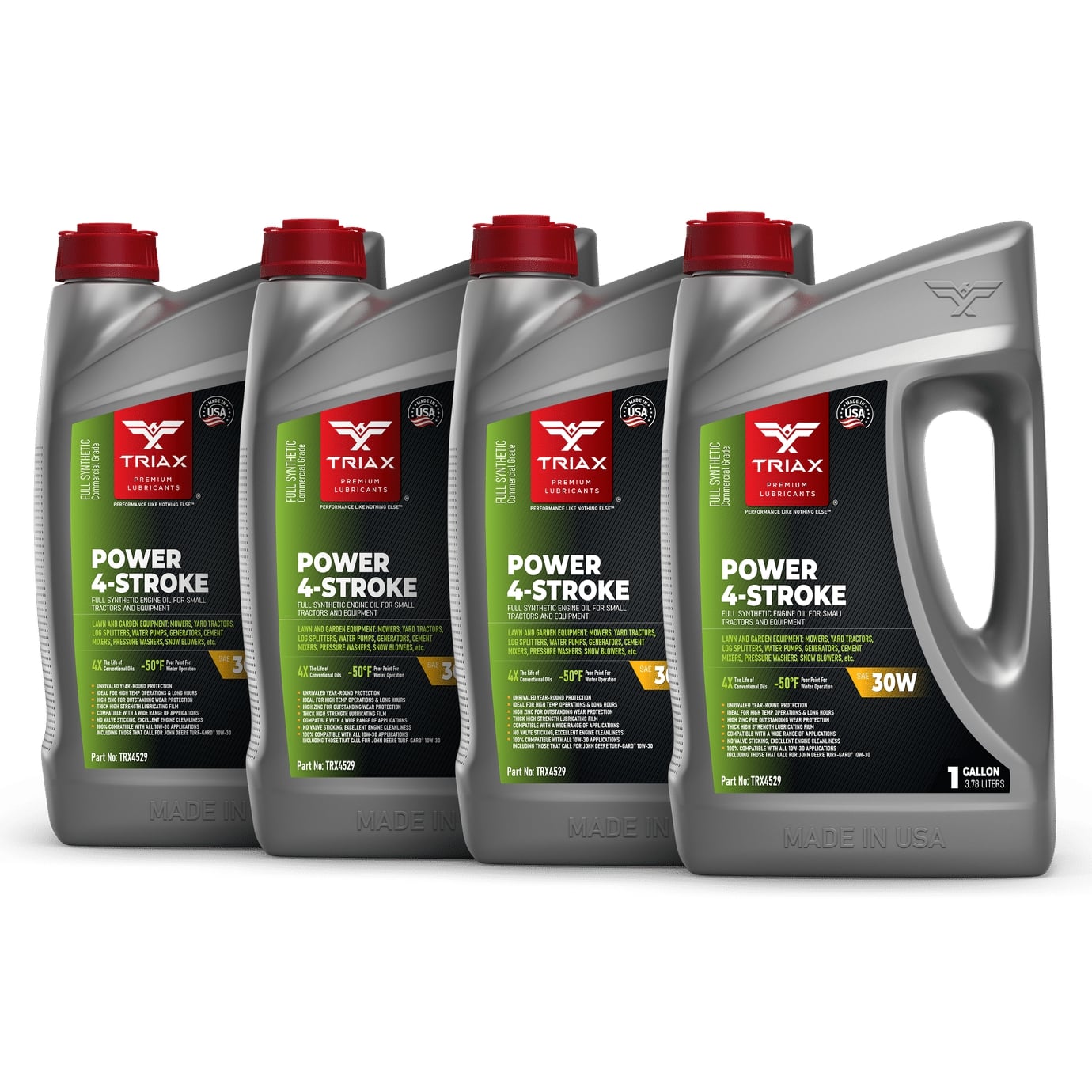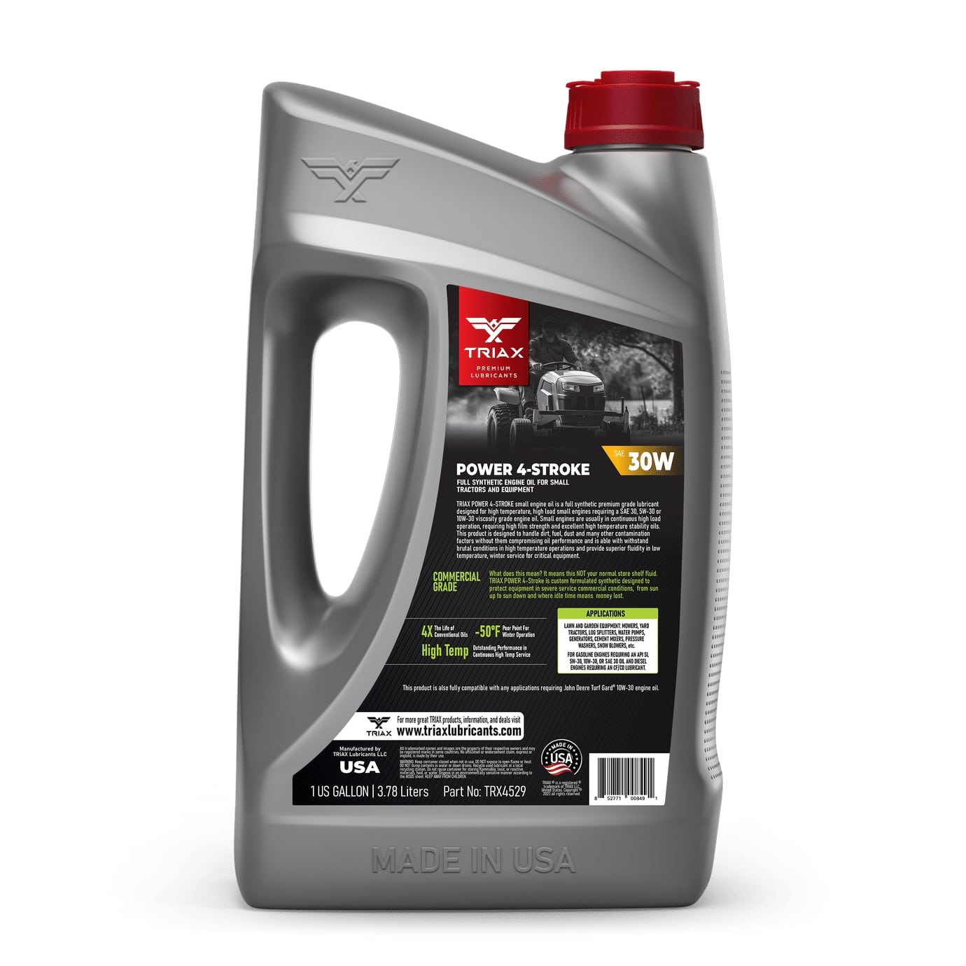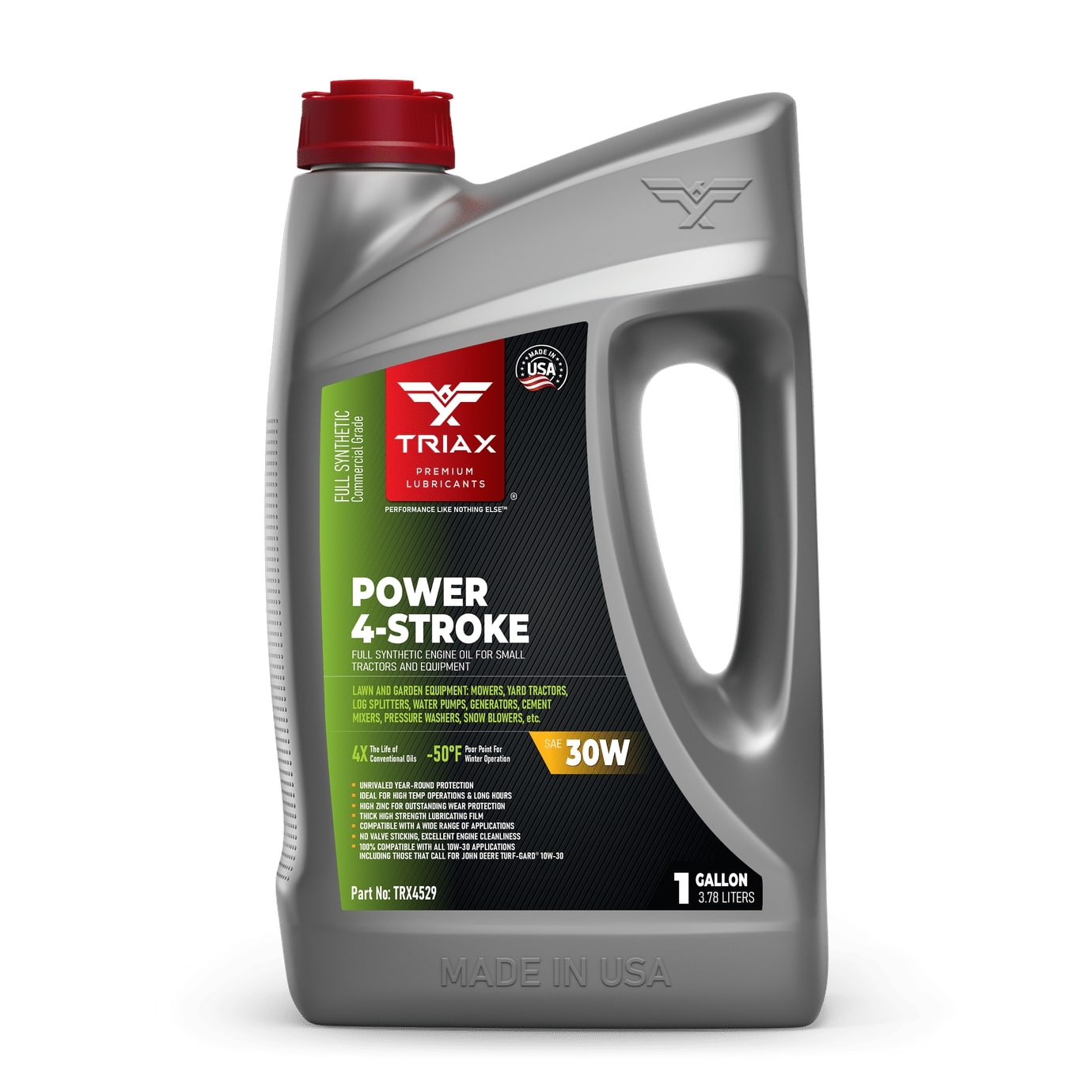 TRIAX Power 4-Stroke 30W has a full synthetic, high zinc formulation with three times the life of conventional 4 Stroke OEM Oils. It is ideal for contractors requiring long equipment life, infrequent oil changes, and high equipment use. It has a wide application range to be used with compressors, ride-on mowers, small tractors, pressure washers, generators, and any equipment requiring a SAE 30 or 30W motor oil. It is a true all-season oil, It features PAO / synthetic base oils with -50°F pour point for use in arctic conditions in addition to outstanding high temp stability. Its high thermal resistance means it will not lose viscosity in continuous use, high-temperature conditions of 120°F + ambient temperatures. It contains a state of the art detergent pack for pristine equipment cleanliness and parts longevity.