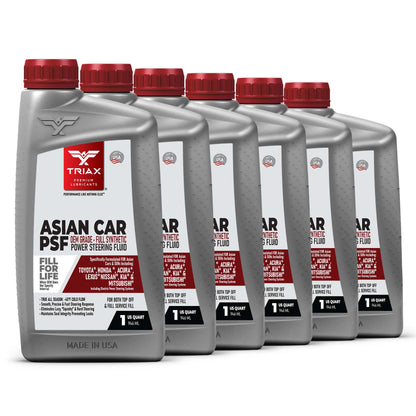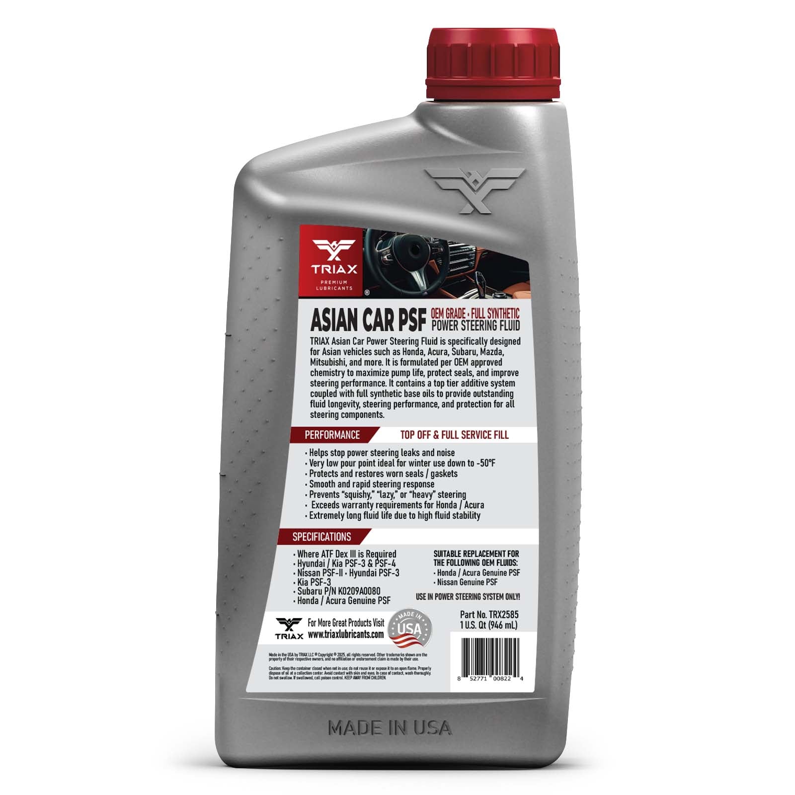 TRIAX Asian Car PSF is a premium power steering fluid engineered for a wide range of Asian vehicles, including Honda, Acura, Nissan, Subaru, Mazda, Kia, and Mitsubishi. It is formulated with OEM-approved chemistry and full synthetic base oils to deliver superior protection and steering performance. The advanced additive system enhances pump life, protects seals, and ensures smooth, responsive steering. It prevents common issues like "squishy" or "hard" steering in all weather conditions. It is designed for long-lasting use of at least 100,000 miles and offers excellent durability, leak prevention, and reliability.