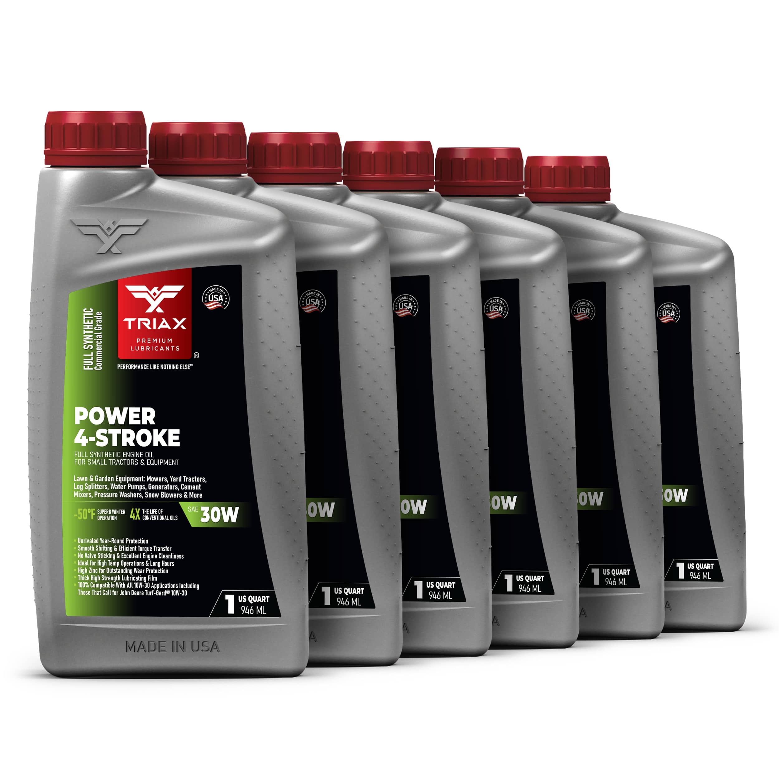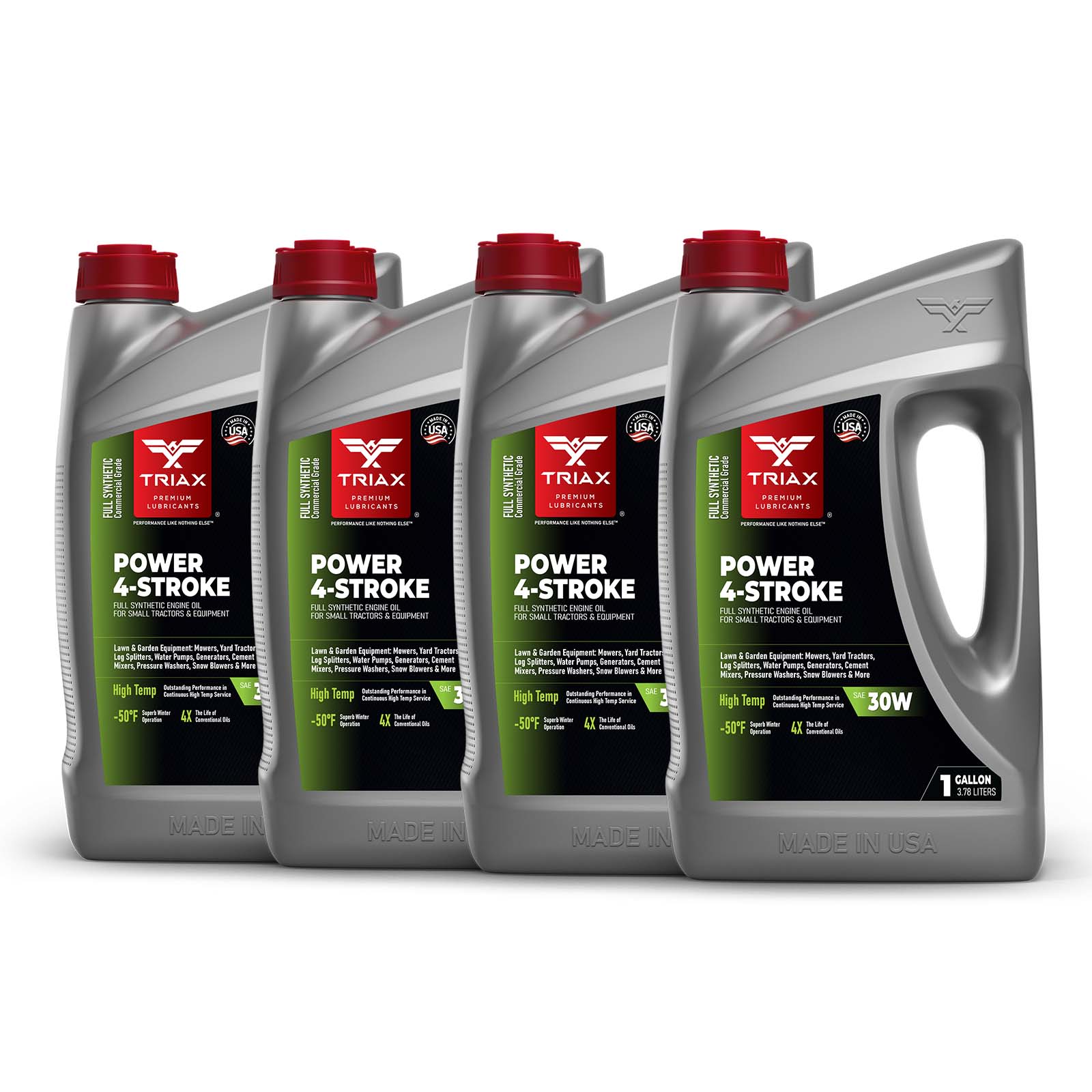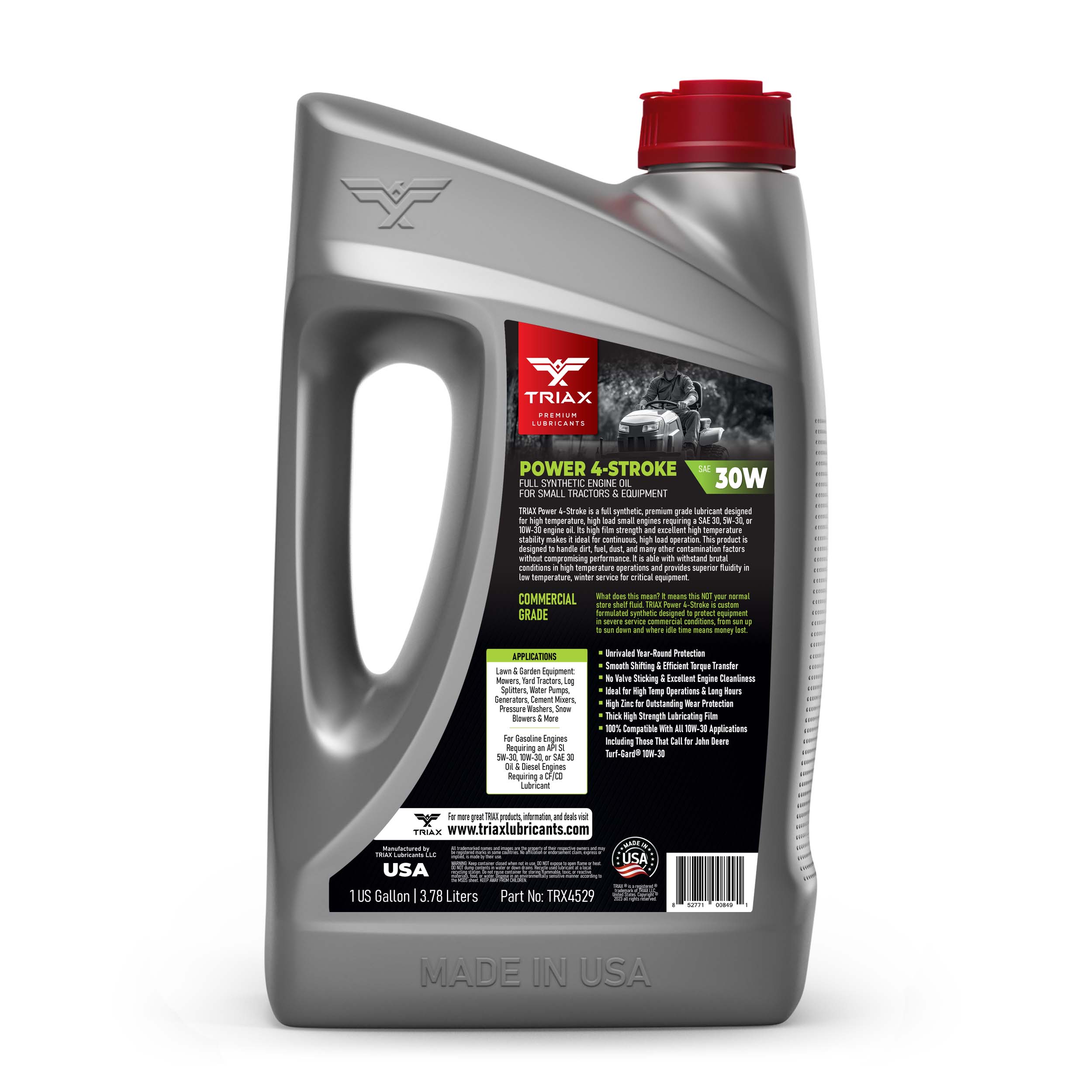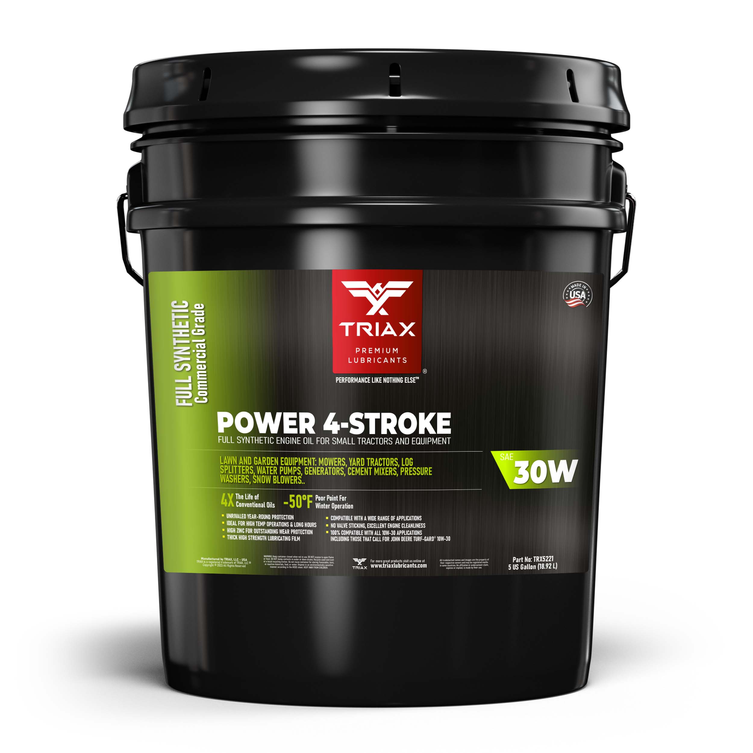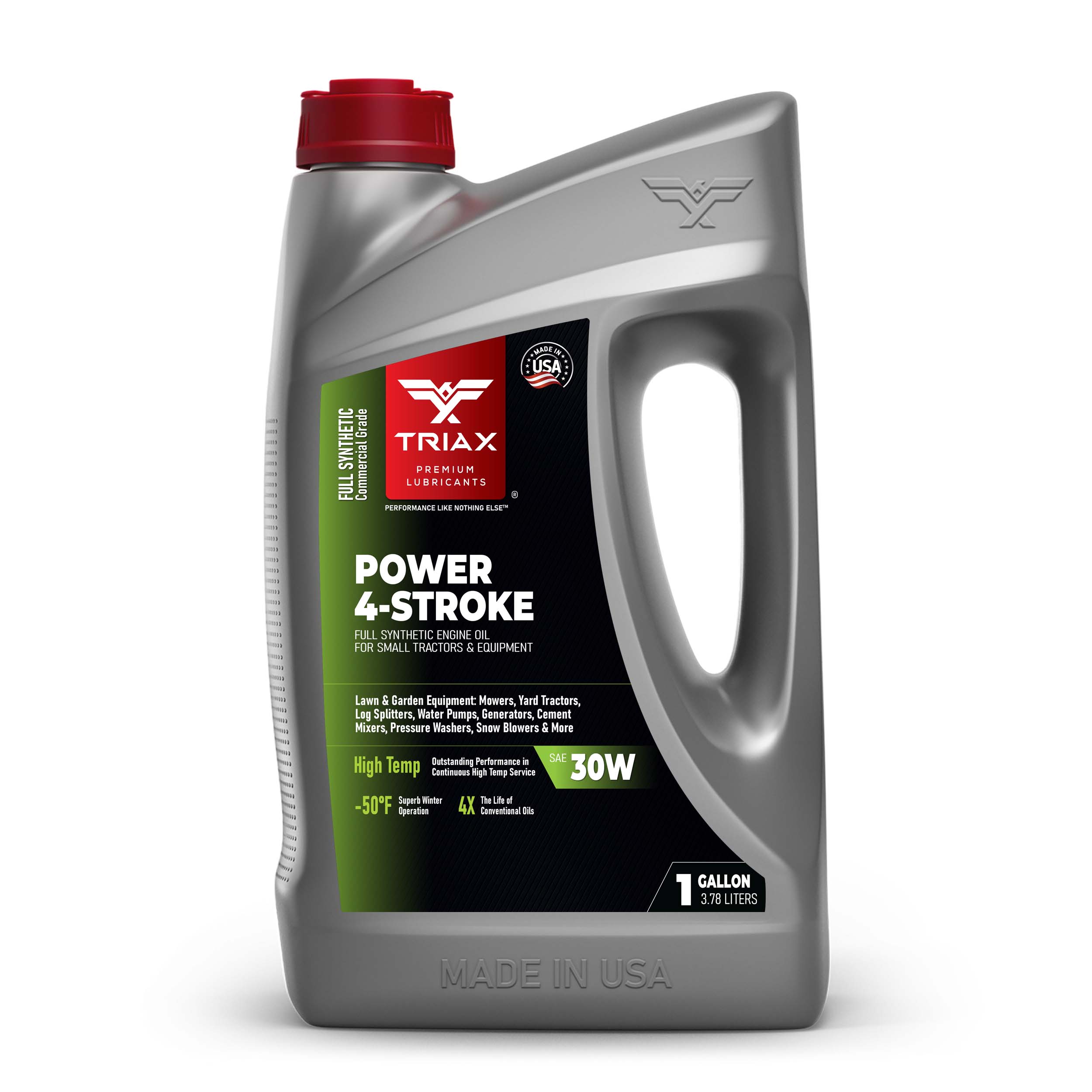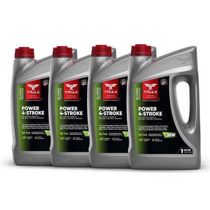 TRIAX Power 4-Stroke 30W has a full synthetic, high zinc formulation with three times the life of conventional 4 Stroke OEM Oils. It is ideal for contractors requiring long equipment life, infrequent oil changes, and high equipment use. It has a wide application range to be used with compressors, ride-on mowers, small tractors, pressure washers, generators, and any equipment requiring a SAE 30 or 30W motor oil. It is a true all-season oil, It features PAO / synthetic base oils with -50°F pour point for use in arctic conditions in addition to outstanding high temp stability. Its high thermal resistance means it will not lose viscosity in continuous use, high-temperature conditions of 120°F + ambient temperatures. It contains a state of the art detergent pack for pristine equipment cleanliness and parts longevity.