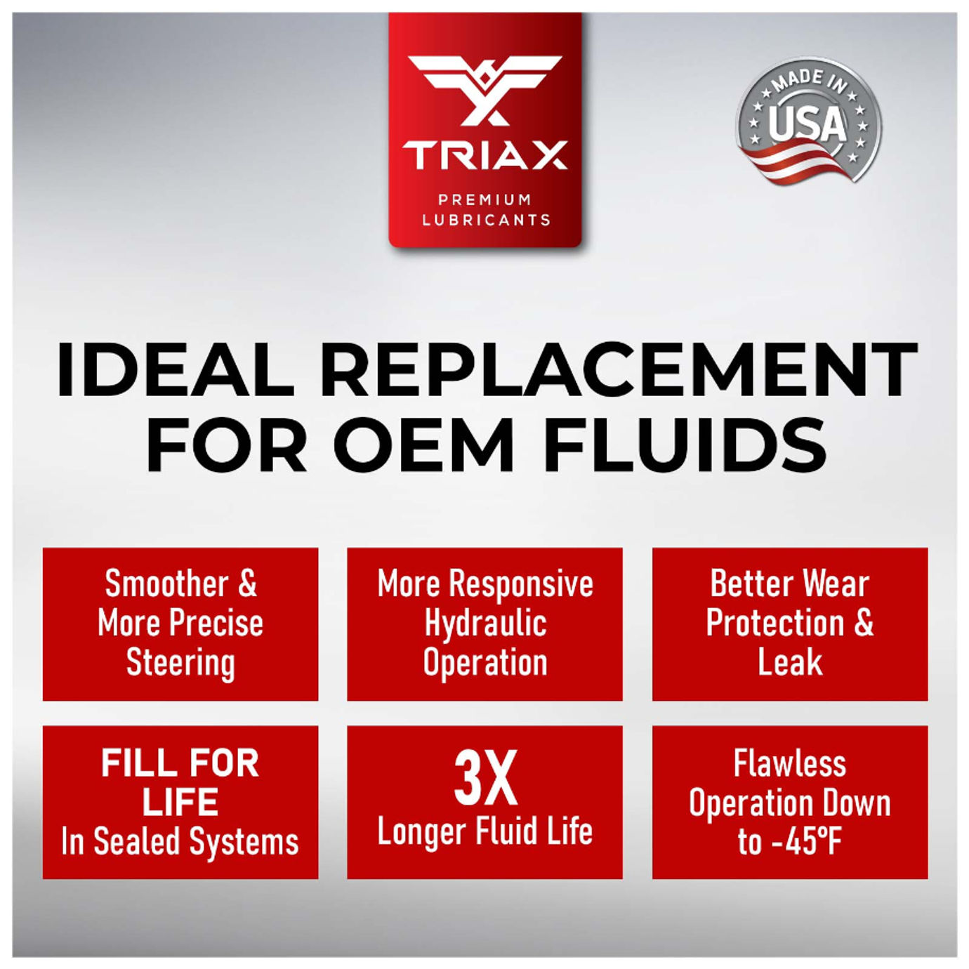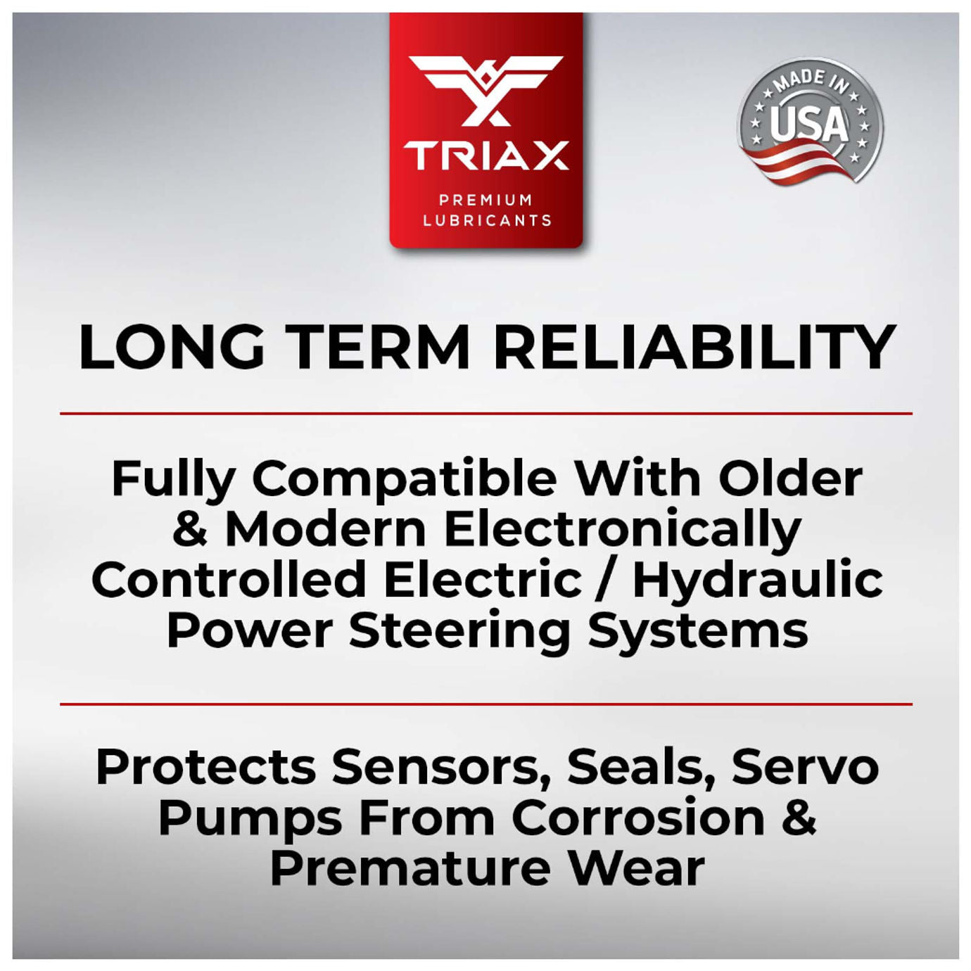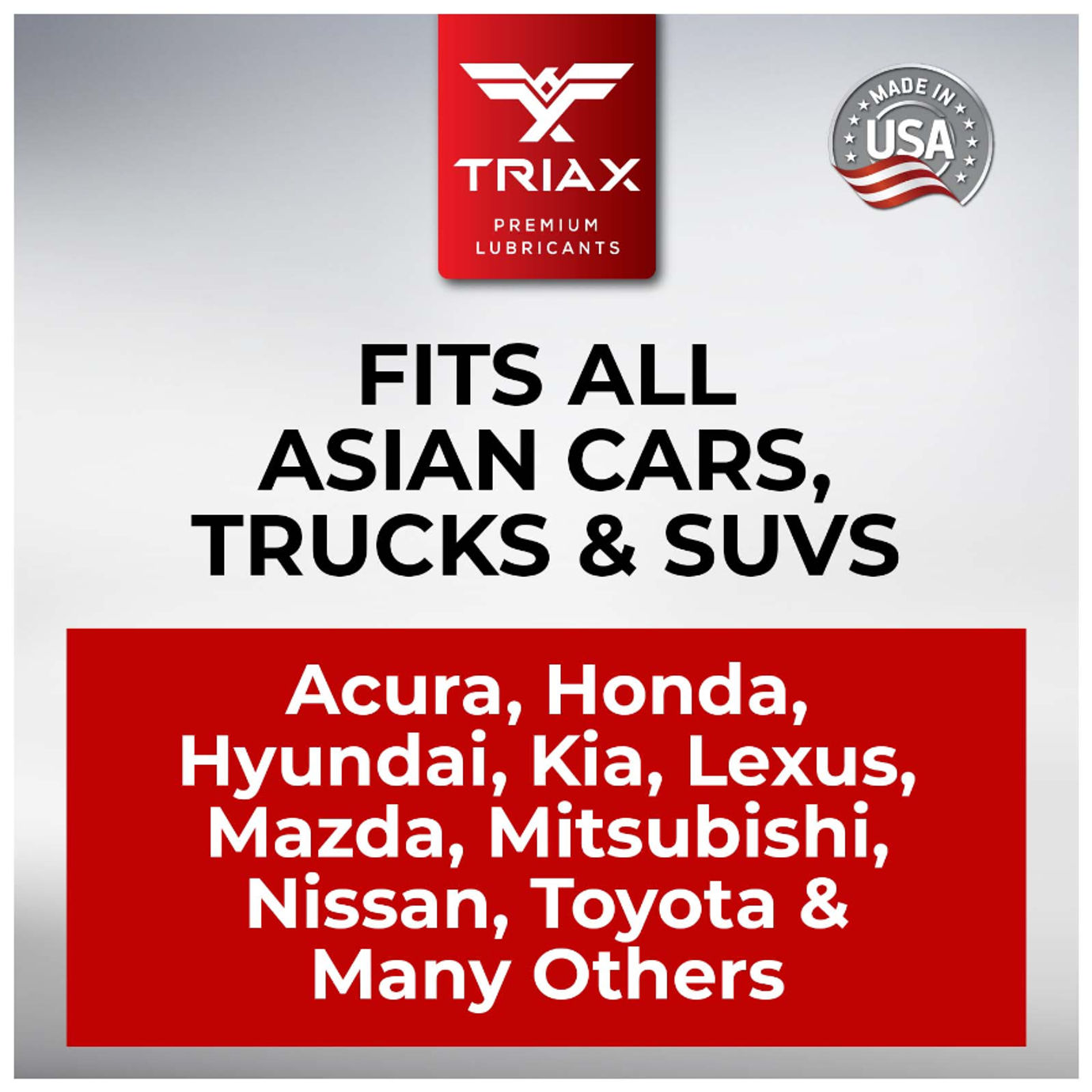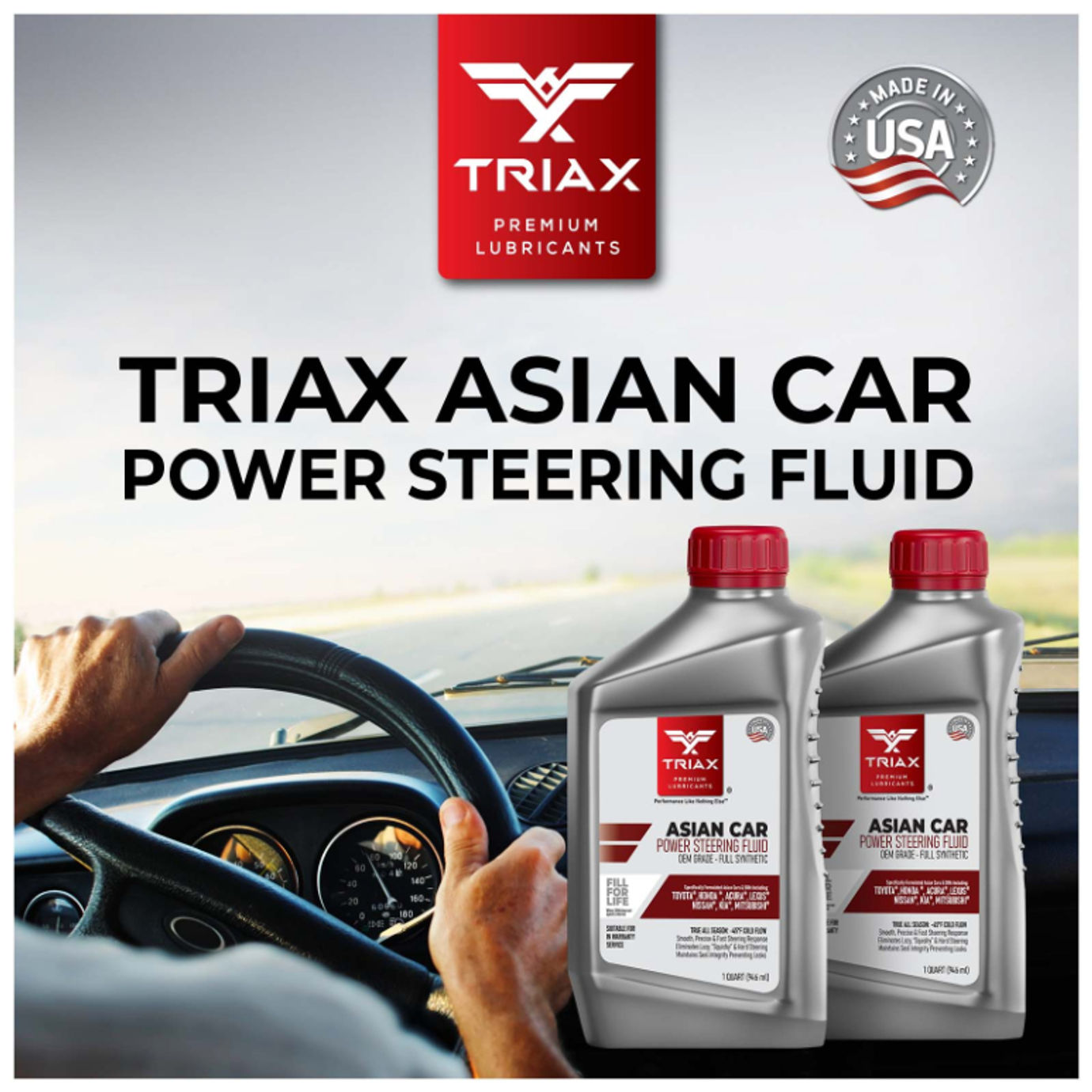 TRIAX Asian Car PSF is a premium power steering fluid engineered for a wide range of Asian vehicles, including Honda, Acura, Nissan, Subaru, Mazda, Kia, and Mitsubishi. It is formulated with OEM-approved chemistry and full synthetic base oils to deliver superior protection and steering performance. The advanced additive system enhances pump life, protects seals, and ensures smooth, responsive steering. It prevents common issues like "squishy" or "hard" steering in all weather conditions. It is designed for long-lasting use of at least 100,000 miles and offers excellent durability, leak prevention, and reliability.