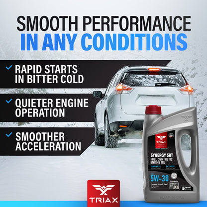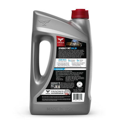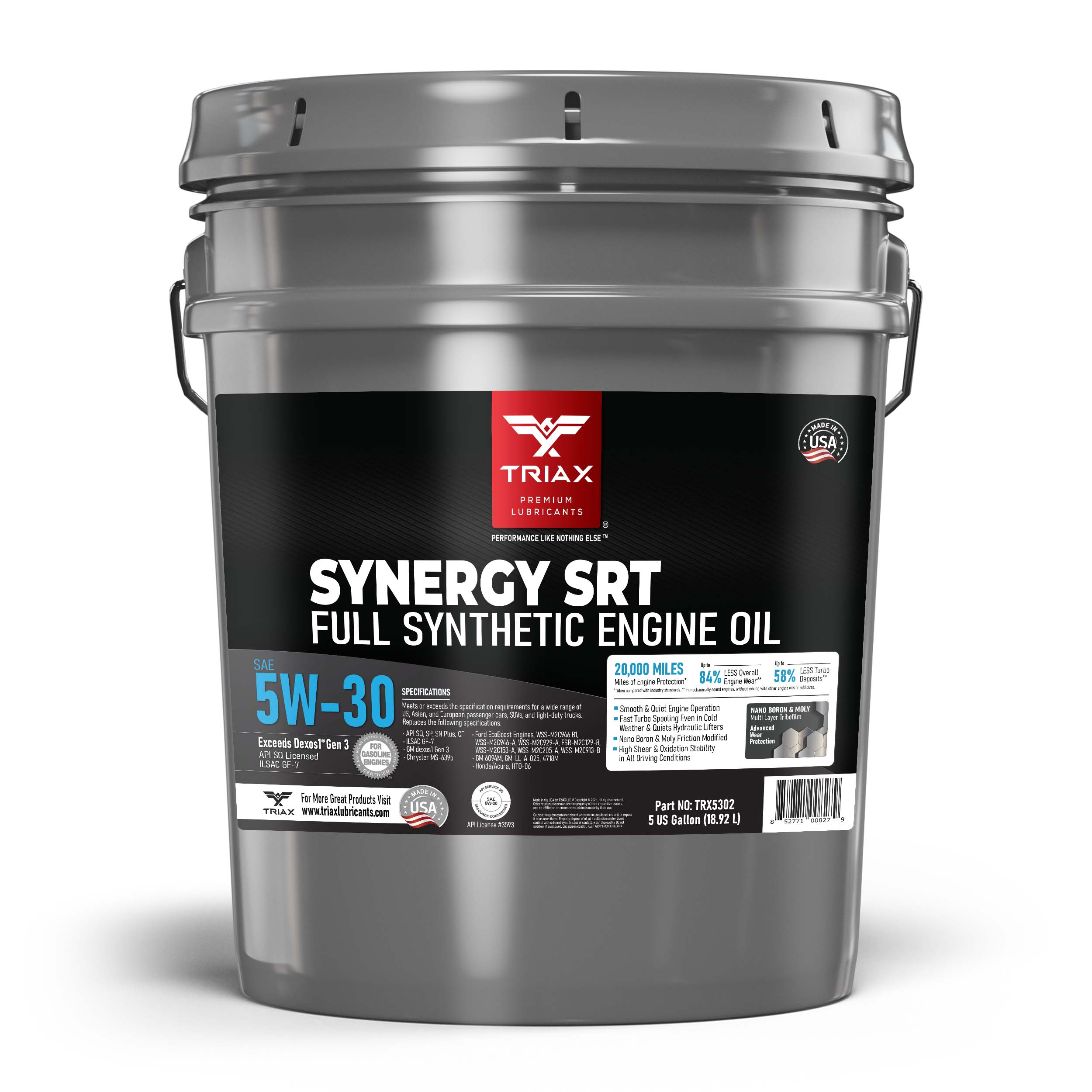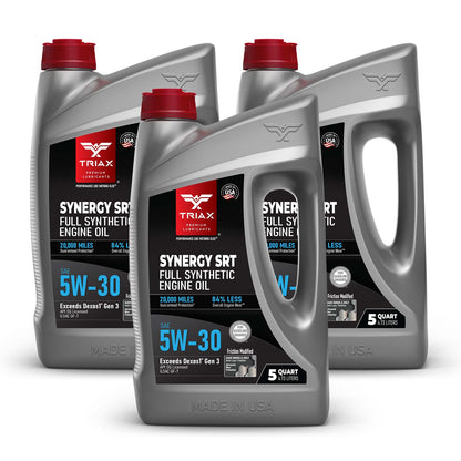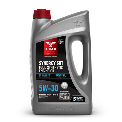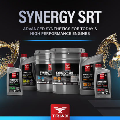 TRIAX Synergy SRT engine oils are full synthetic, friction modified, state-of-the-art, engine oils, designed maximize wear protection and engine longevity. These oils are engineered with a lower friction coefficient than most other lubricants and are tailored to exceed the highest expectations from professional mechanics and consumers alike. They are fully formulated and exceed API and OEM standards, such as Ford, Honda, Chrysler, Jeep, Chevy, and General Motors Dexos 1 Gen 3 ®.