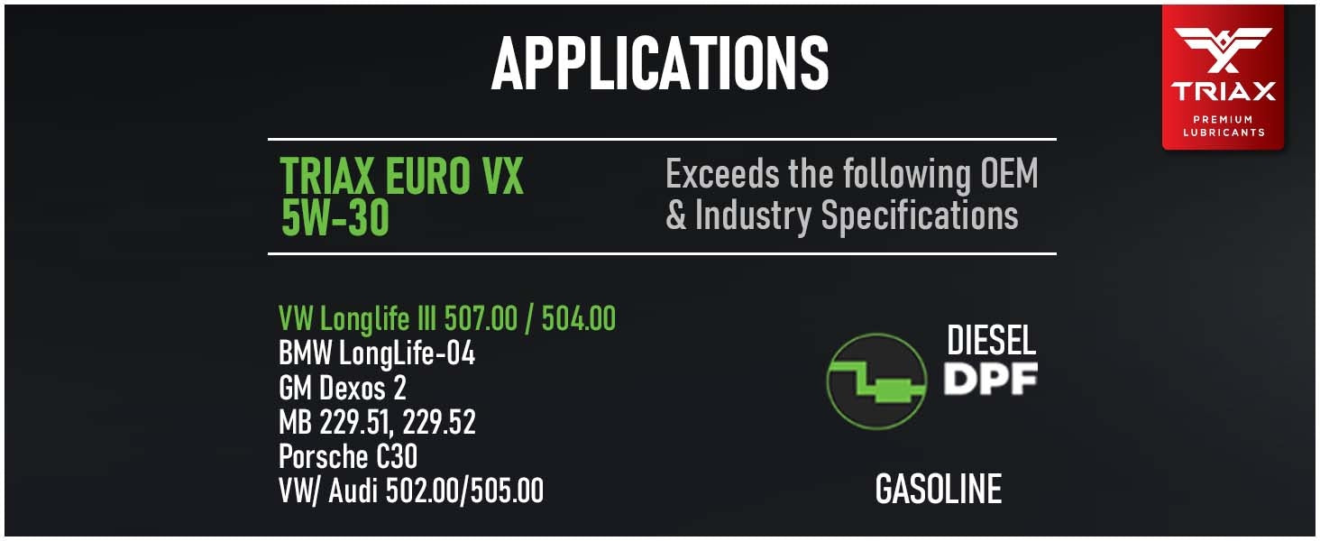 TRIAX Euro LX 5W-40 Full Synthetic ist ein Motoröl mit mittlerer Viskosität, hoher Scherkraft und hoher thermischer Stabilität für europäische Benzinfahrzeuge (ohne DPF), die ein Motoröl der Viskositätsklasse 5W-40 benötigen. Es zeichnet sich durch eine außergewöhnlich hohe Scherstabilität, einen hohen TBN-Wert und eine unübertroffene Beständigkeit gegen thermischen Abbau aus. Es ist mit vollsynthetischen Ölen und PAO, hohem ZDDP-Gehalt und Molybdän-Reibungsmodifikatoren formuliert, verfügt über modernste Reinigungskraft und zeichnet sich durch eine außergewöhnlich geringe Flüchtigkeit unter hoher thermischer Belastung aus.