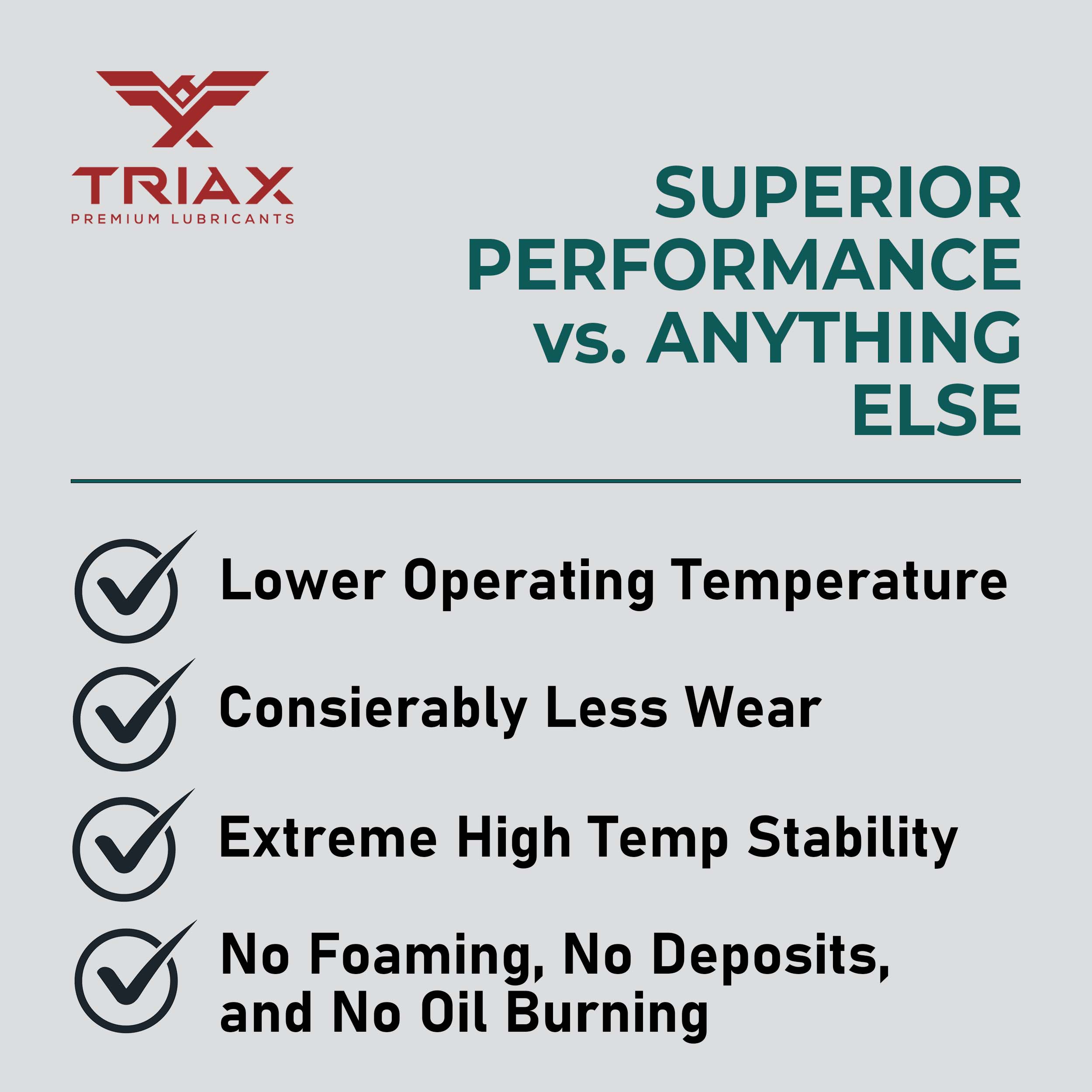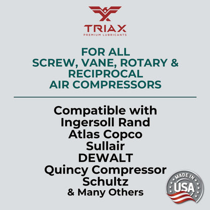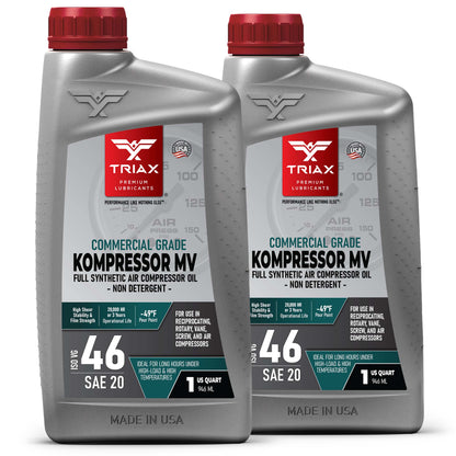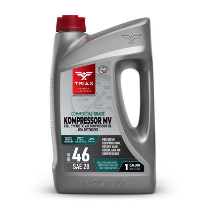 TRIAX KOMPRESSOR MV is a non-detergent, multi-viscosity, full synthetic air compressor oil for all screw, rotary, vane and reciprocating air compressors in both regular and severe service applications. This product features an exceptional quality blend of synthetic base oils and top tier additive chemistry to facilitate outstanding, long term performance and protection for air compressors.