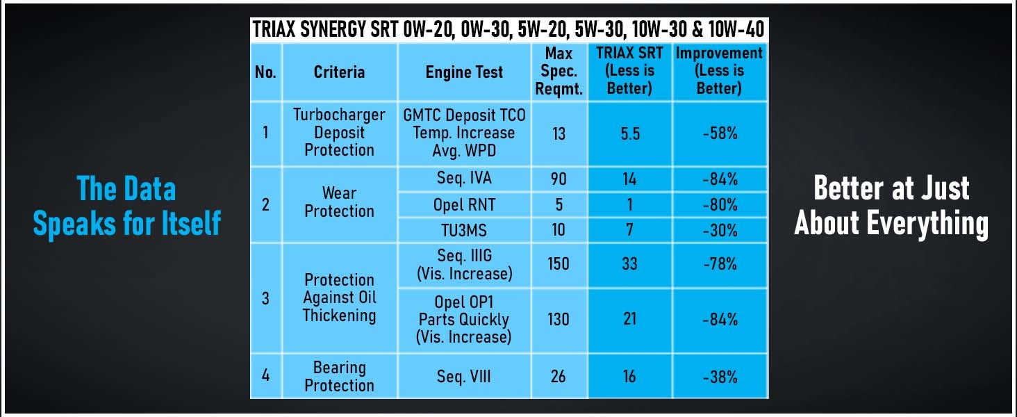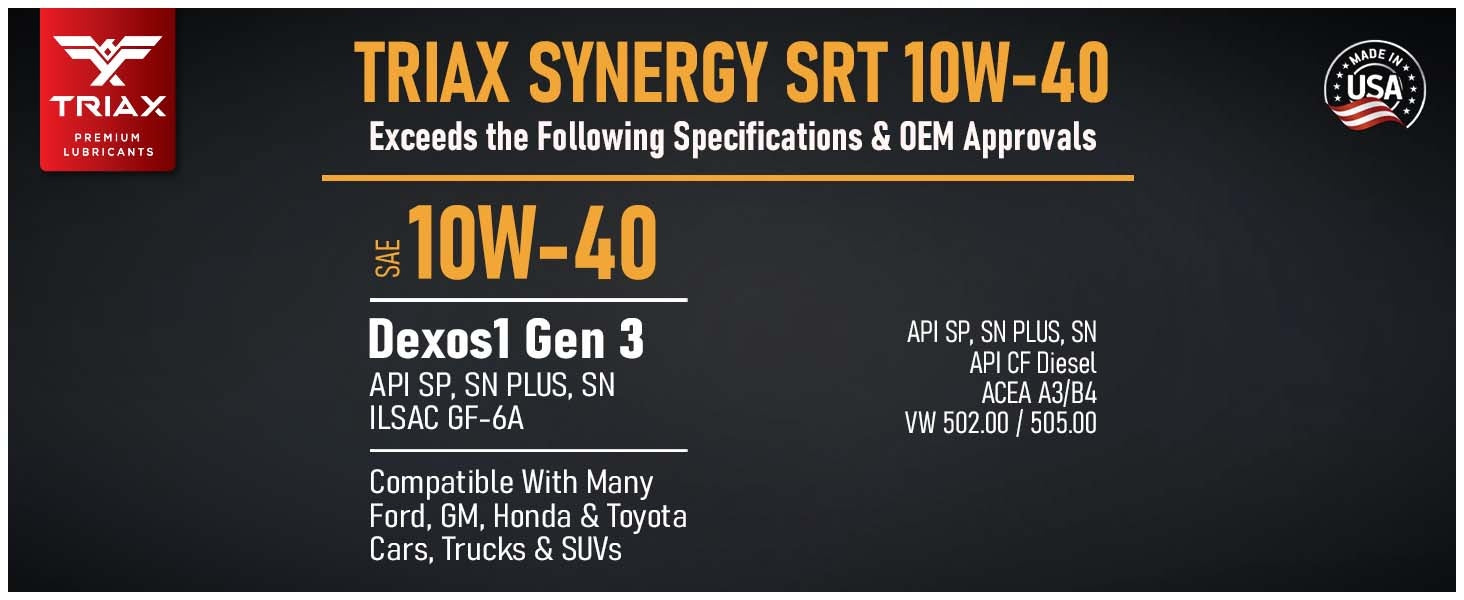 L'huile moteur TRIAX Synergy SRT 10W-40 est une huile moteur haut de gamme, entièrement synthétique, conçue pour optimiser la protection contre l'usure des moteurs à kilométrage élevé. Sa composition chimique ciblée prévient les symptômes liés au kilométrage élevé et améliore la longévité du moteur. Elle contient des additifs spéciaux pour lutter contre les fuites et les brûlures d'huile, le bruit, les boues, la combustion d'huile, la fissuration et la sécheresse des joints, ainsi que l'usure prématurée. Elle protège les turbocompresseurs, les pistons et les injecteurs des dépôts et des boues. Les huiles TRIAX Synergy SRT sont entièrement homologuées et certifiées API SP.