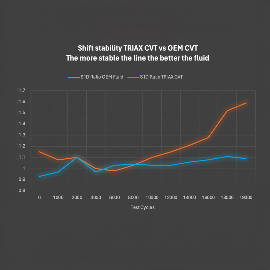TRIAX CVT Fluid S1/D frictional test for clutch engagement, frictional stability during operation clearly shows outstanding frictional stability, smooth shifting, without shudder and noise.