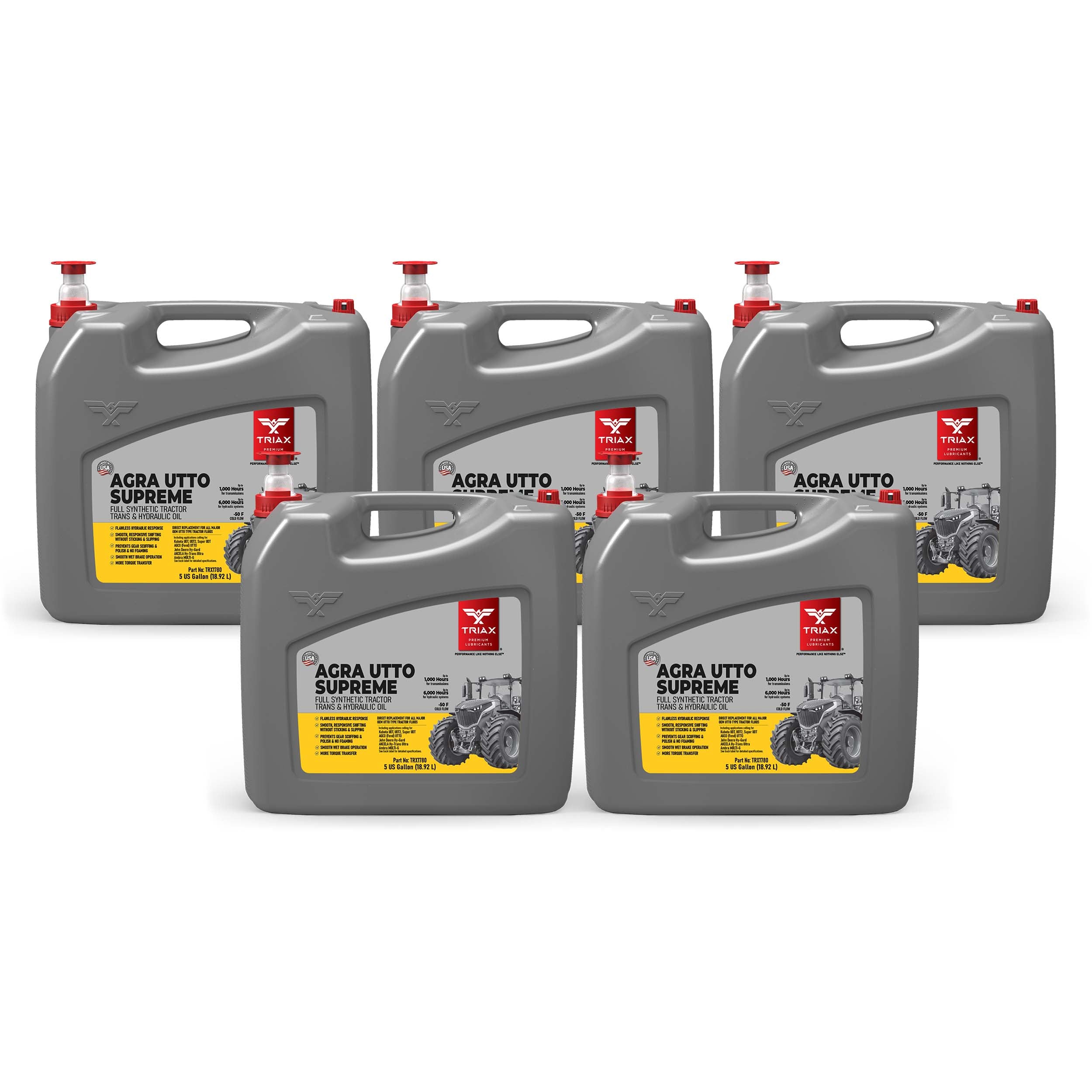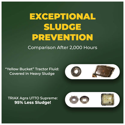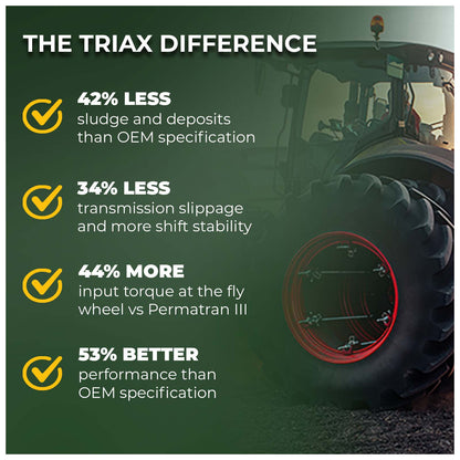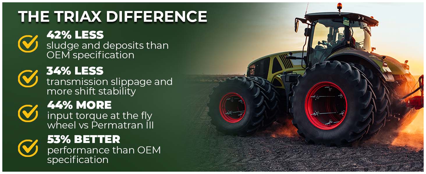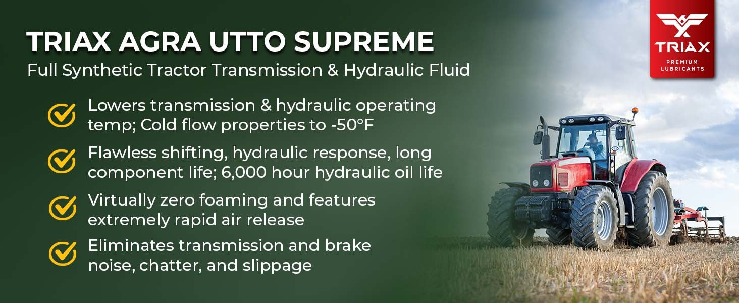 TRIAX Agra UTTO Supreme is a full synthetic, multi-functional API GL-4 tractor fluid designed for a wide range of agricultural applications that require a true Universal Tractor Transmission Oil (UTTO). This all-season, ultra-high-performance fluid is specifically formulated for agricultural and construction equipment, providing optimal performance in hydrostatic transmissions, wet brakes, and hydraulic systems. With a high viscosity index, it remains effective in temperatures as low as -47°C (-52°F), ensuring excellent thermal transfer and lubrication even in high ambient temperatures. Its full synthetic formulation guarantees consistent operation and stability in high-load, high-torque applications.