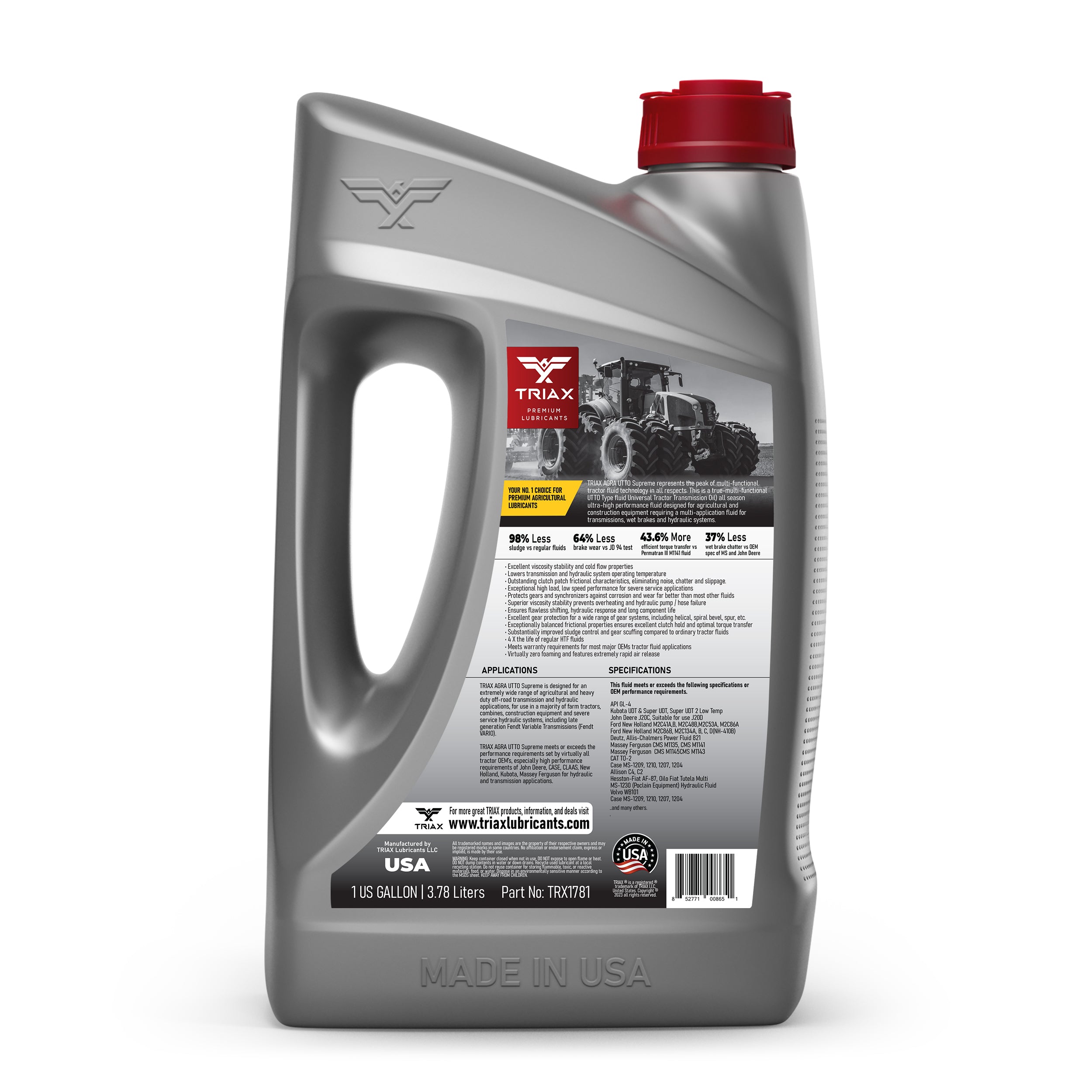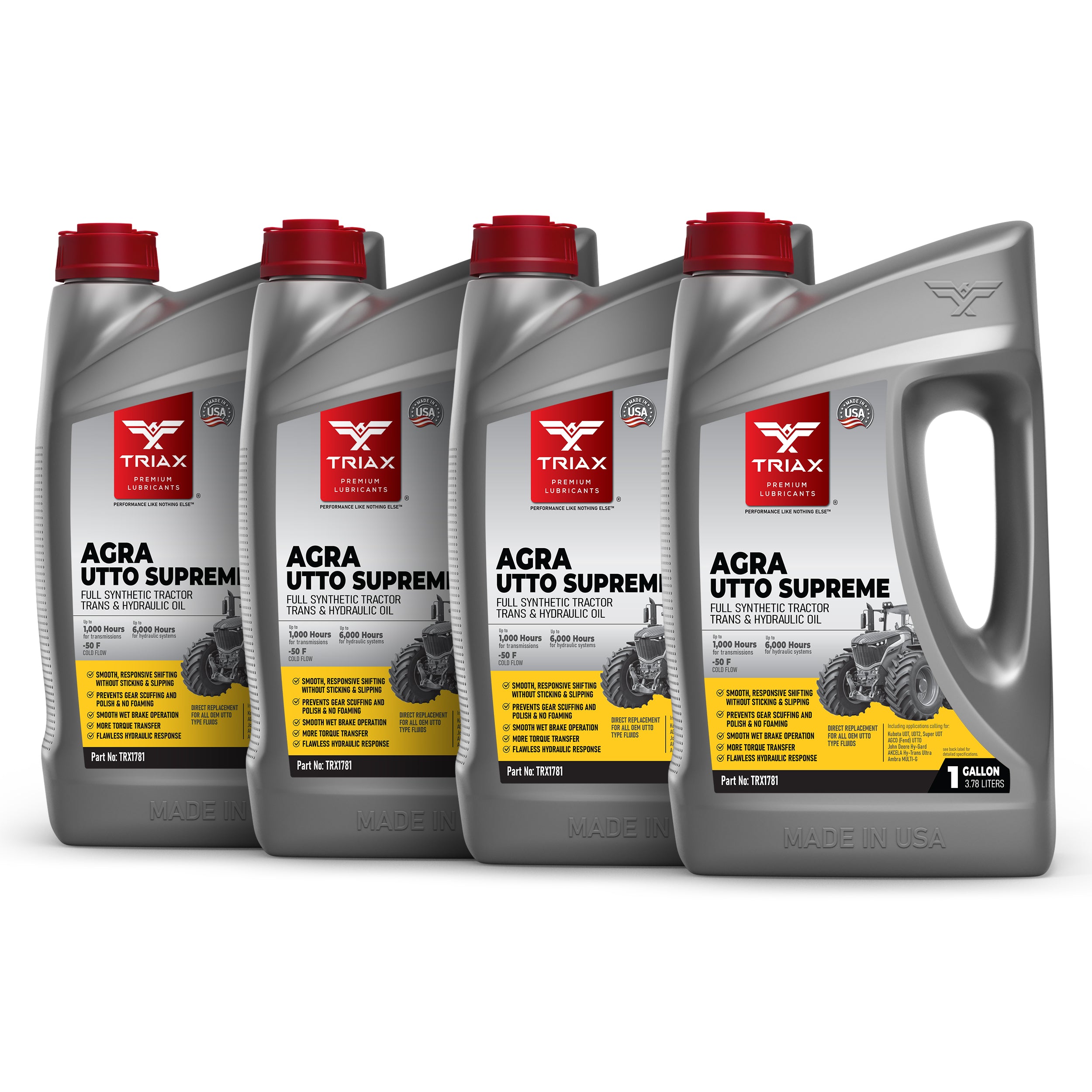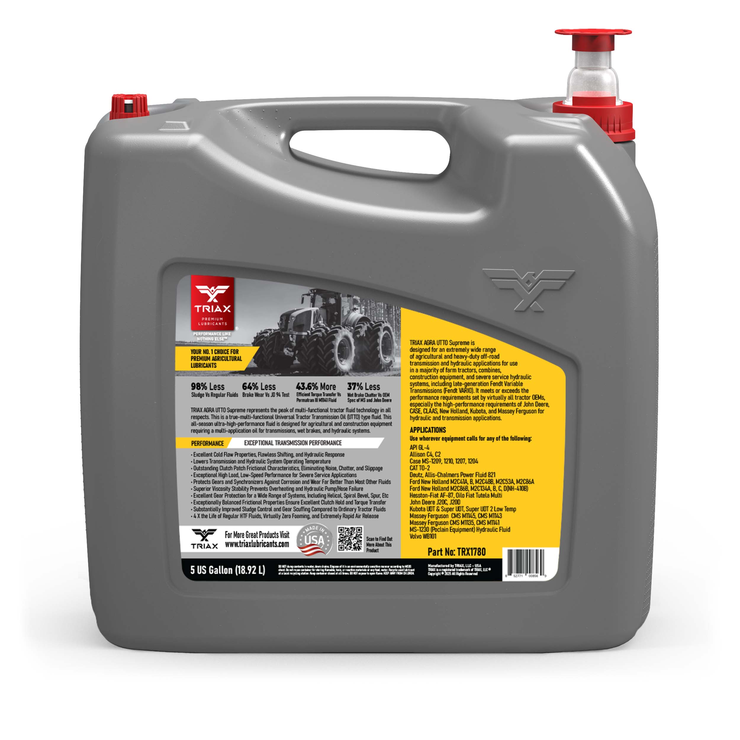 TRIAX Agra UTTO Supreme is a full synthetic, multi-functional API GL-4 tractor fluid designed for a wide range of agricultural applications that require a true Universal Tractor Transmission Oil (UTTO). This all-season, ultra-high-performance fluid is specifically formulated for agricultural and construction equipment, providing optimal performance in hydrostatic transmissions, wet brakes, and hydraulic systems. With a high viscosity index, it remains effective in temperatures as low as -47°C (-52°F), ensuring excellent thermal transfer and lubrication even in high ambient temperatures. Its full synthetic formulation guarantees consistent operation and stability in high-load, high-torque applications.