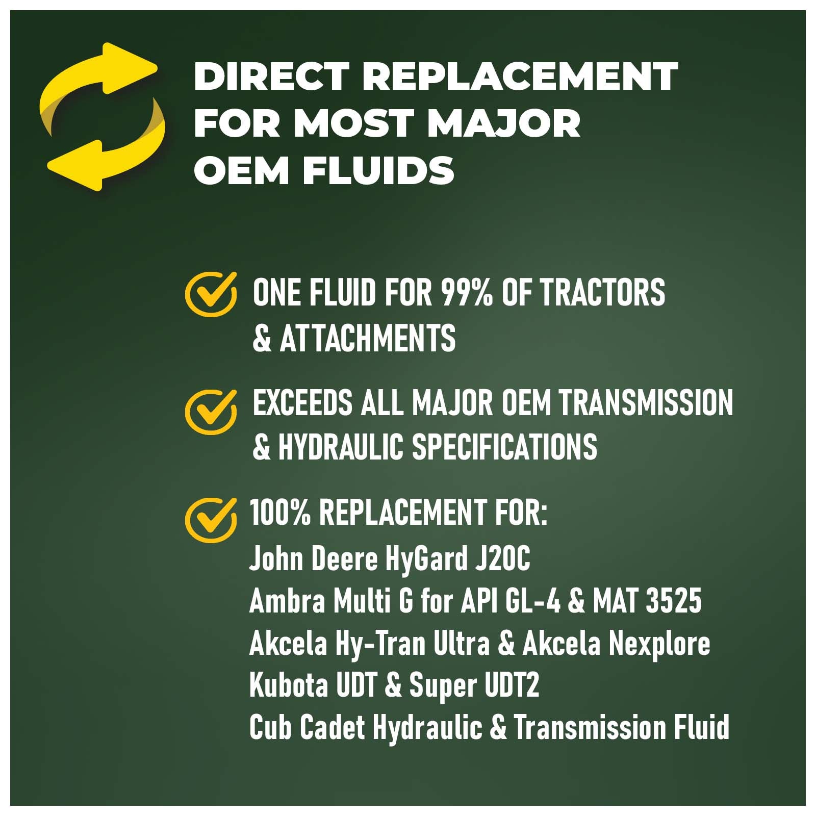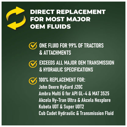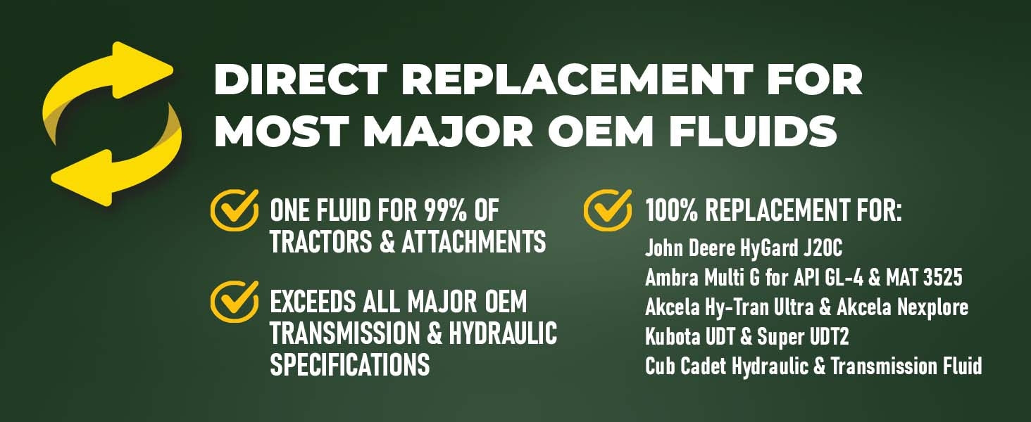 - VERSATILE APPLICATIONS - ALL OEM COMPLIANT: Engineered for use in transmissions, final drives, wet brakes, differentials, and hydraulic systems in a huge range of farming and construction equipment of all makes and models; You can use only this fluid for all your equipment, regardless of make, model, or year