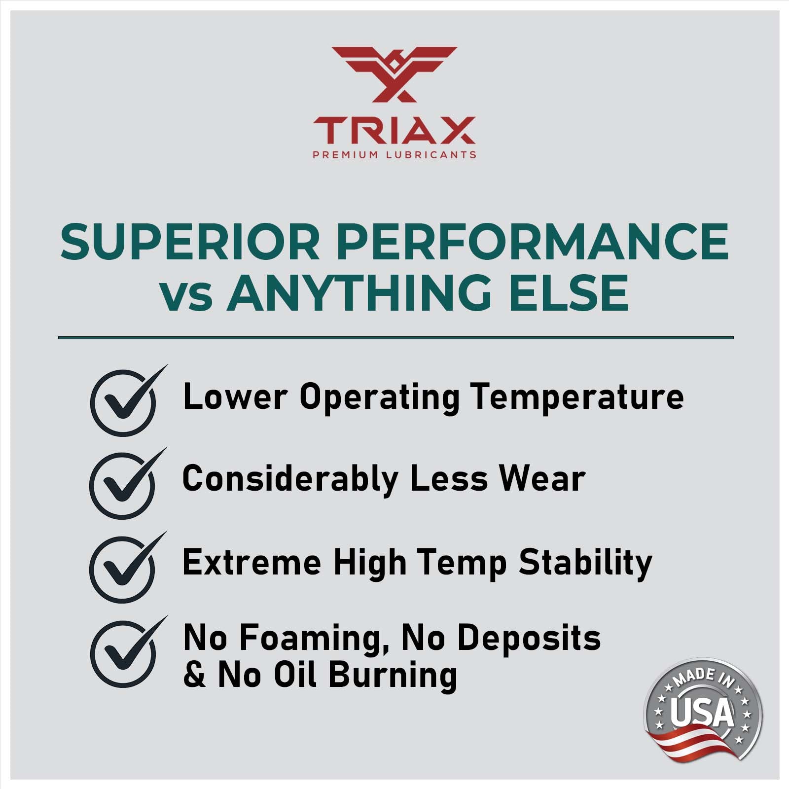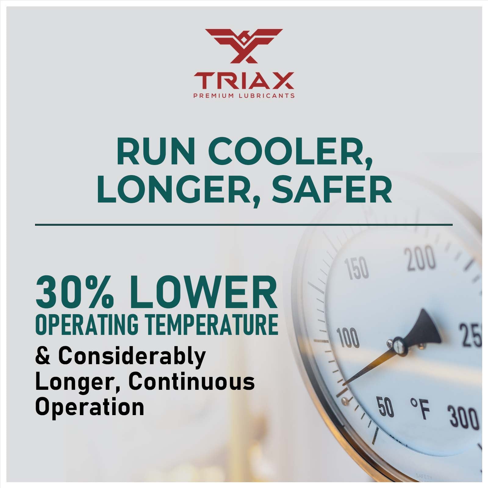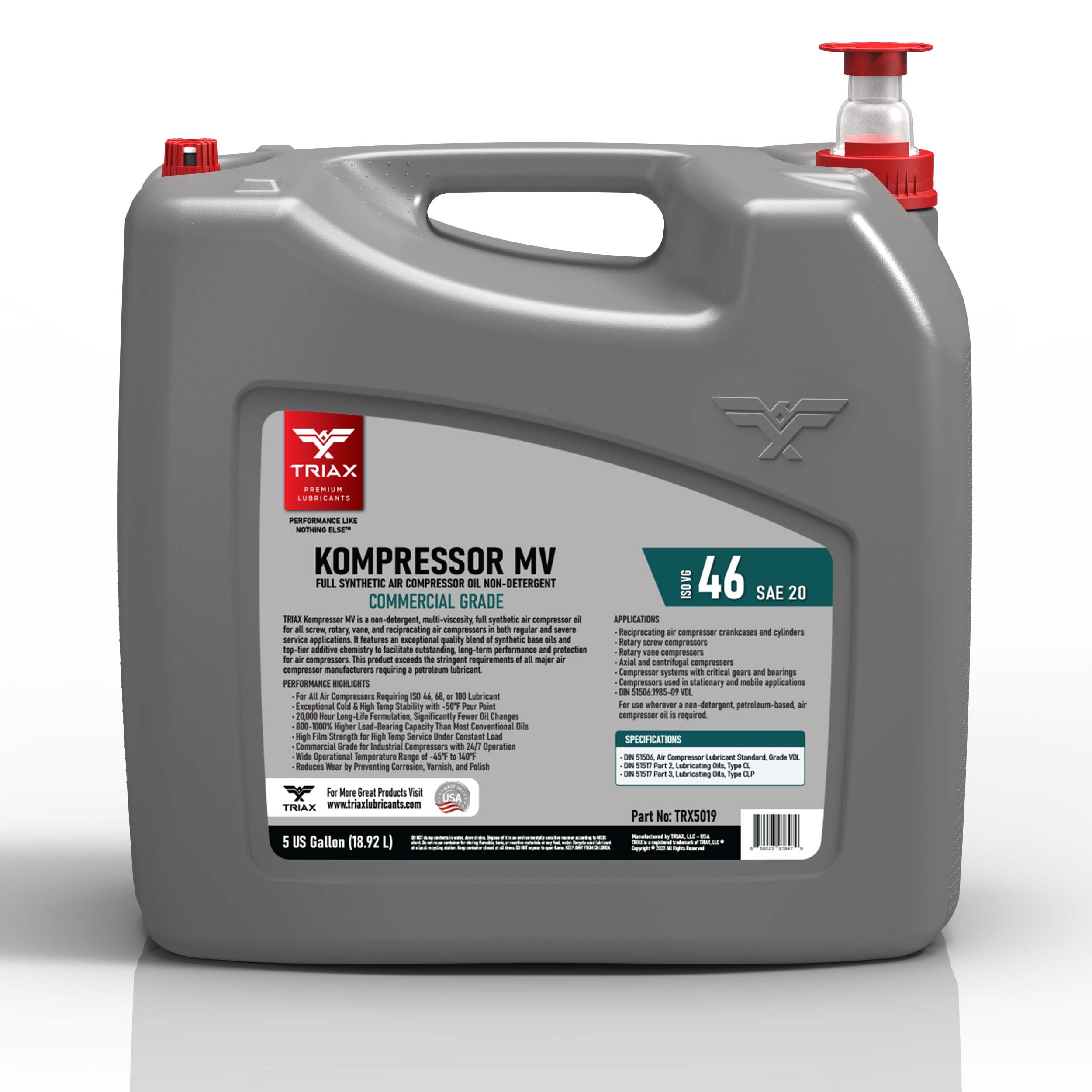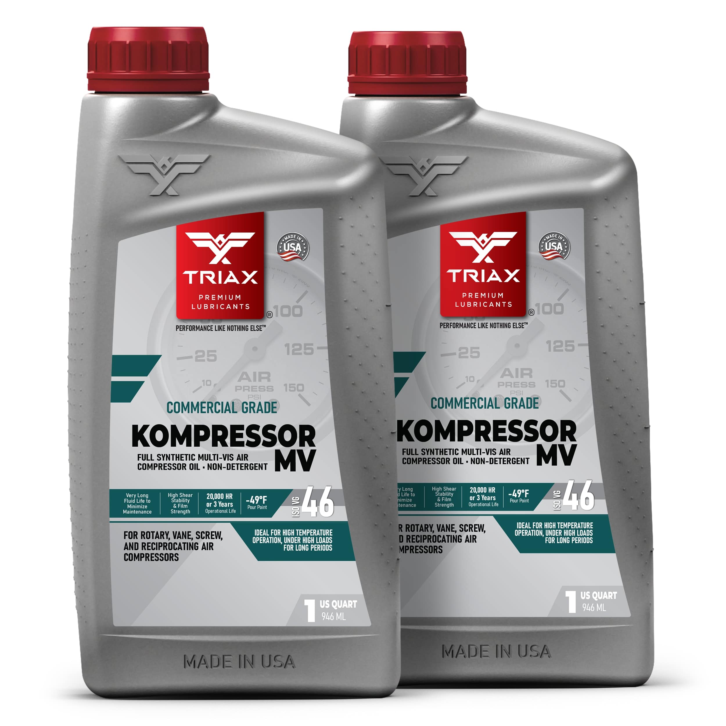 TRIAX KOMPRESSOR MV is a non-detergent, multi-viscosity, full synthetic air compressor oil for all screw, rotary, vane and reciprocating air compressors in both regular and severe service applications. This product features an exceptional quality blend of synthetic base oils and top tier additive chemistry to facilitate outstanding, long term performance and protection for air compressors.