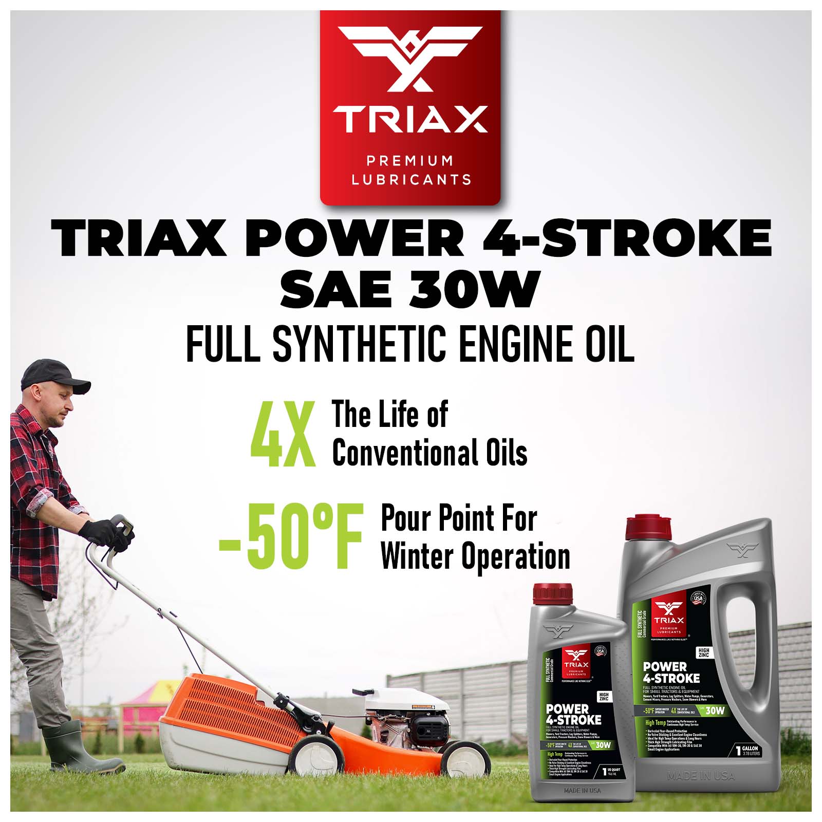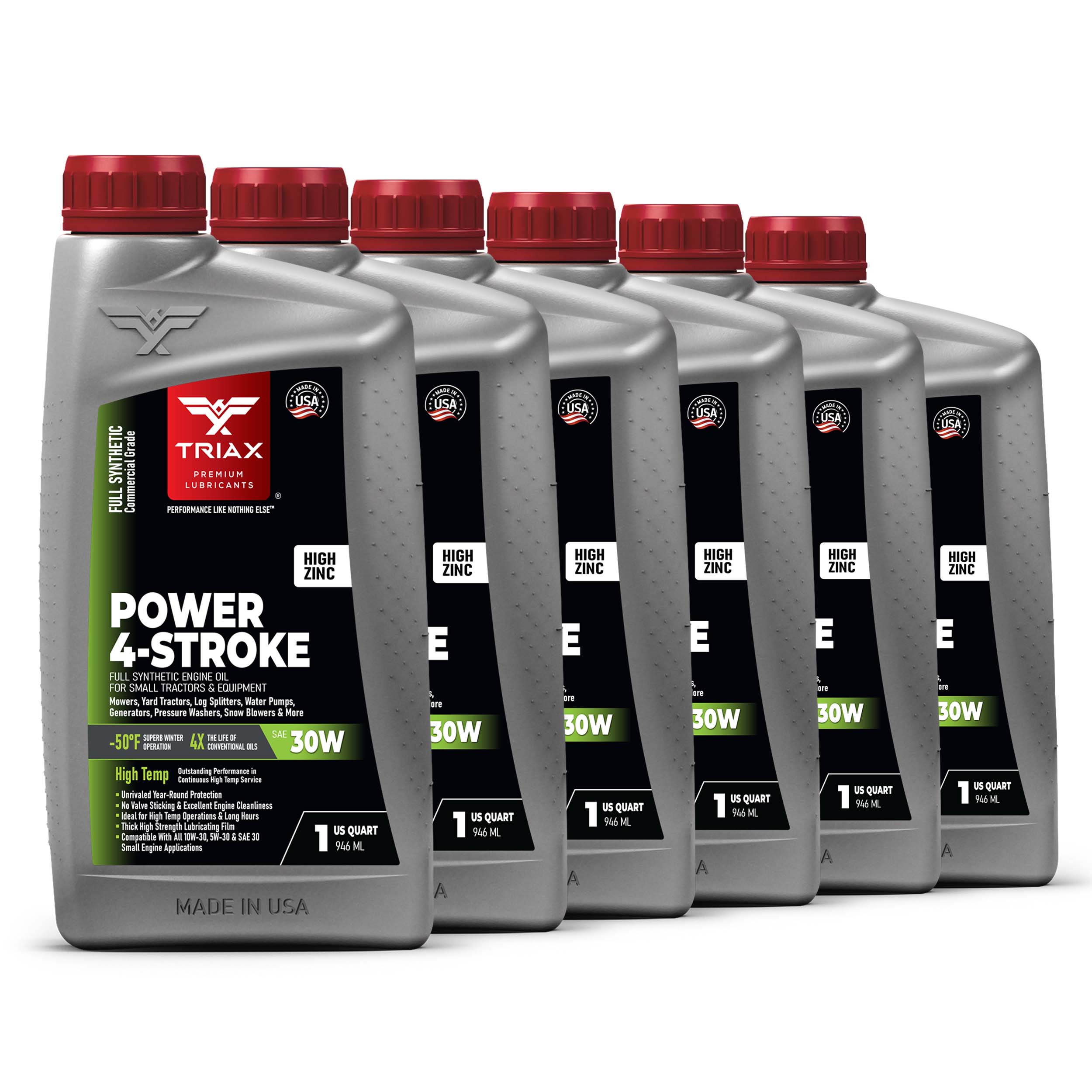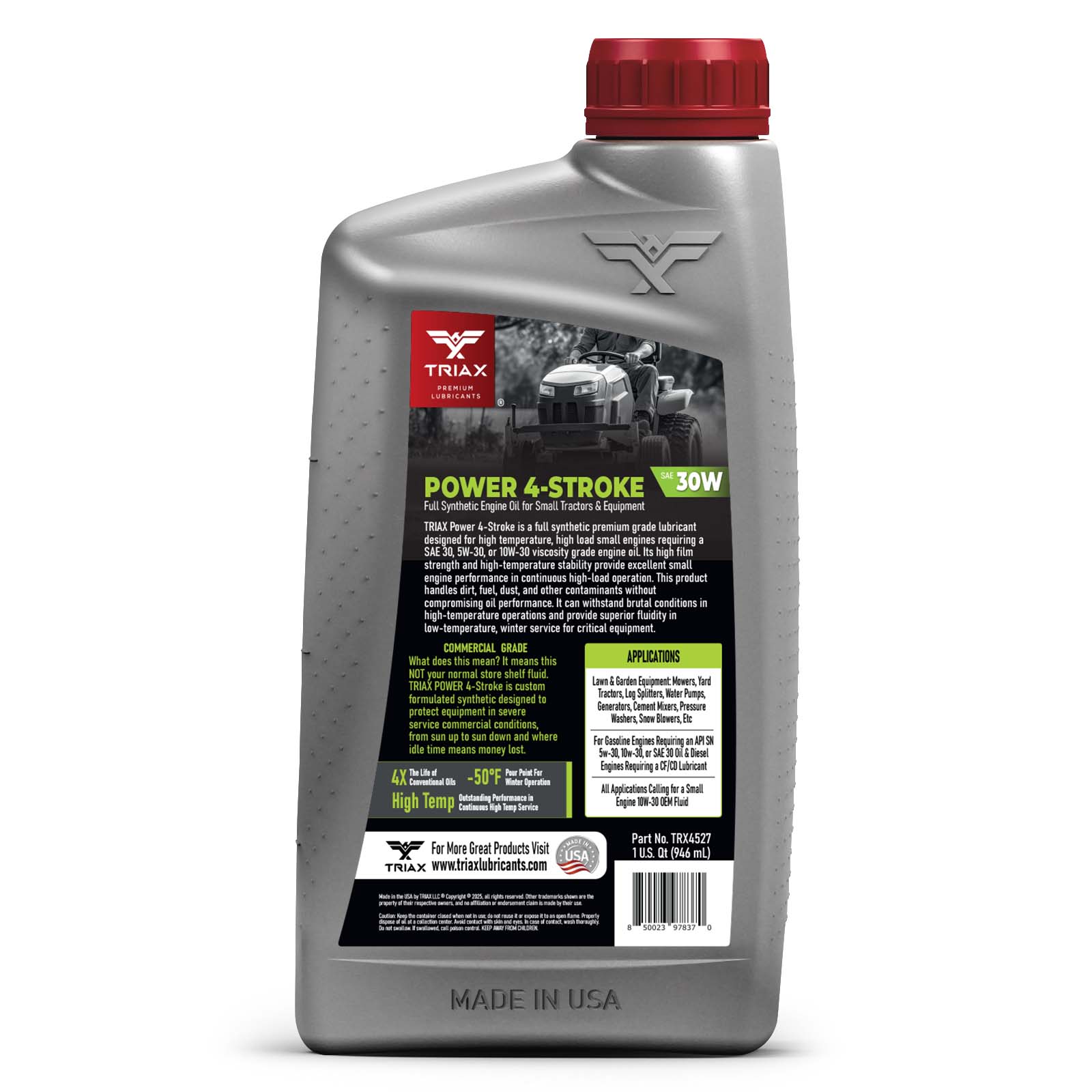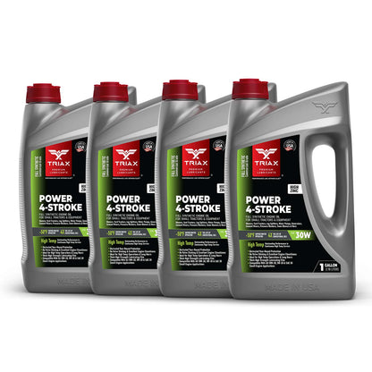 TRIAX Power 4-Stroke 30W has a full synthetic, high zinc formulation with three times the life of conventional 4 Stroke OEM Oils. It is ideal for contractors requiring long equipment life, infrequent oil changes, and high equipment use. It has a wide application range to be used with compressors, ride-on mowers, small tractors, pressure washers, generators, and any equipment requiring a SAE 30 or 30W motor oil. It is a true all-season oil, It features PAO / synthetic base oils with -50°F pour point for use in arctic conditions in addition to outstanding high temp stability. Its high thermal resistance means it will not lose viscosity in continuous use, high-temperature conditions of 120°F + ambient temperatures. It contains a state of the art detergent pack for pristine equipment cleanliness and parts longevity.