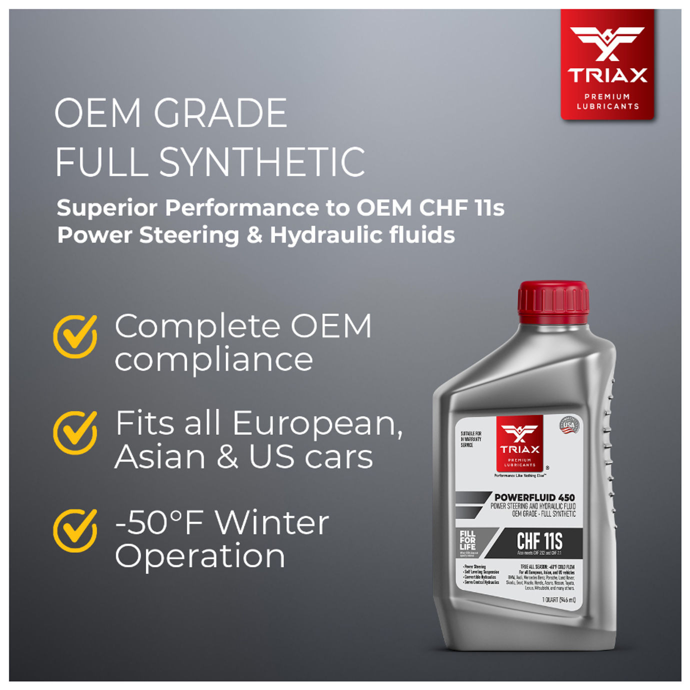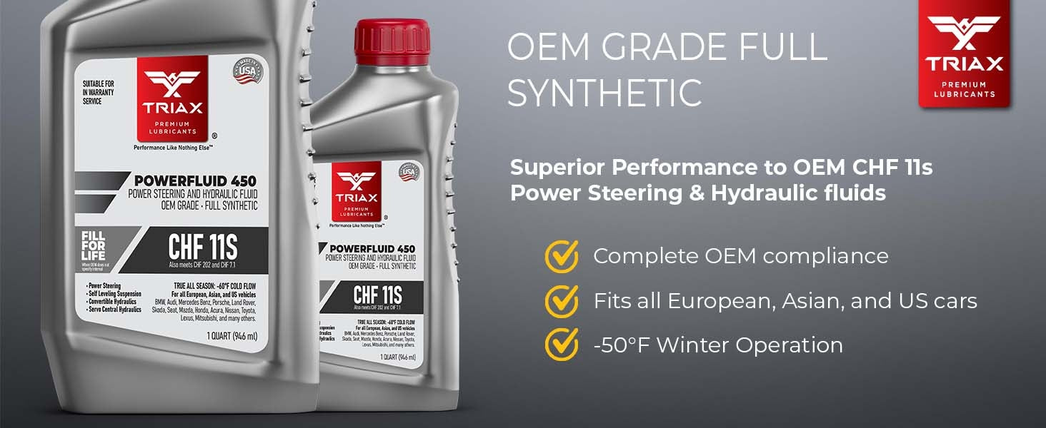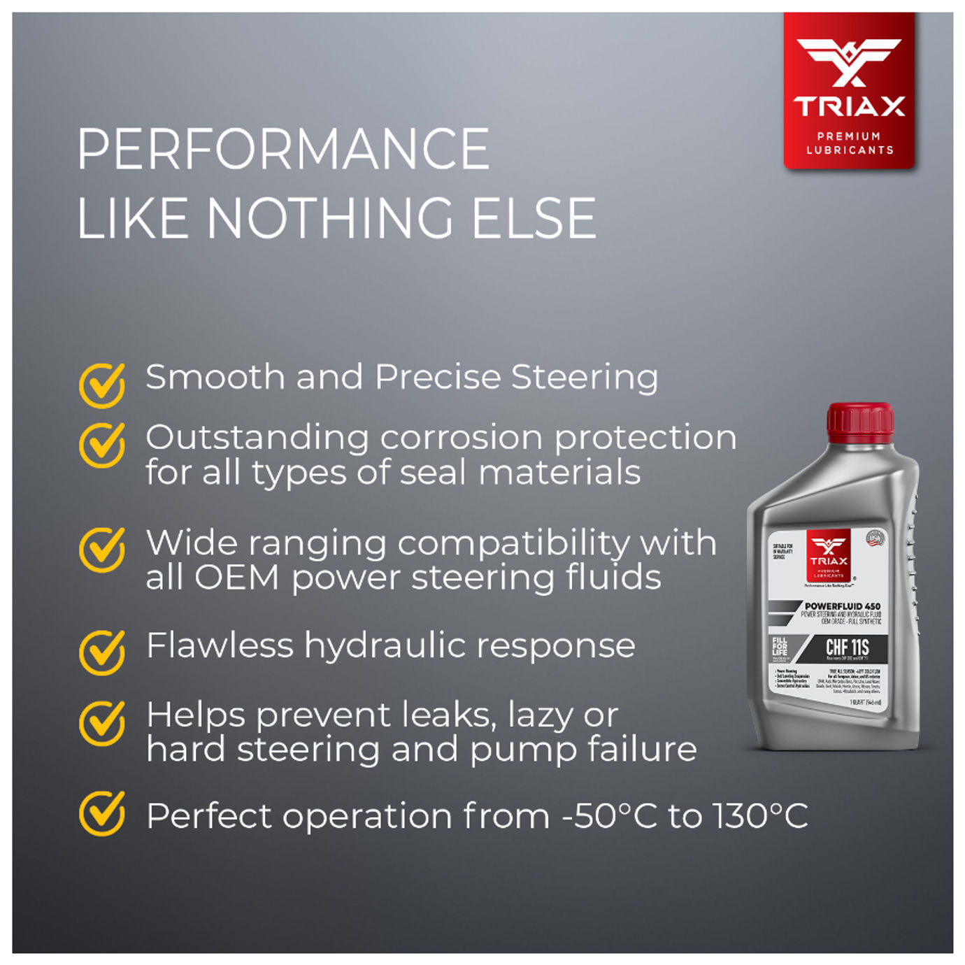 TRIAX Powerfluid 450 is an OEM grade full synthetic, PAO/ester blended fluid designed for modern vehicle power steering fluids, hydraulic suspensions, self leveling suspensions as well as multiple other applications in modern vehicle hydraulic systems. This product is manufactured to provide outstanding hydraulic response, excellent low temperature performance, wide ranging seal protection, and lifetime fill oxidation stability and complete OEM specification coverage.