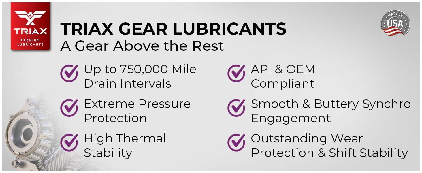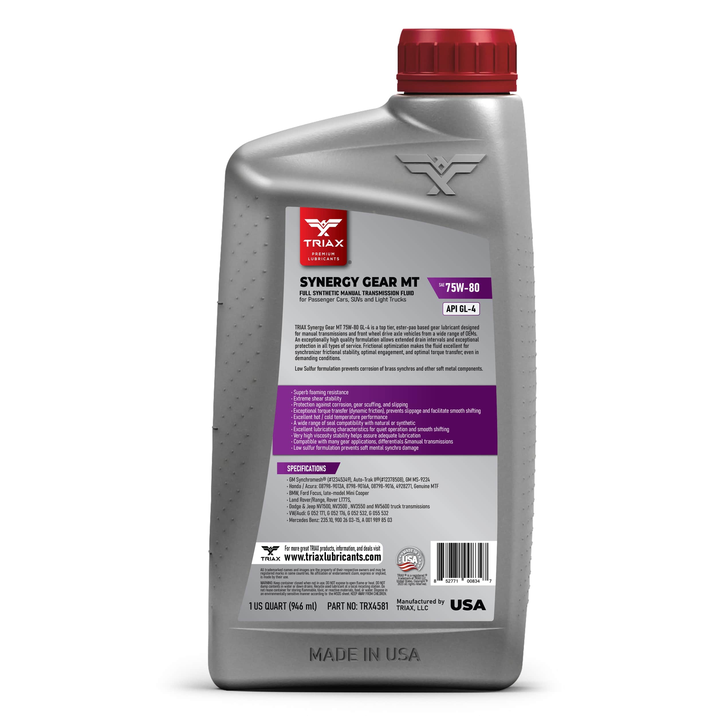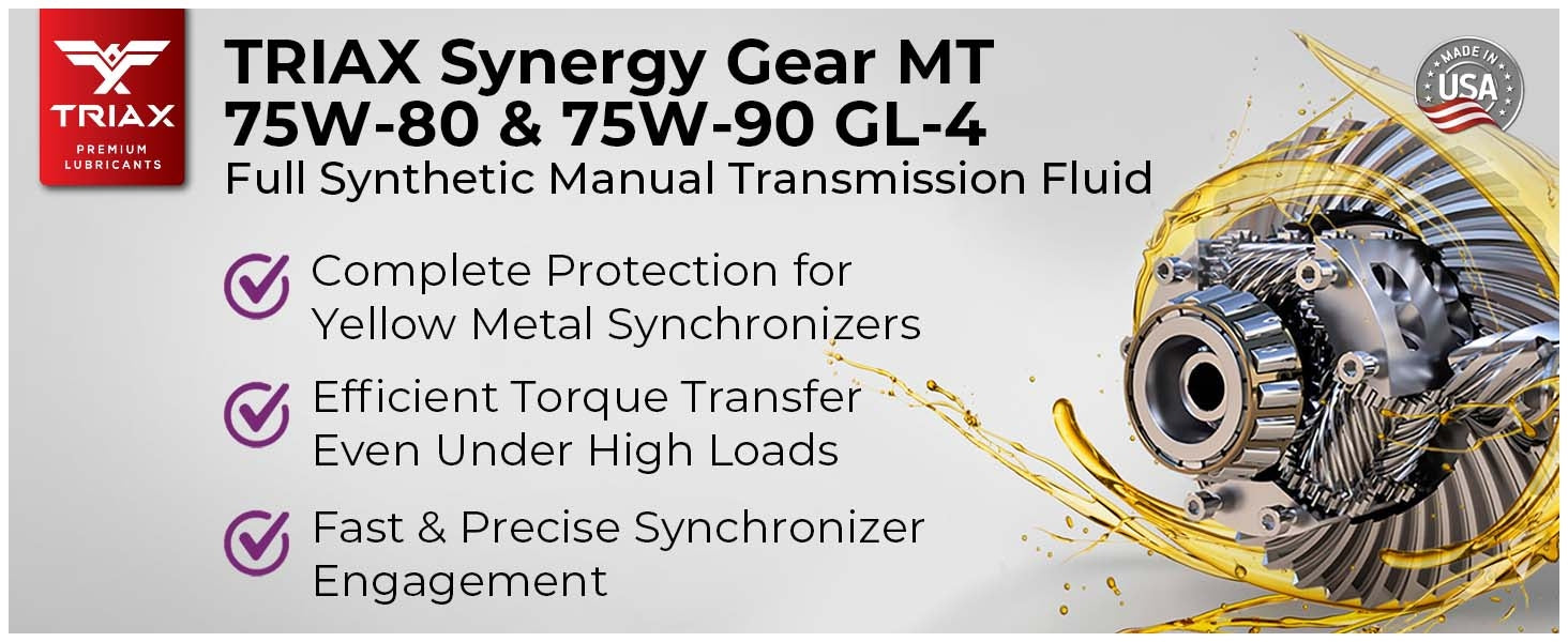 TRIAX Synergy Gear MT 75W-80 GL-4 is a full synthetic, long drain, manual transmission and gear lubricant. It is optimally balanced for improved friction control, wear reduction, thermal stability, shear stability, rust and corrosion inhibition, and seal protection. Exceeds specification requirements for a wide range of manual transmissions. with It provides excellent yellow metal protection for brass synchros and exceptional frictional stability, permitting rapid transmission response, fast & smooth shifting, with no notchy hesitations or slipping.