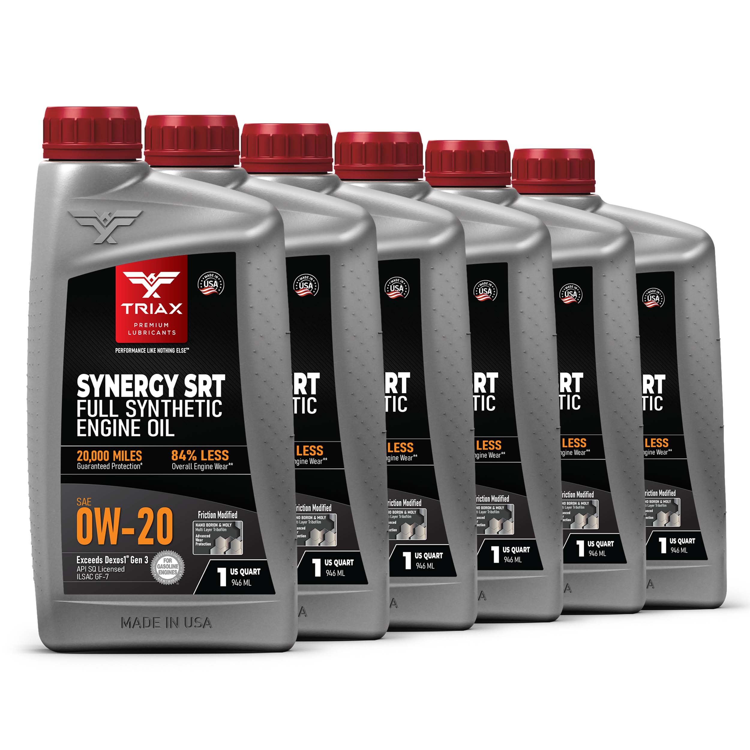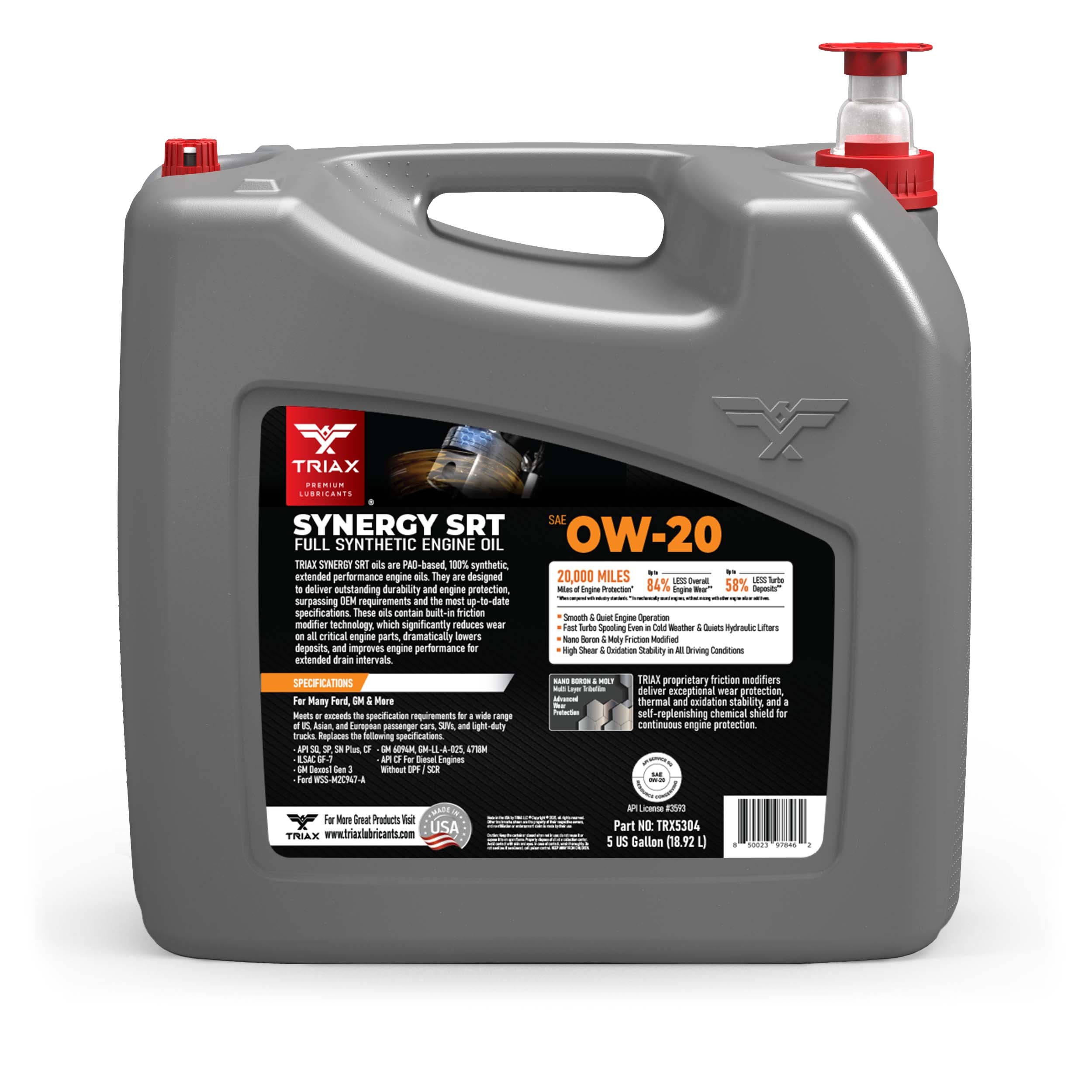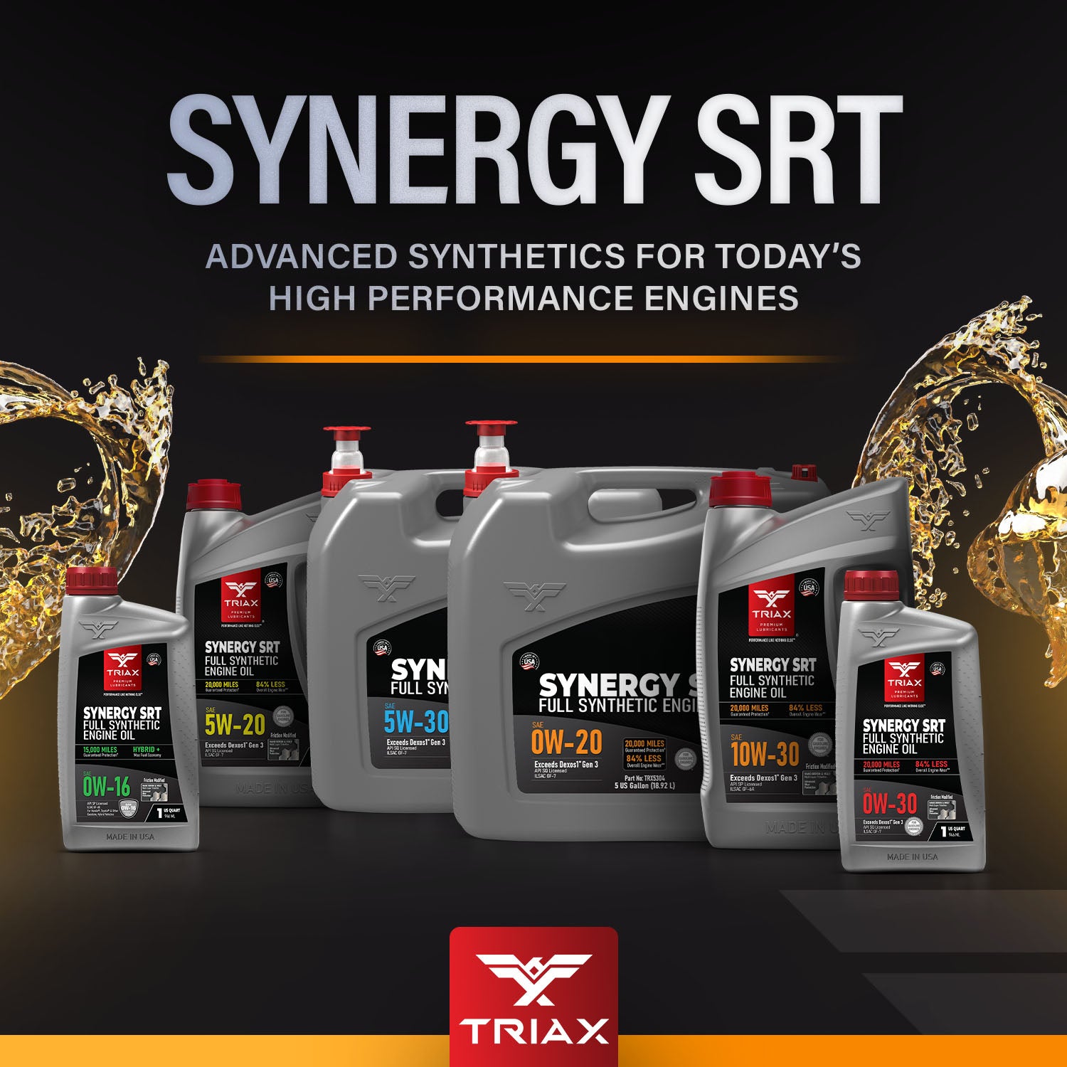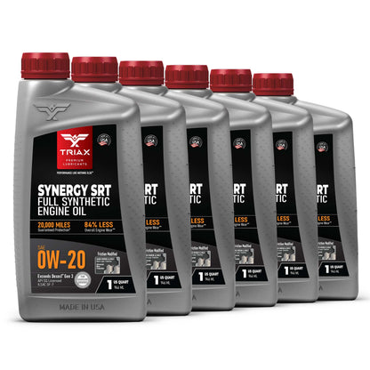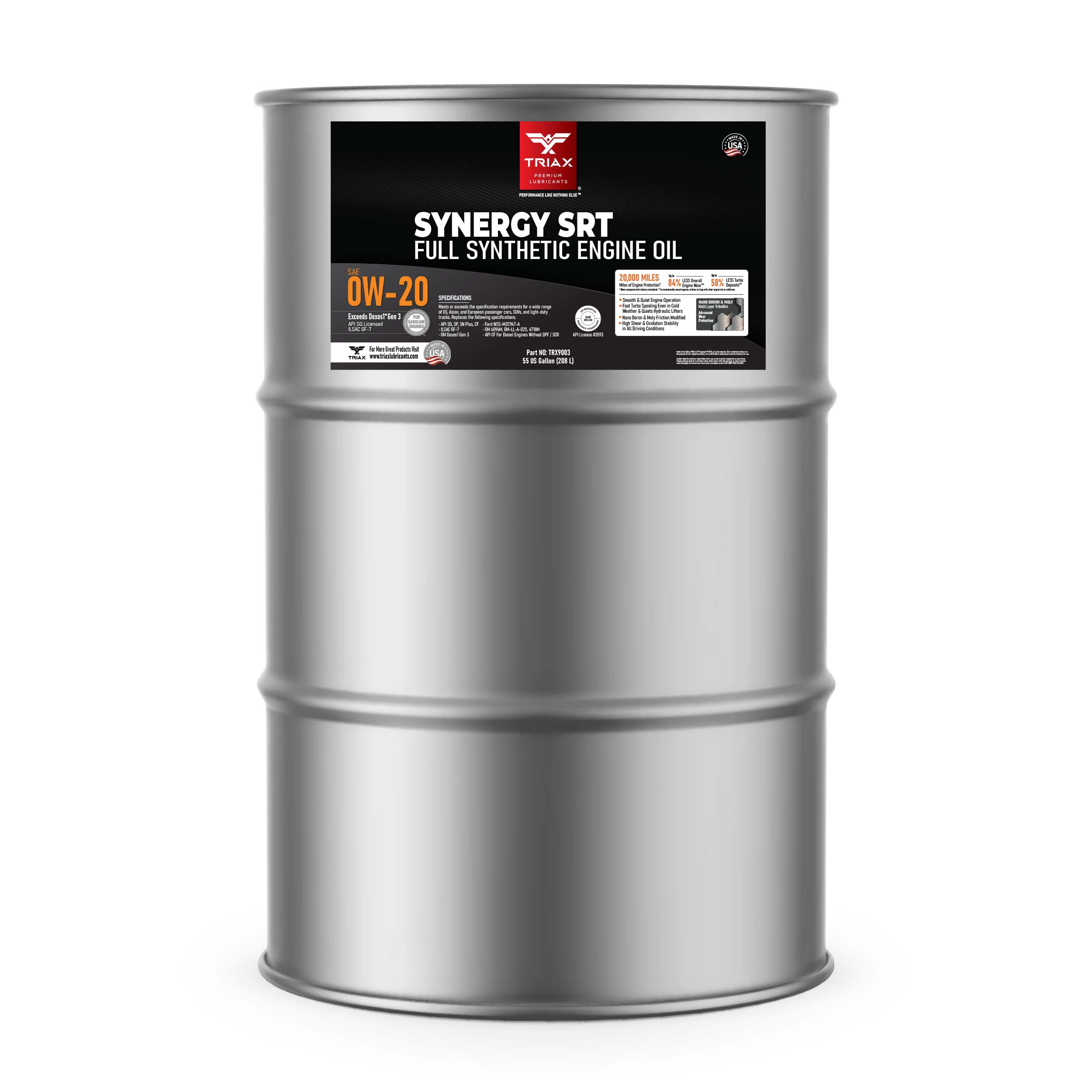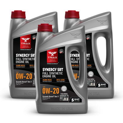 TRIAX Synergy SRT engine oils are full synthetic, friction modified, state-of-the-art, engine oils, designed maximize wear protection and engine longevity. These oils are engineered with a lower friction coefficient than most other lubricants and are tailored to exceed the highest expectations from professional mechanics and consumers alike. They are fully formulated and exceed API and OEM standards, such as Ford, Honda, Chrysler, Jeep, Chevy, and General Motors Dexos 1 Gen 3 ®.