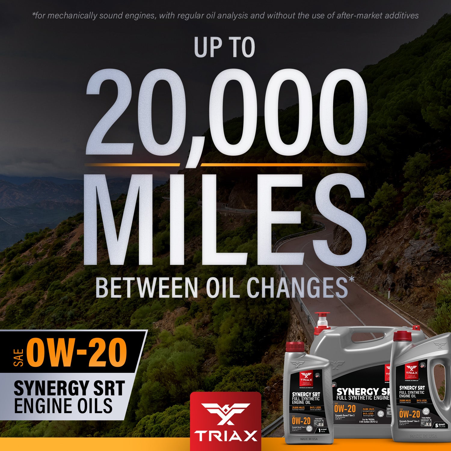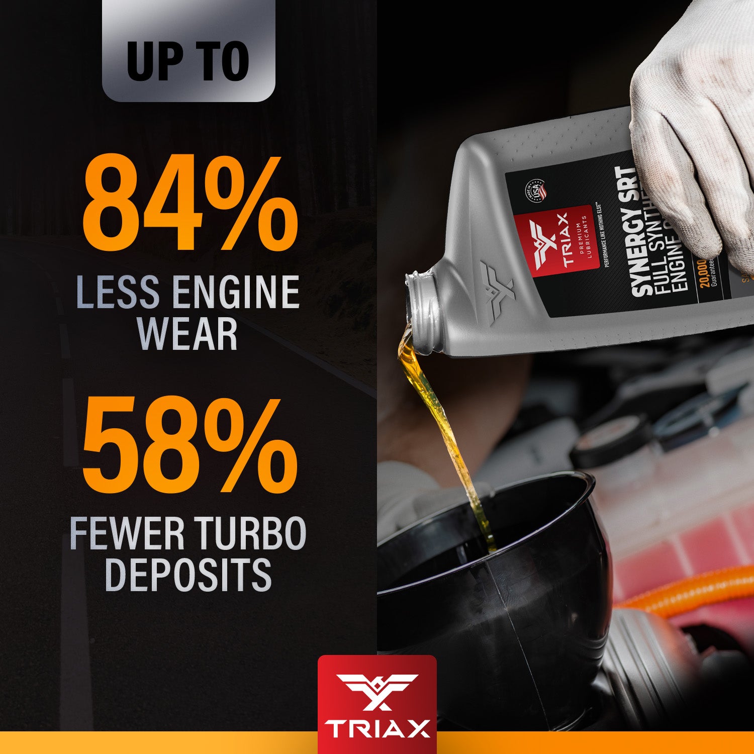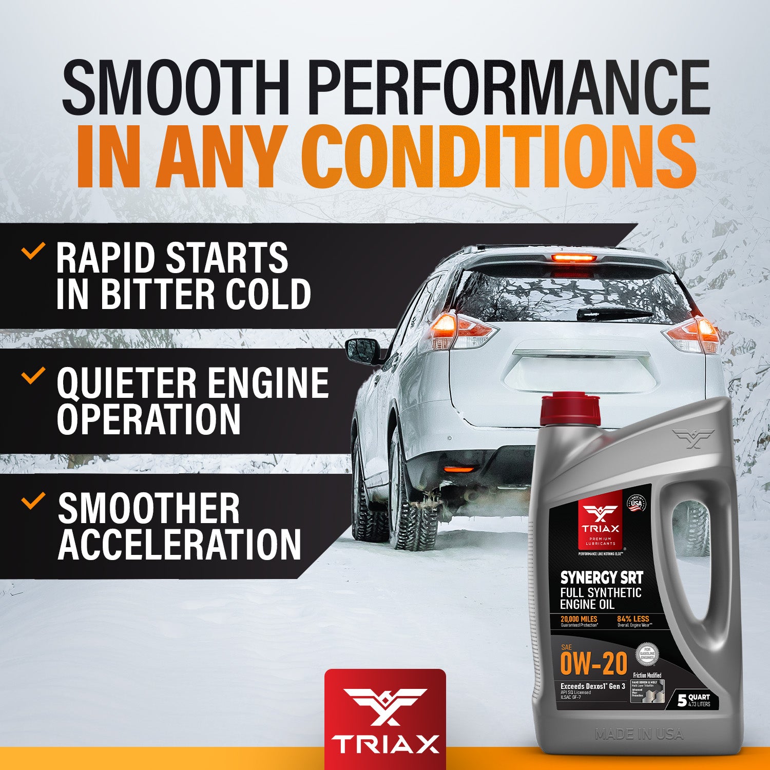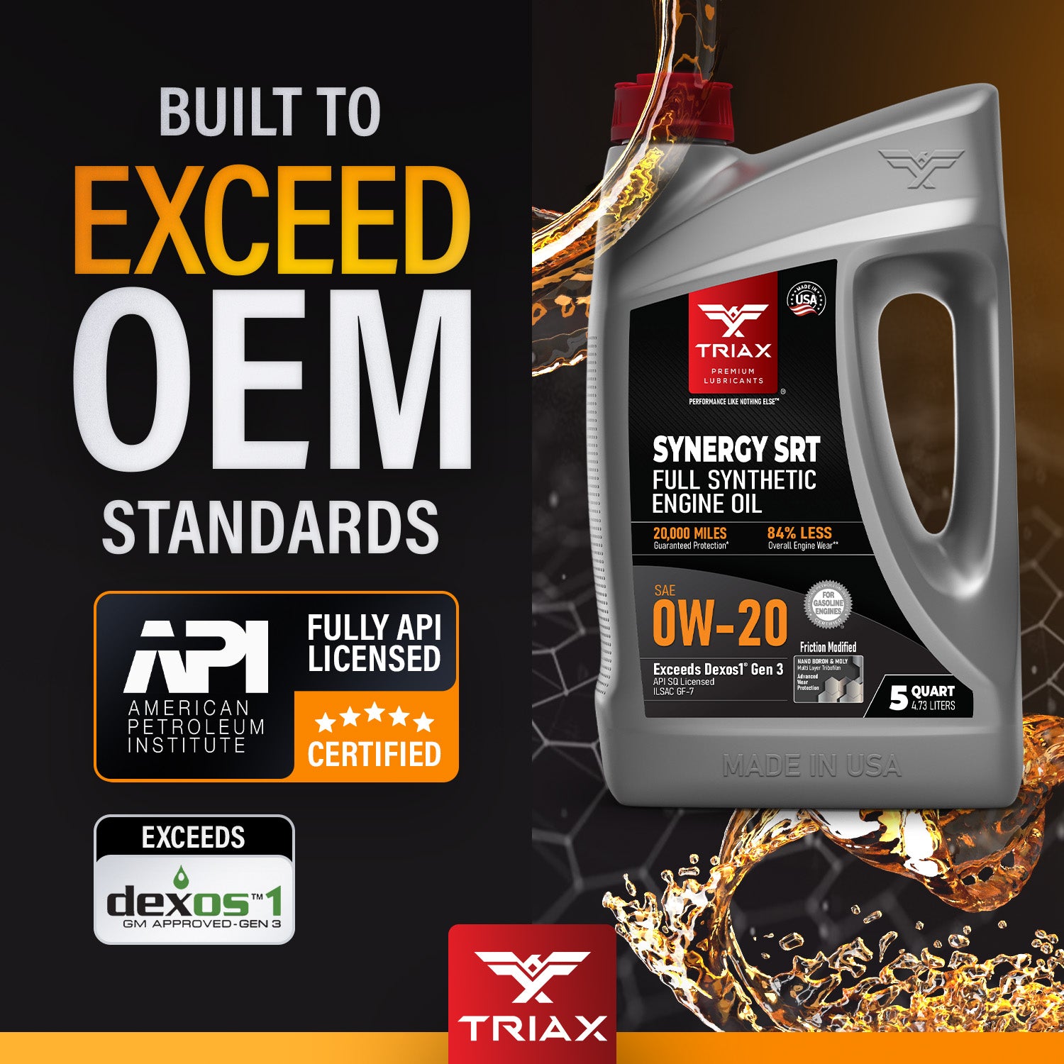 TRIAX Synergy SRT engine oils are full synthetic, friction modified, state-of-the-art, engine oils, designed maximize wear protection and engine longevity. These oils are engineered with a lower friction coefficient than most other lubricants and are tailored to exceed the highest expectations from professional mechanics and consumers alike. They are fully formulated and exceed API and OEM standards, such as Ford, Honda, Chrysler, Jeep, Chevy, and General Motors Dexos 1 Gen 3 ®.