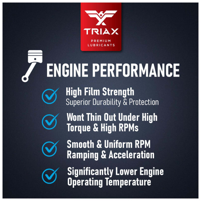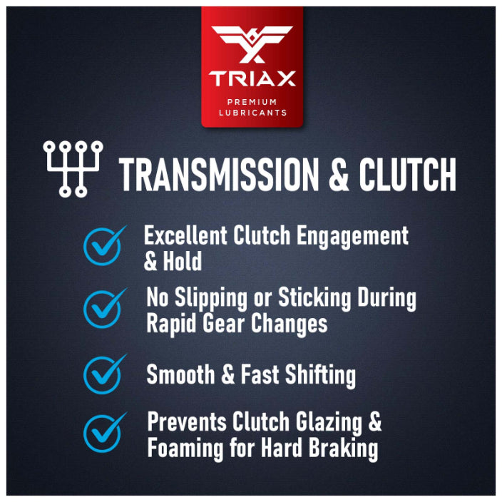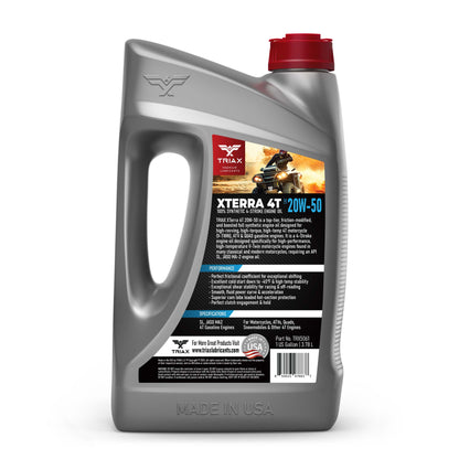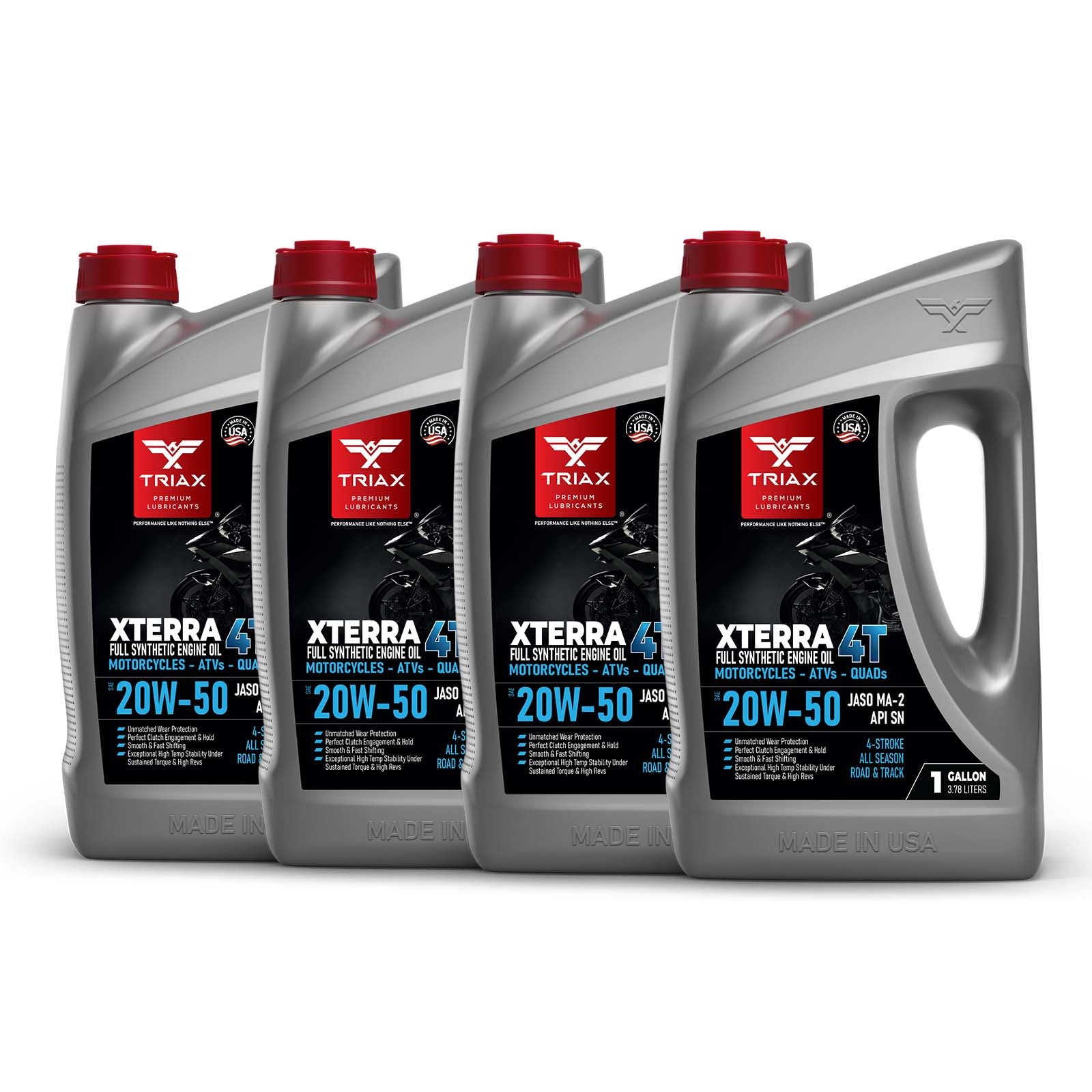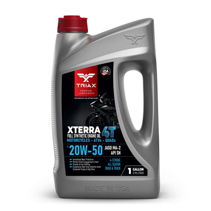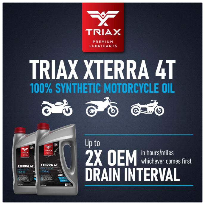 TRIAX XTerra full synthetic, high-performance motorcycle oils are specifically formulated to meet the demands of the small displacement, high RPM, fuel-efficient engines found in today's domestic and foreign motorcycles. Exceeding the requirements specified by JASO MA-2. These oils are 100 % Synthetic premium base oils using special additives that protect against high-temperature oxidation, wear, and viscosity breakdown. It is fortified with detergent-dispersants and rust and corrosion inhibitors to keep engines exceptionally clean and free of sludge, varnish, and rust.