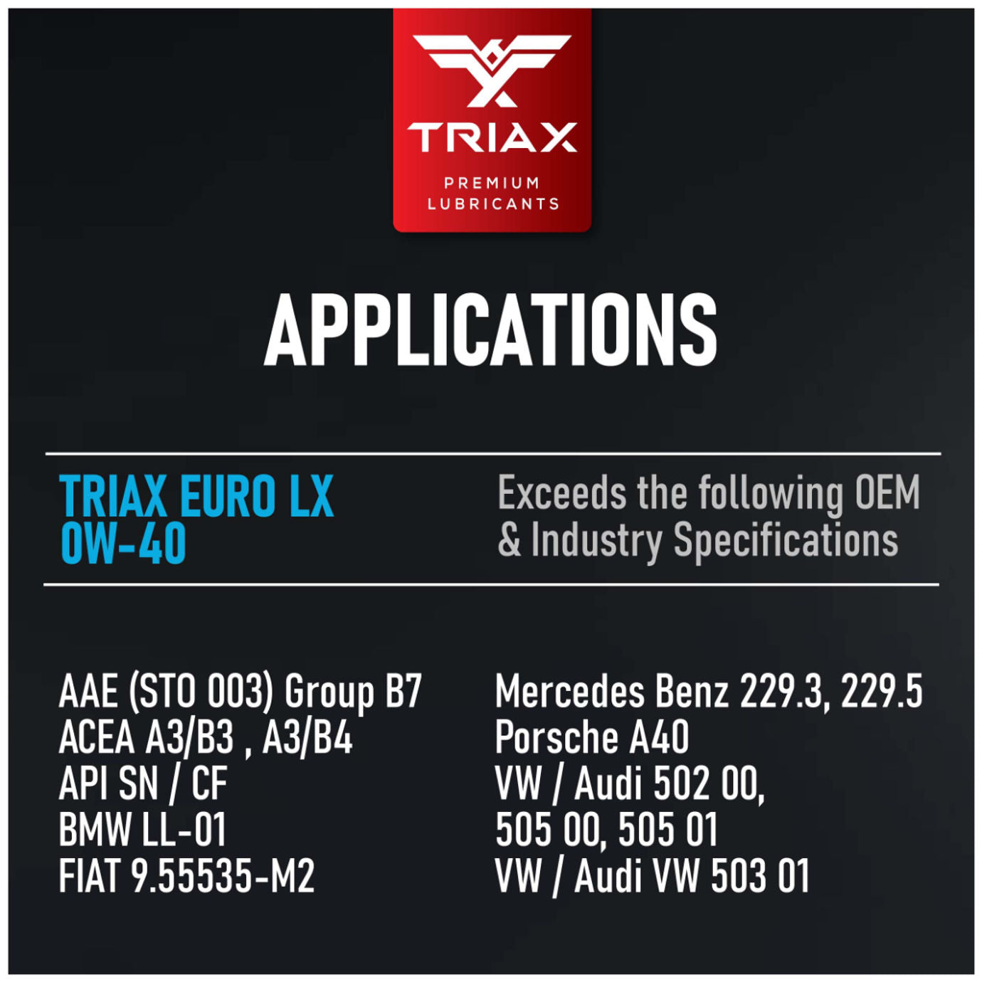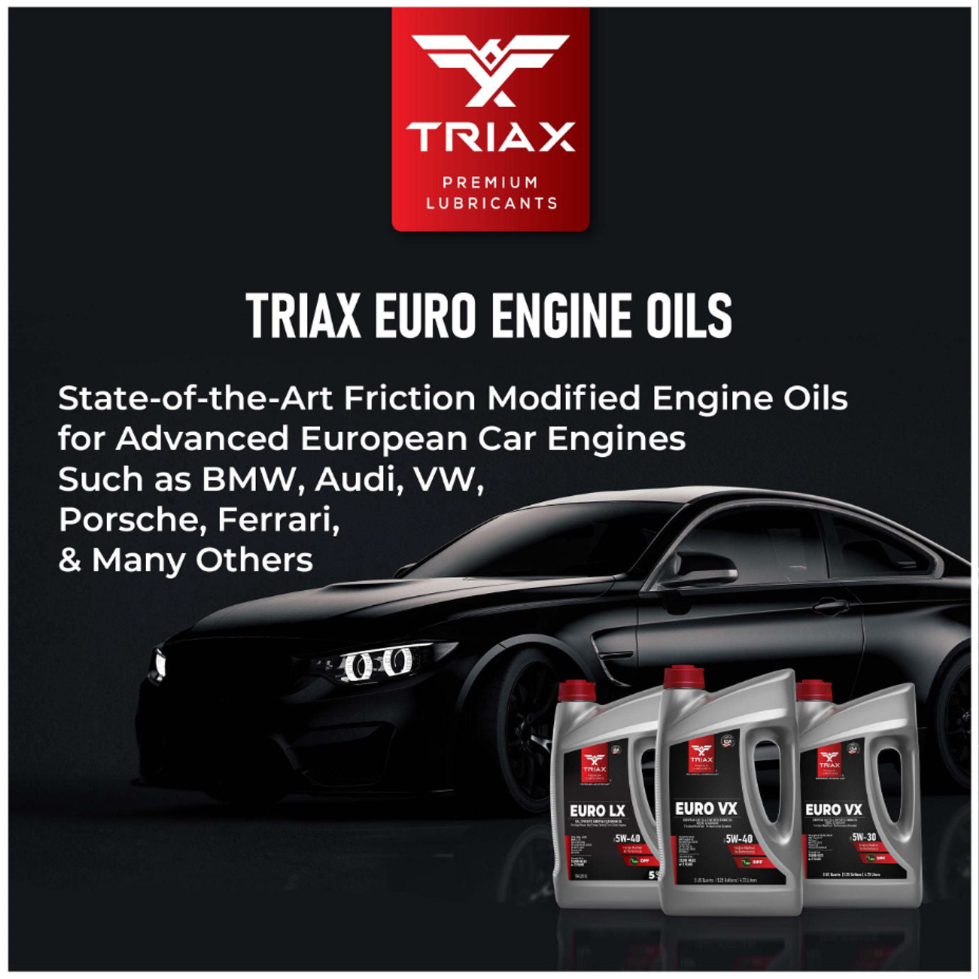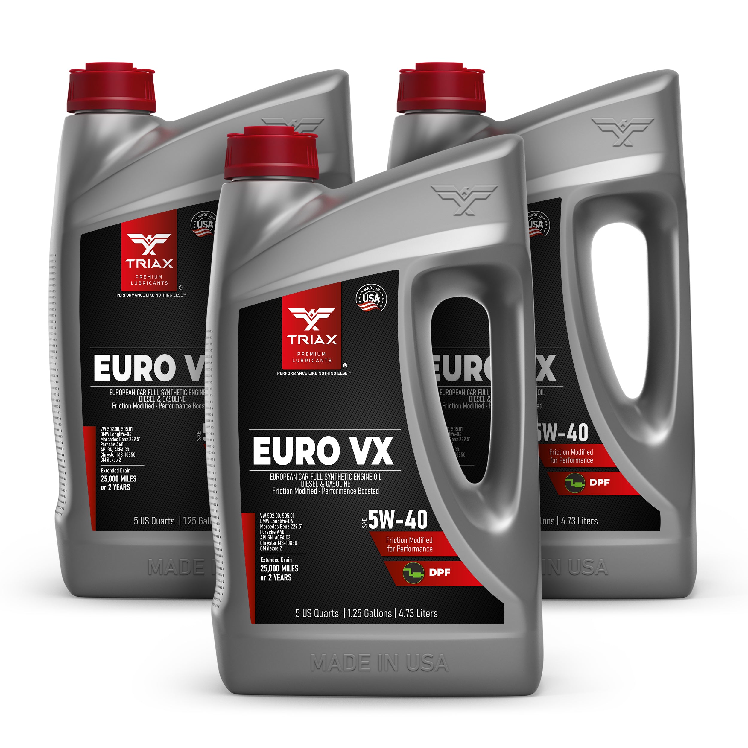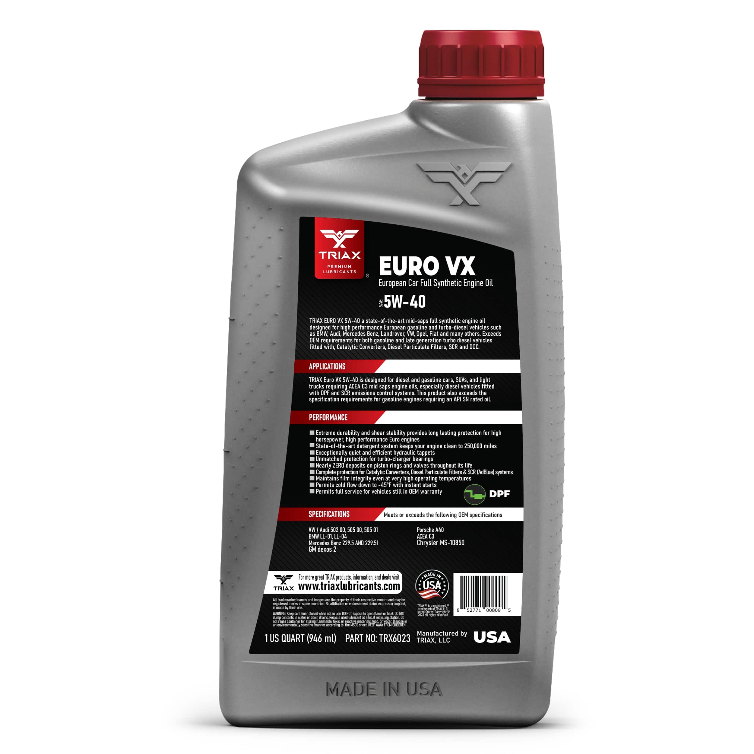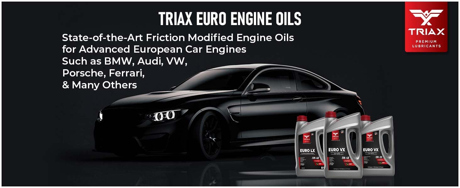 TRIAX Euro VX 5W-40 is a state-of-the-art top tier PAO / Easter full synthetic Low SAPS, low ash engine oil designed for European gasoline and diesel vehicles, especially those fitted with Diesel Particulate Filters. This product provides a very wide compatibility range with most vehicles requiring a 5W-40 engine oil.